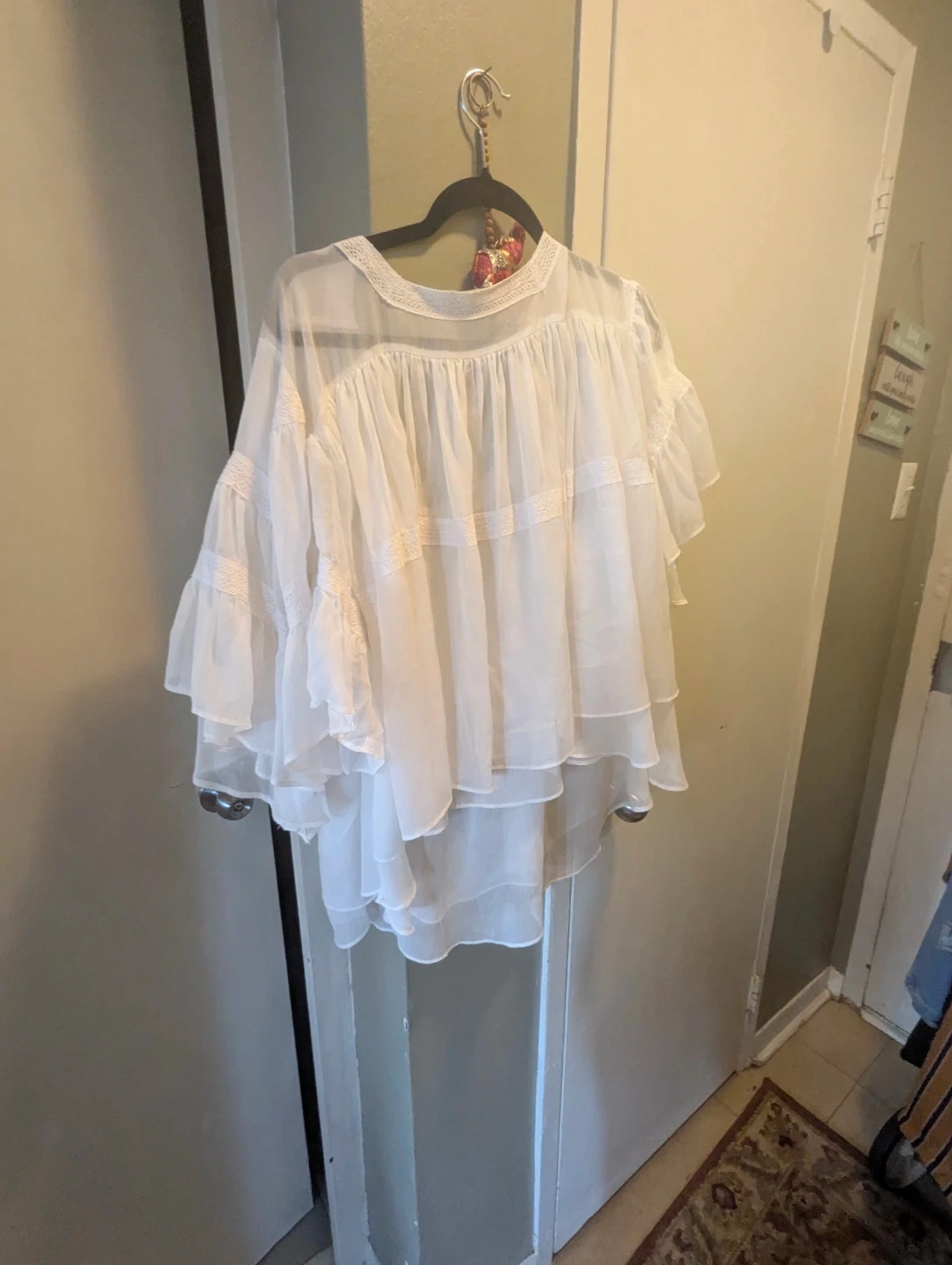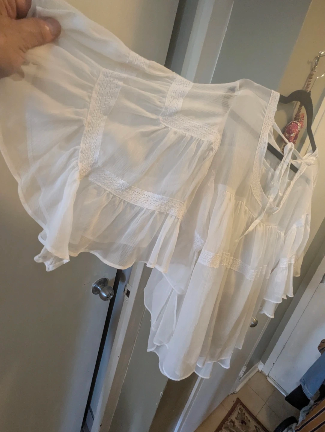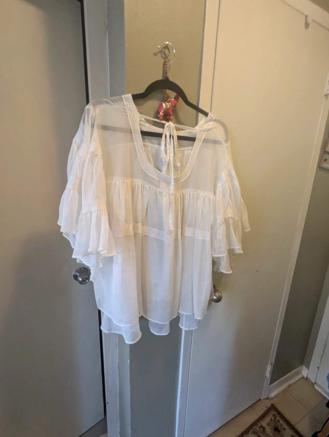 This white sheer blouse has a flowy, boho-style design with ruffled sleeves and lace accents. It features a tie-neck closure. It's made from a lightweight, airy fabric perfect for warmer weather.