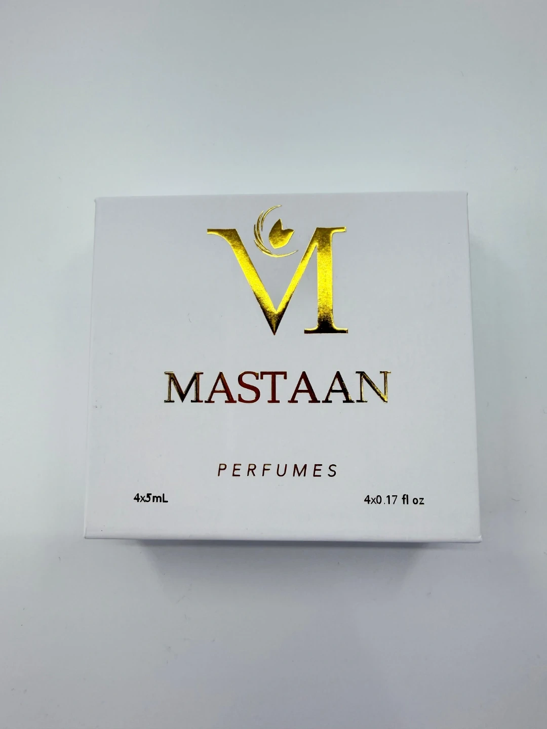This Mastaan discovery set includes four 5mL perfumes: Dark Stone, Cherish, La Royale Femme, and Royal Elixir. Each bottle offers a unique scent experience, perfect for trying out different fragrances before committing to a full size.