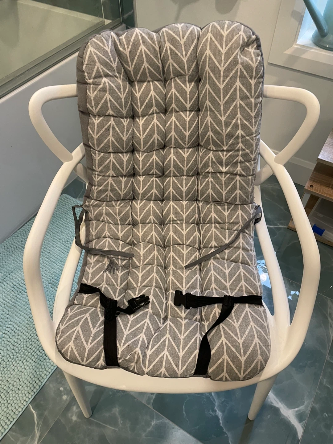 This is a padded chair cushion featuring a grey chevron pattern on one side and solid grey on the other. It includes straps for secure attachment. The cushion offers extra comfort for seating.