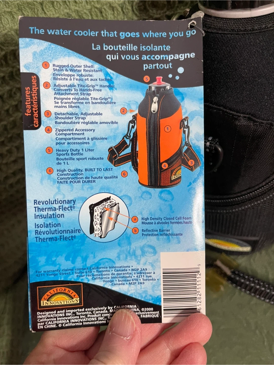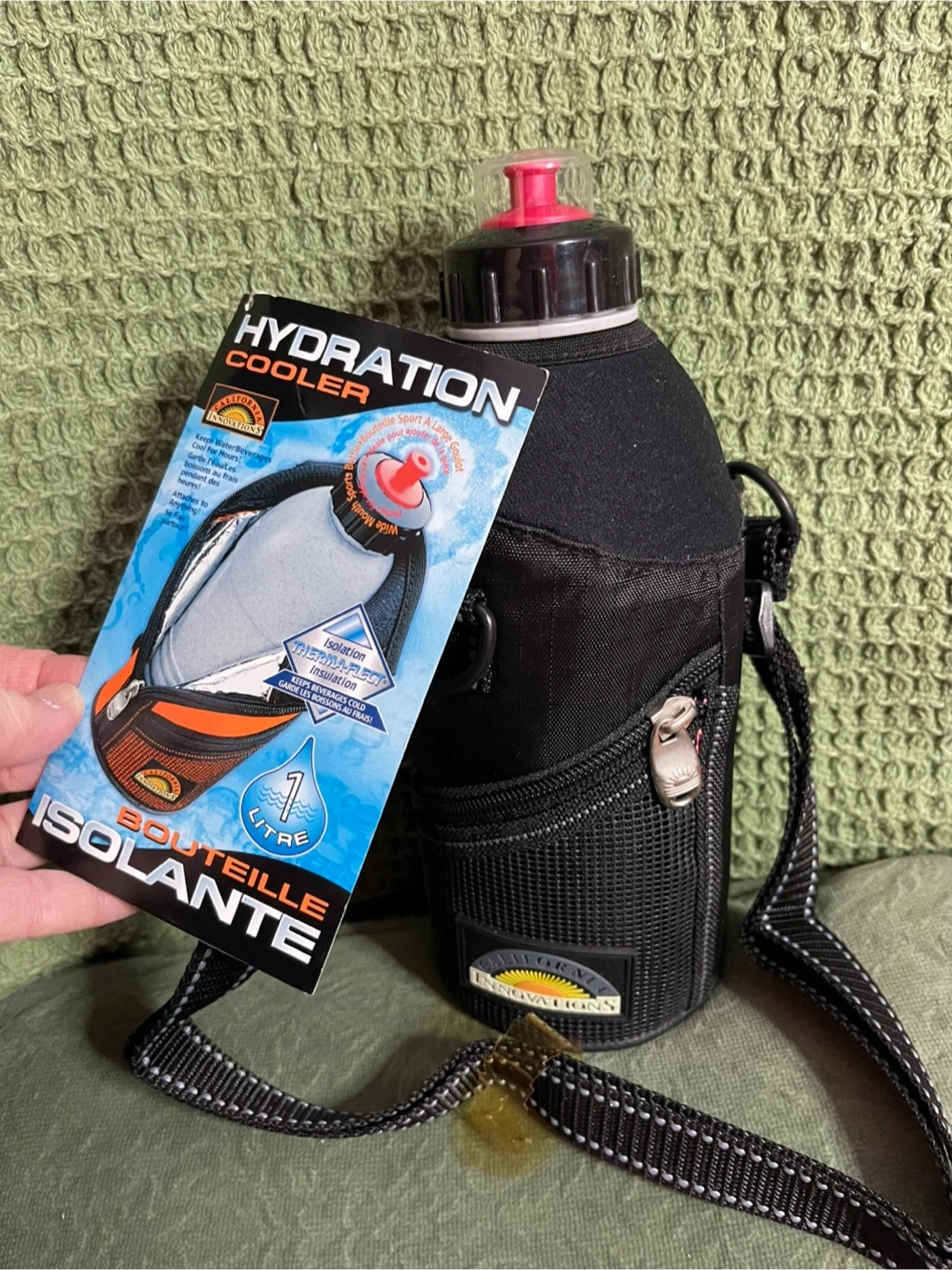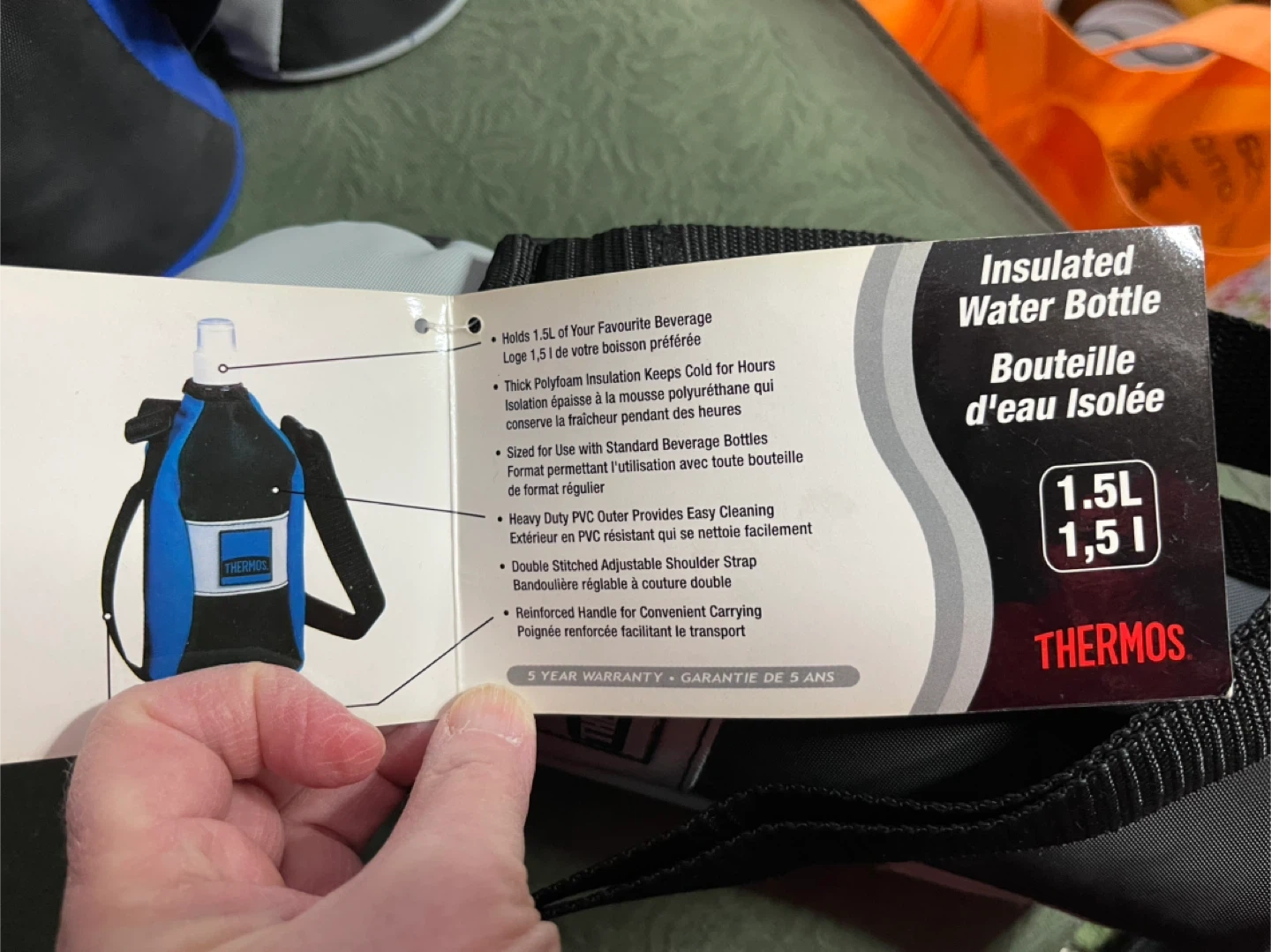 Thermos insulated water bottle holds 1.5L. It features thick polyfoam insulation and a double stitched adjustable shoulder strap. Heavy duty PVC outer provides easy cleaning. This bottle is great for staying hydrated during sports or outdoor activities! Five available $10 each