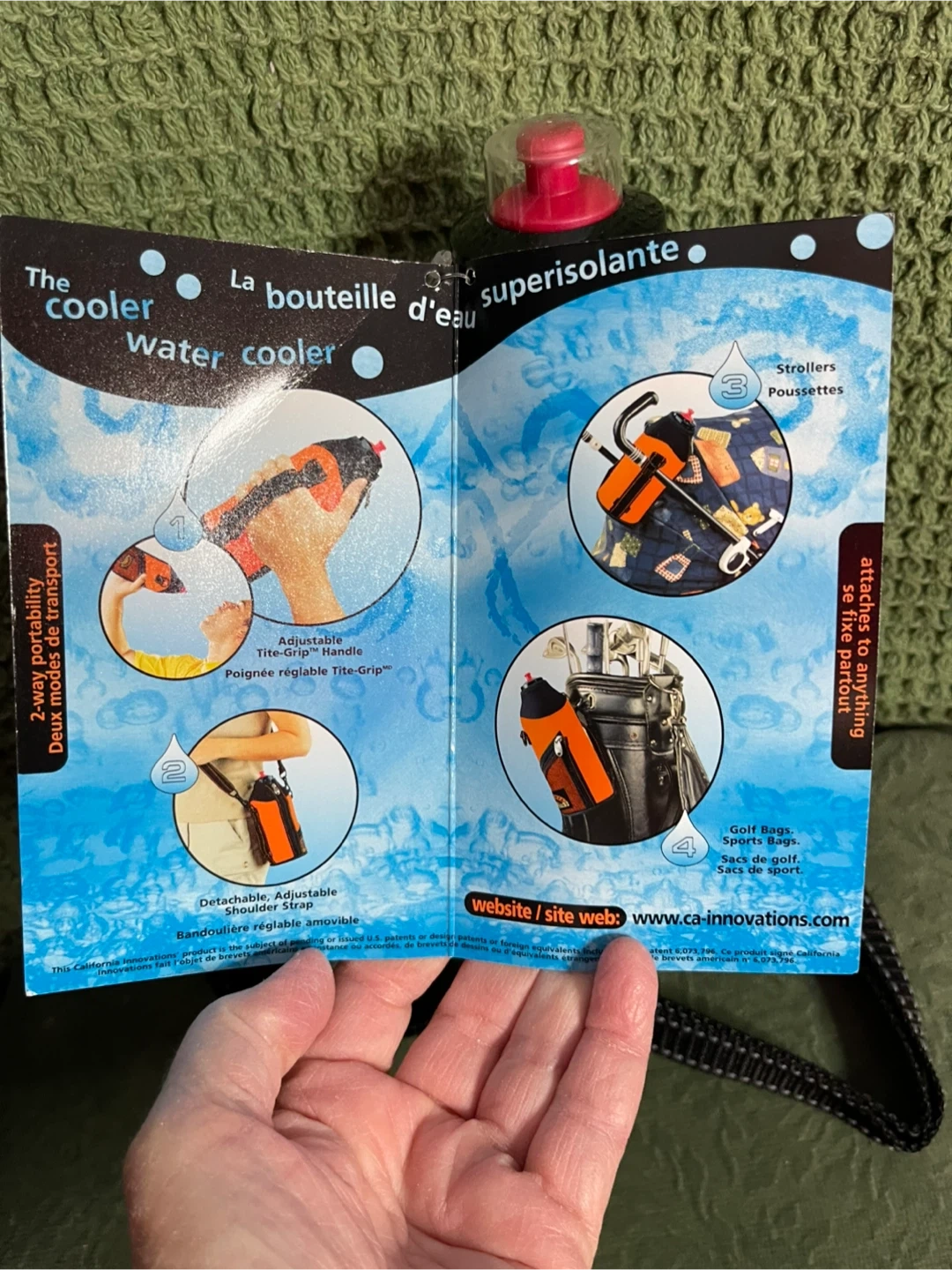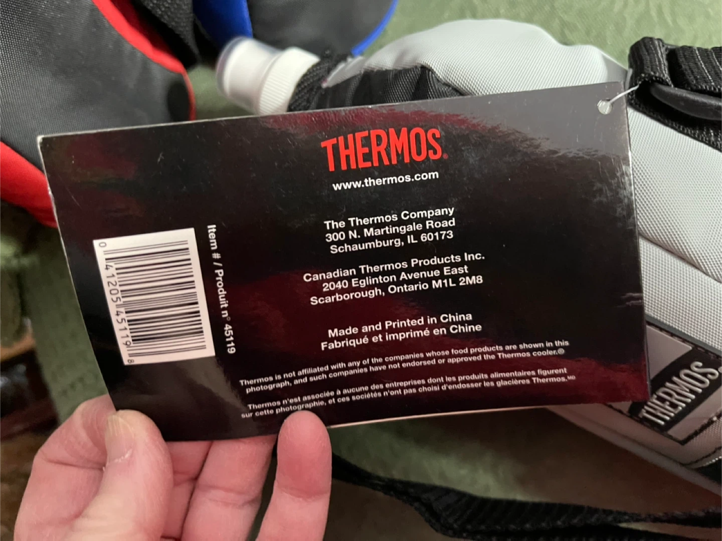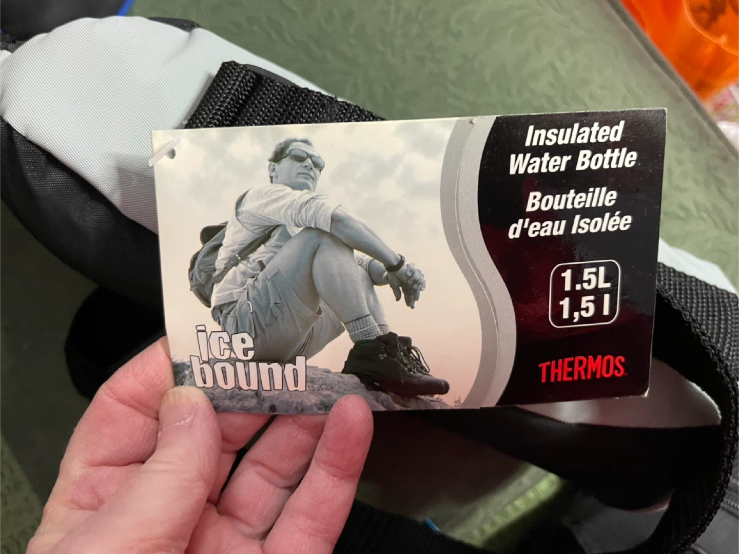 Thermos insulated water bottle holds 1.5L. It features thick polyfoam insulation and a double stitched adjustable shoulder strap. Heavy duty PVC outer provides easy cleaning. This bottle is great for staying hydrated during sports or outdoor activities! Five available $10 each