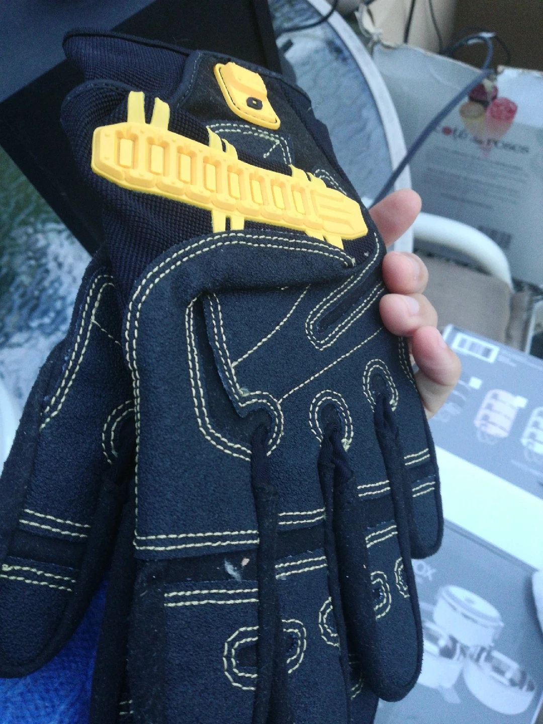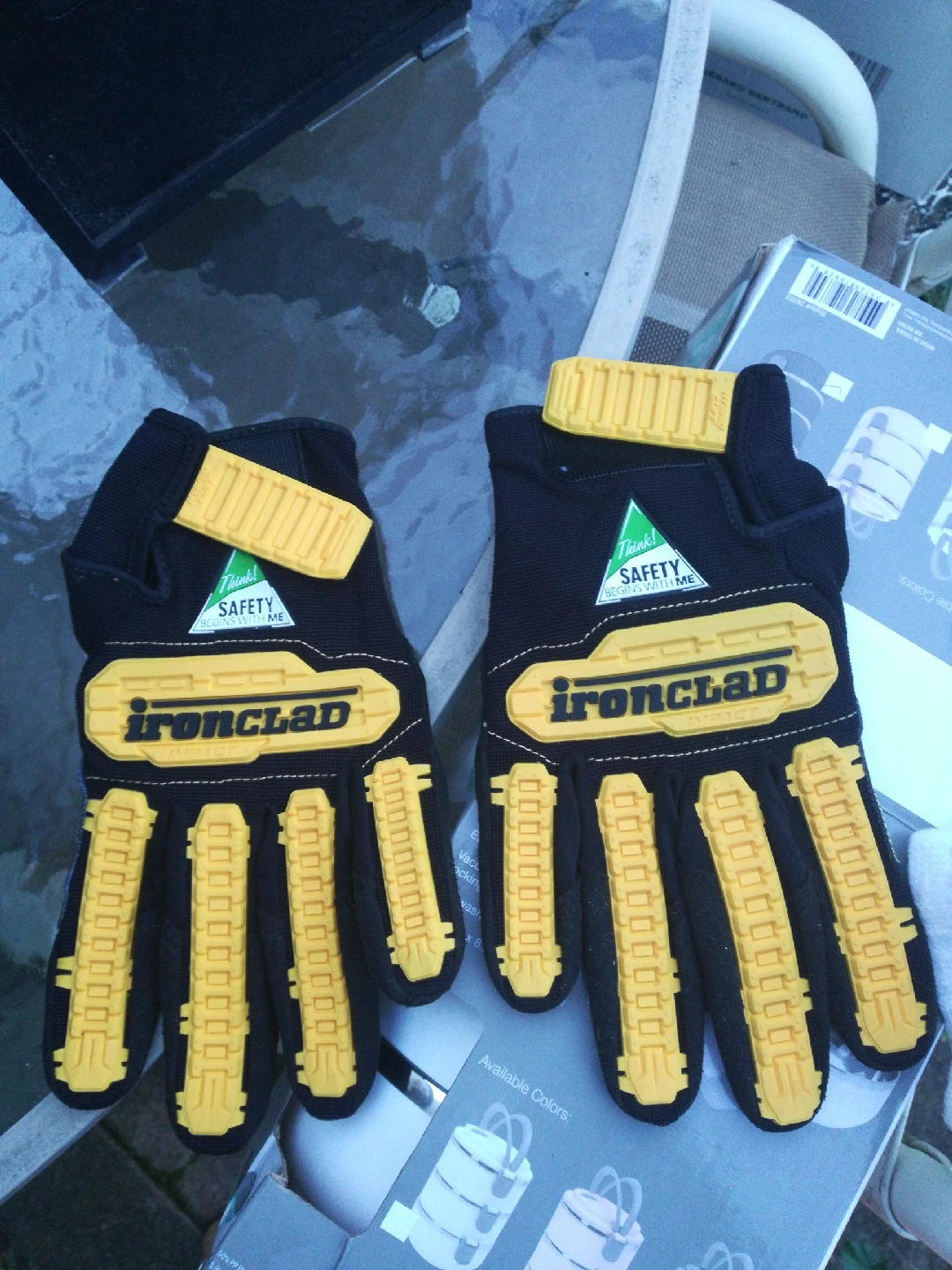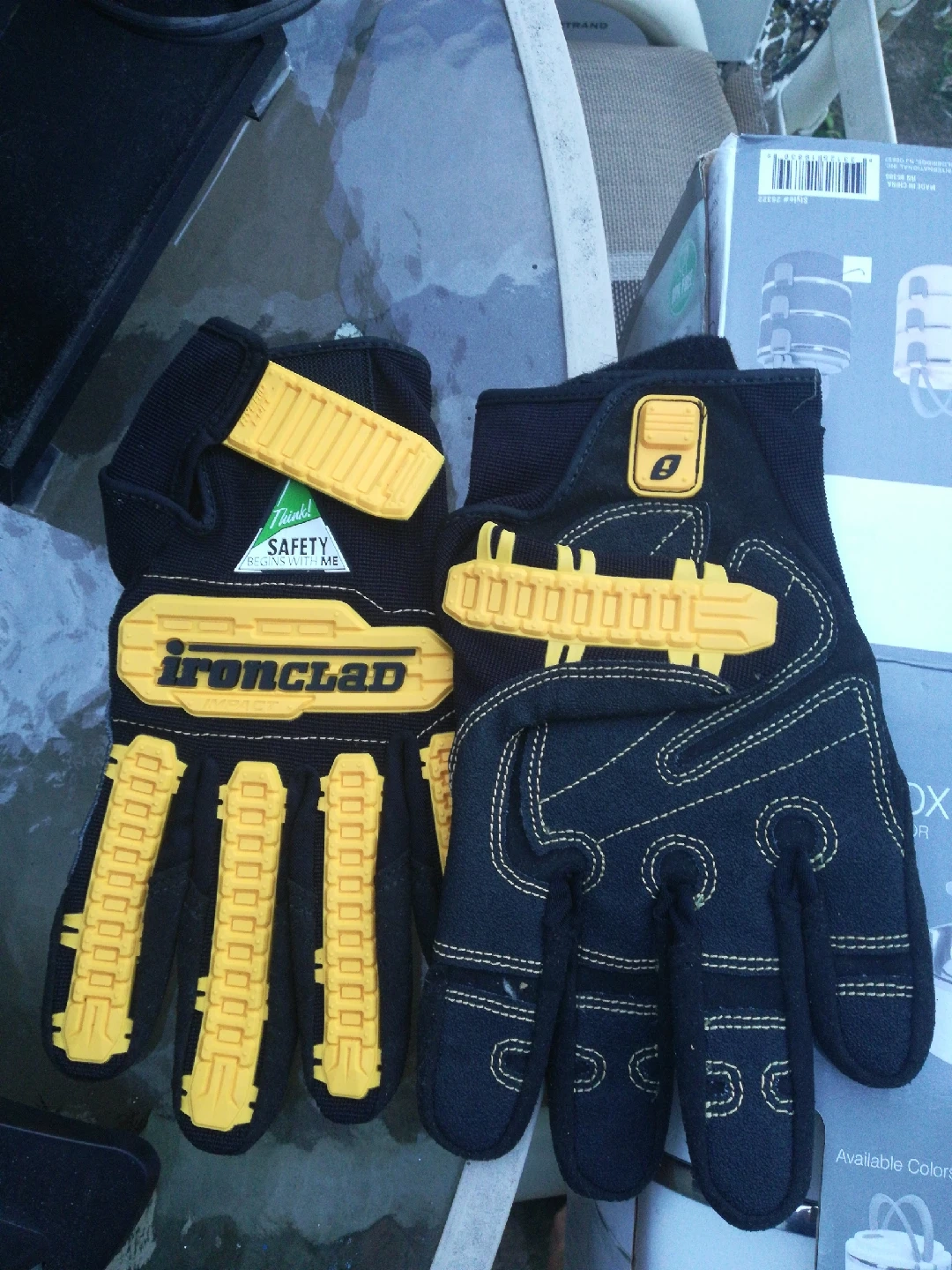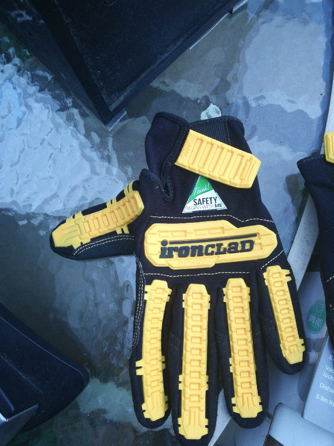 Selling a pair of Ironclad work gloves in good condition! They are black with yellow accents and have extra padding on the fingers and knuckles for added protection. Great for any tough job!