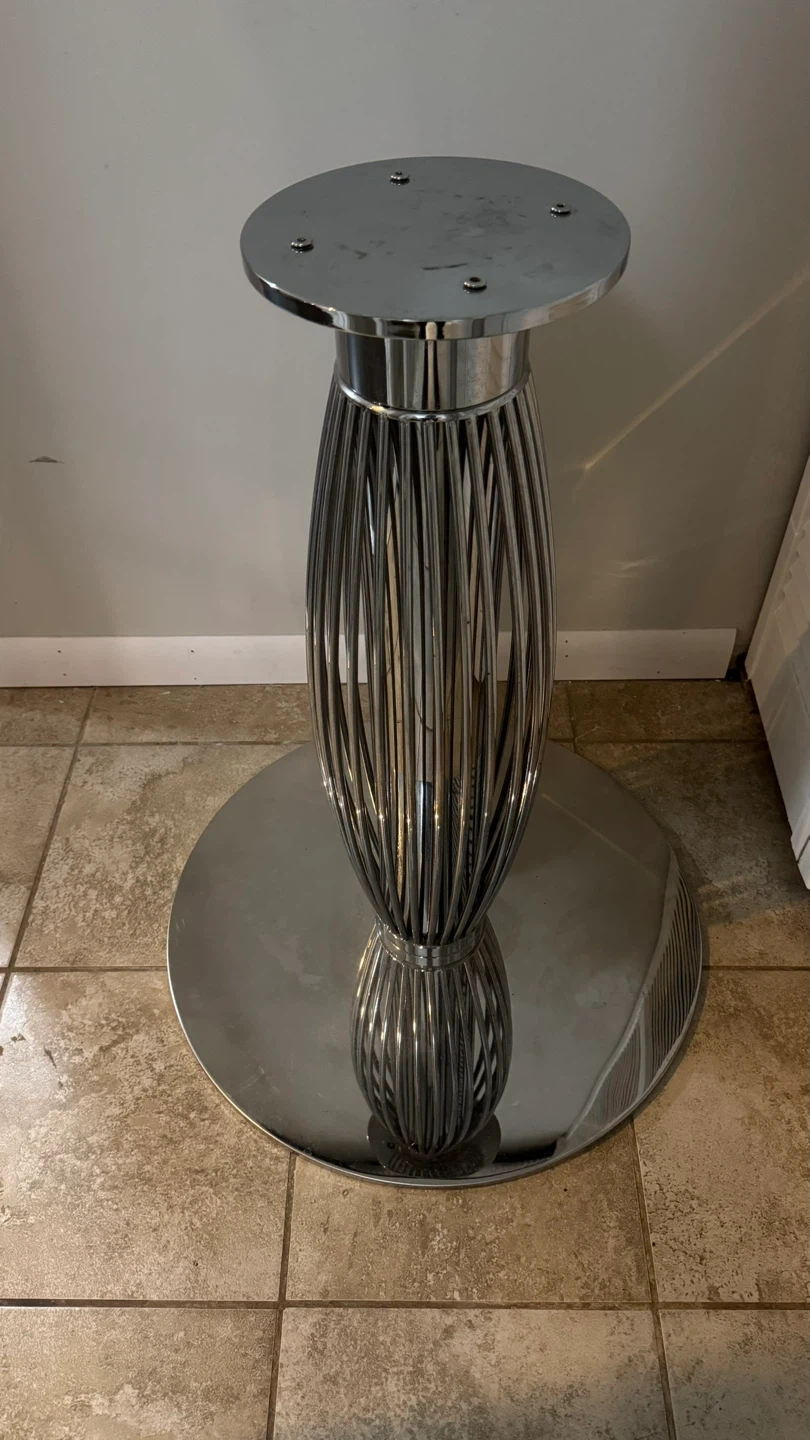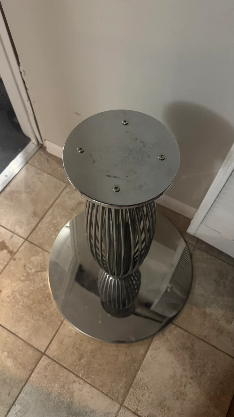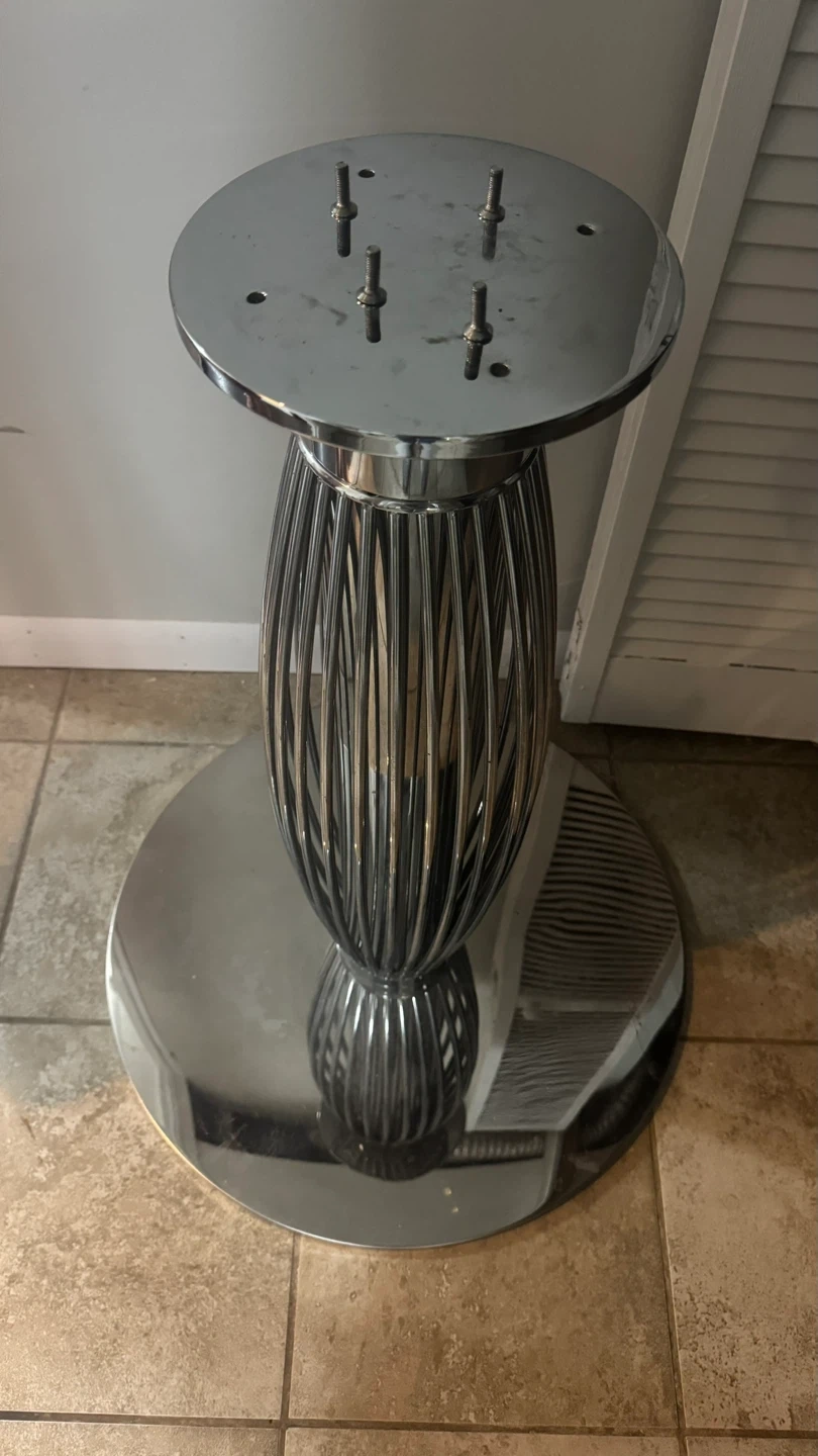 Stylish chrome pedestal table base with a decorative cage design. Comes with a clear round glass tabletop and 4 modern black leather accent chairs. Chairs have a metal frame and black leather upholstery.