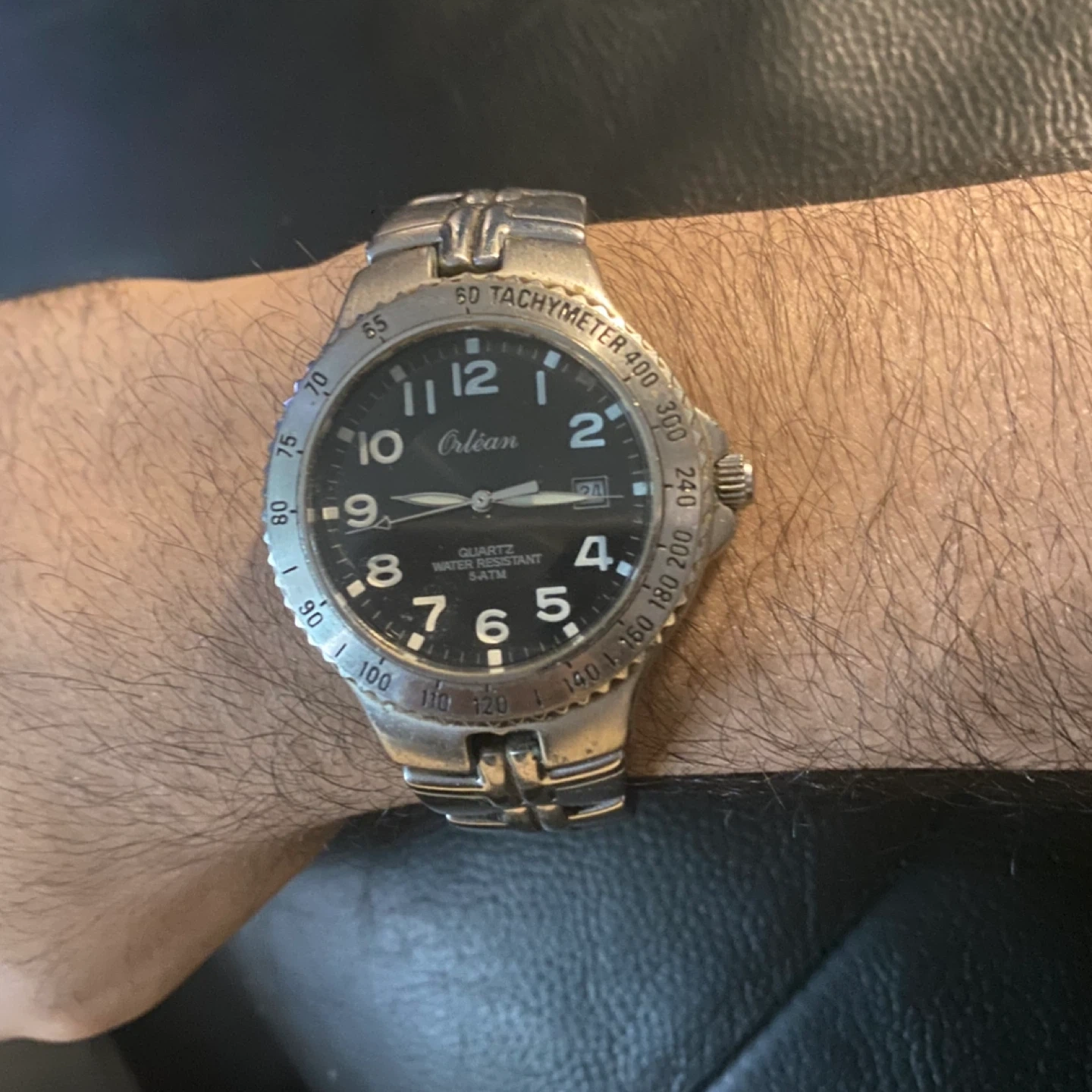 Orlean men's watch with a black dial and stainless steel band. Features a tachymeter bezel and date display. Quartz movement.