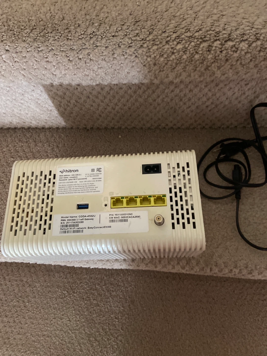 This is a Hitron CODA-4582U DOCSIS 3.1 WiFi Gateway. It includes an Ethernet cable. This gateway is suitable for internet service up to gigabit speeds.