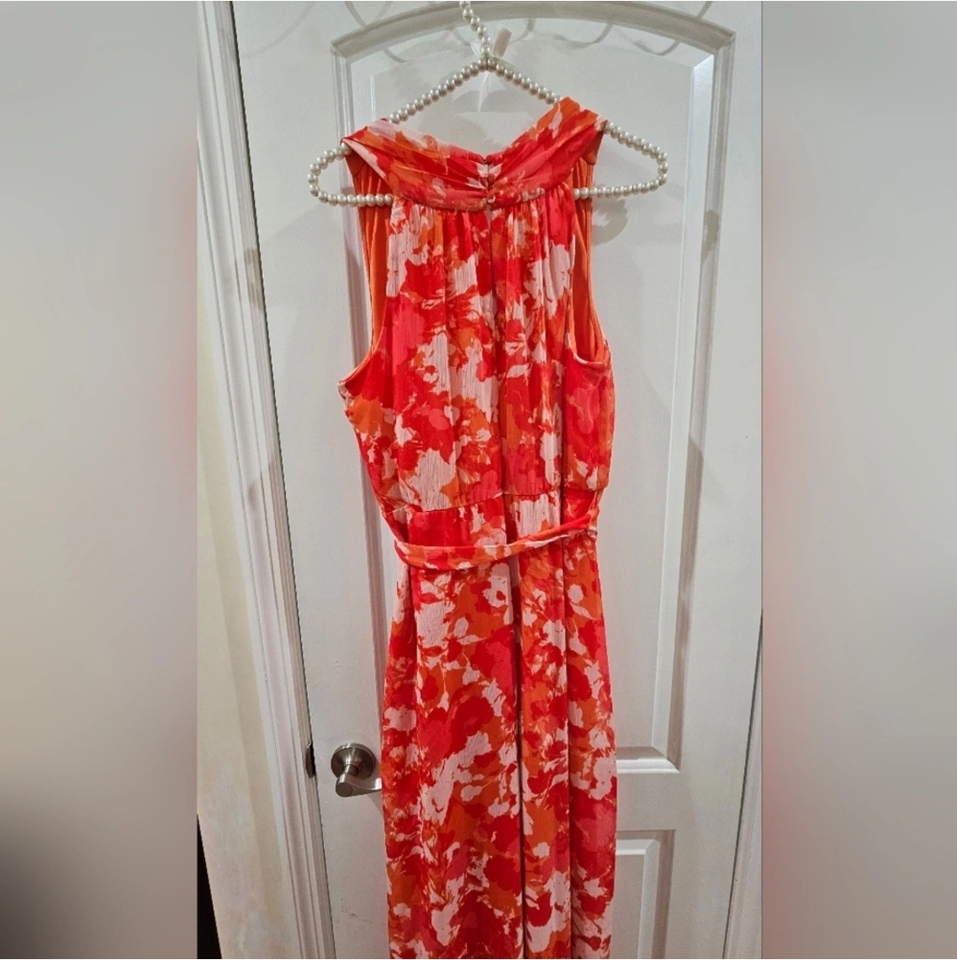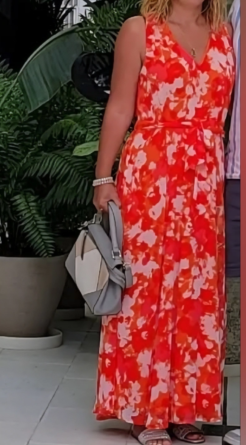Selling a beautiful floral maxi dress in size L. It features a vibrant orange and white floral pattern and a flattering silhouette. Perfect for summer outings or special occasions