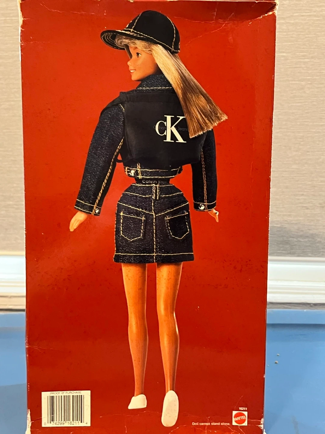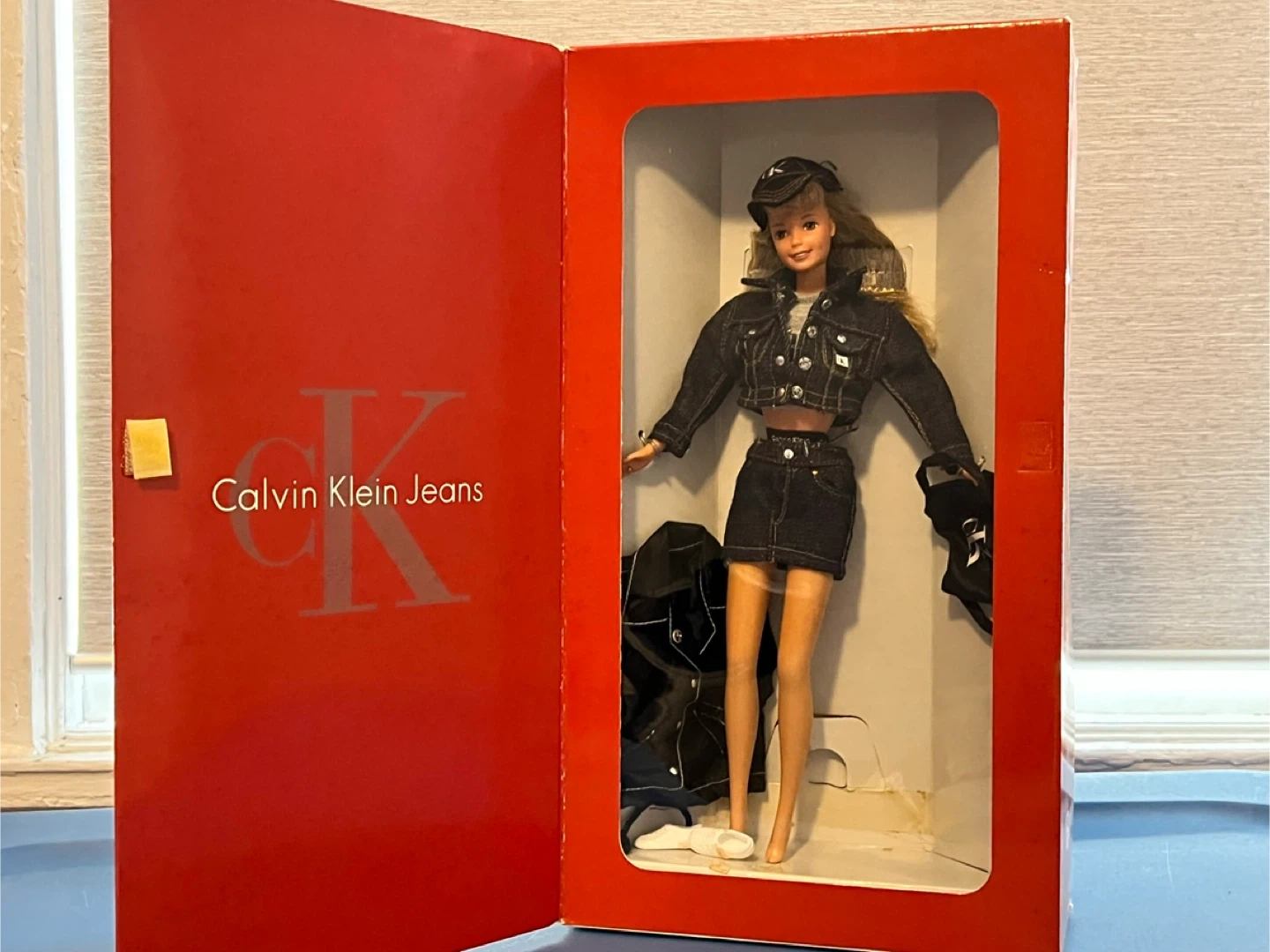 10This is a Calvin Klein Jeans Barbie Doll by Mattel. It comes in the original box. The doll is wearing a denim jacket and skirt with a CK logo on the back of the jacket. It also includes a hat and other accessories