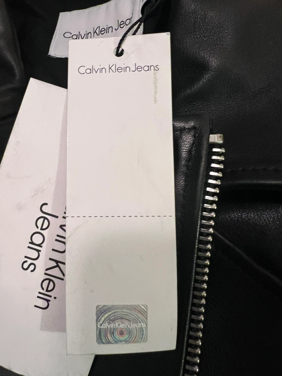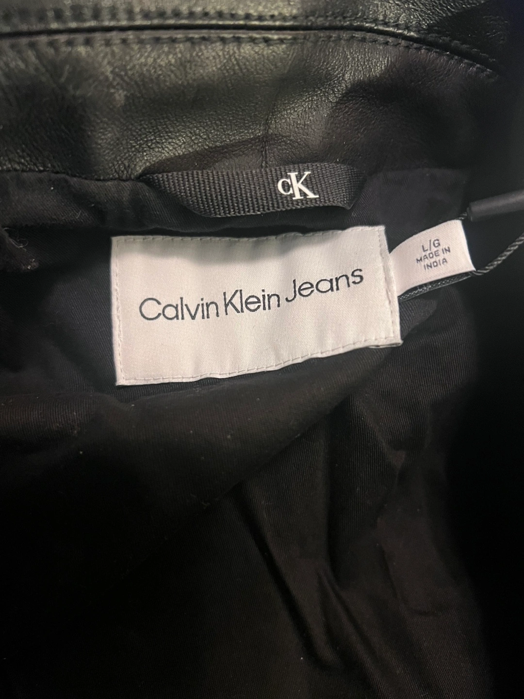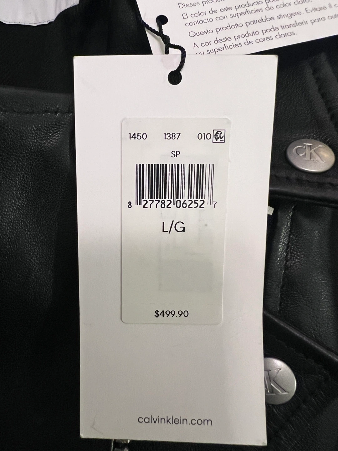 This is a Calvin Klein Jeans black leather biker jacket. It's a size L/G. The tag shows it originally retailed for $499.90. new condition! Women’s large. Open boxes item never warn.
