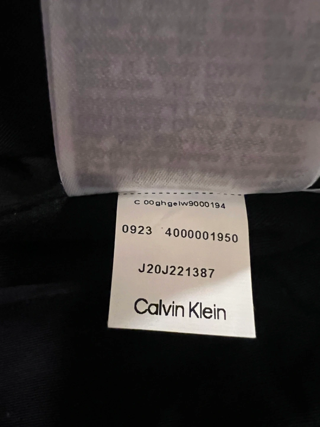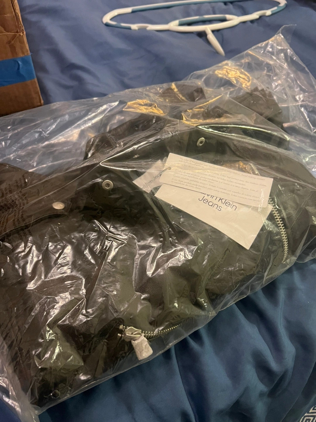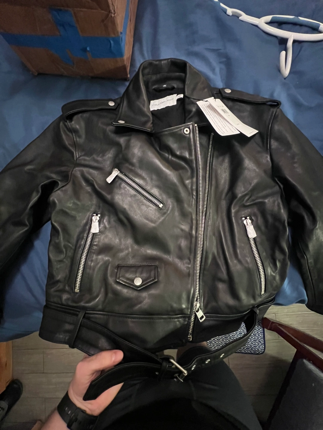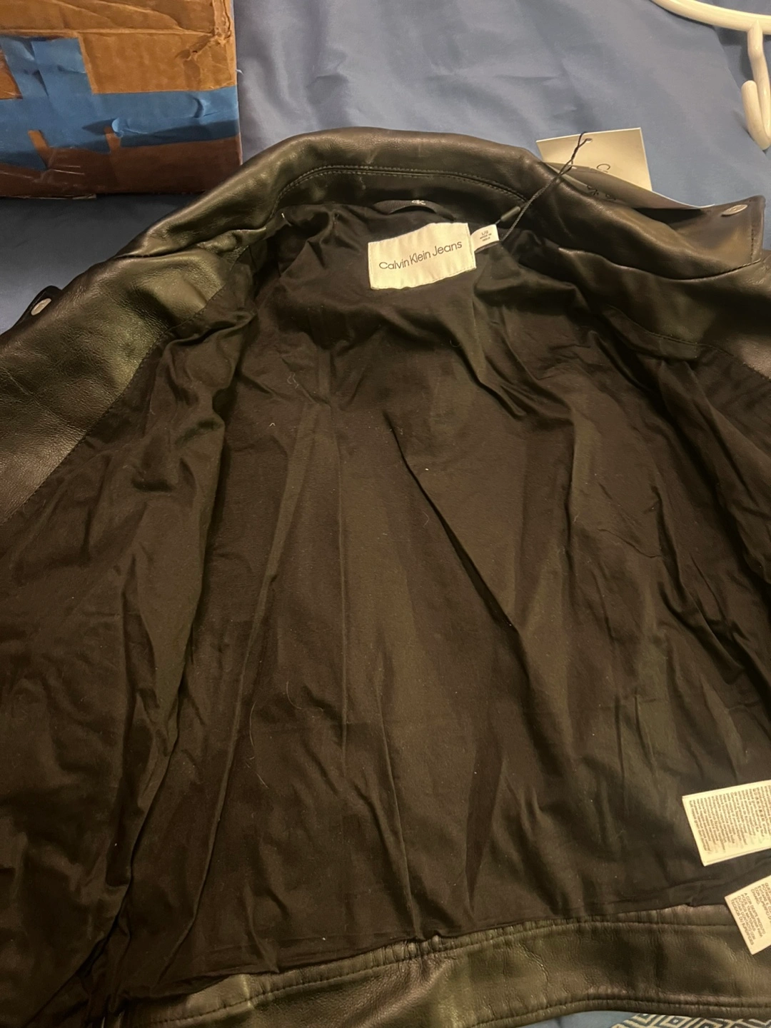 This is a Calvin Klein Jeans black leather biker jacket. It's a size L/G. The tag shows it originally retailed for $499.90. new condition! Women’s large. Open boxes item never warn.