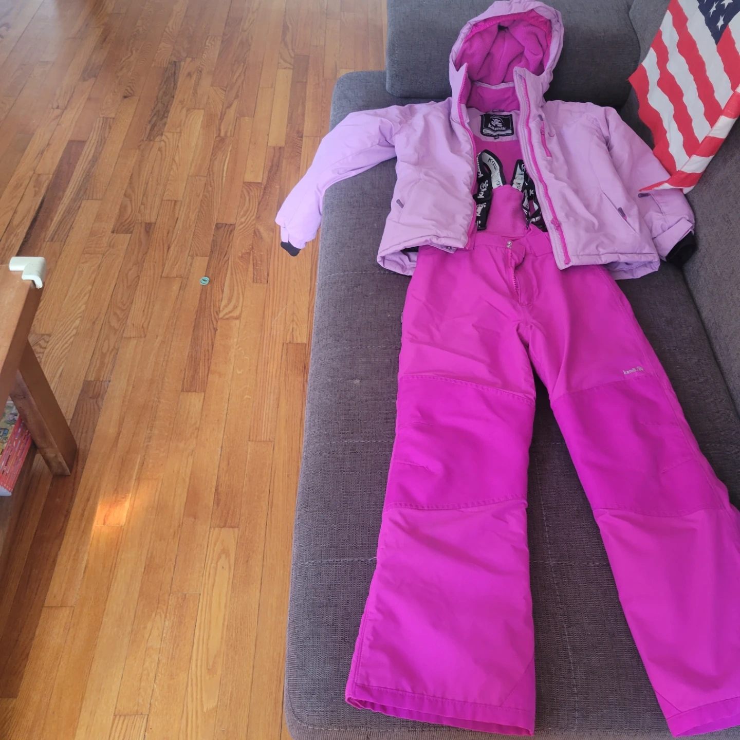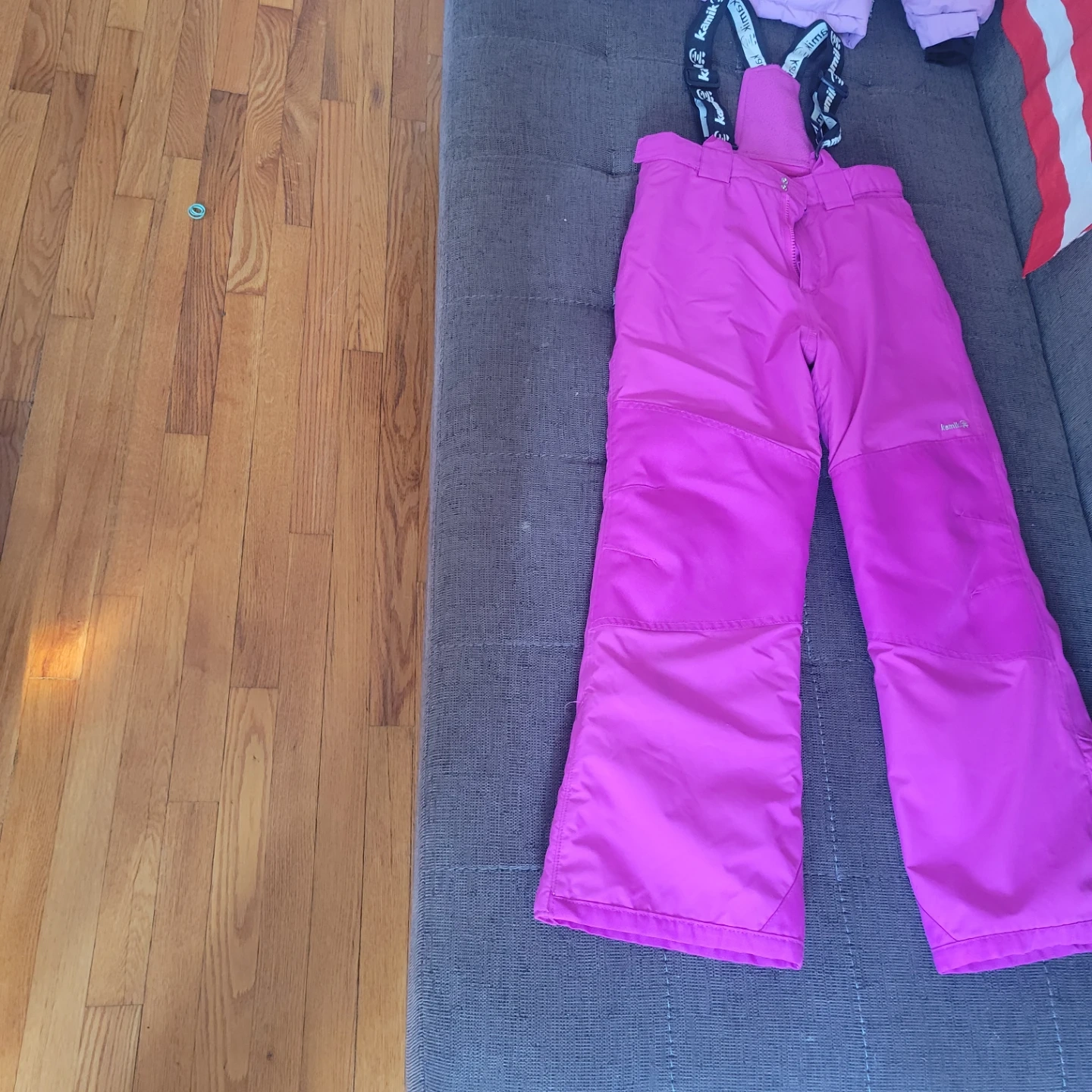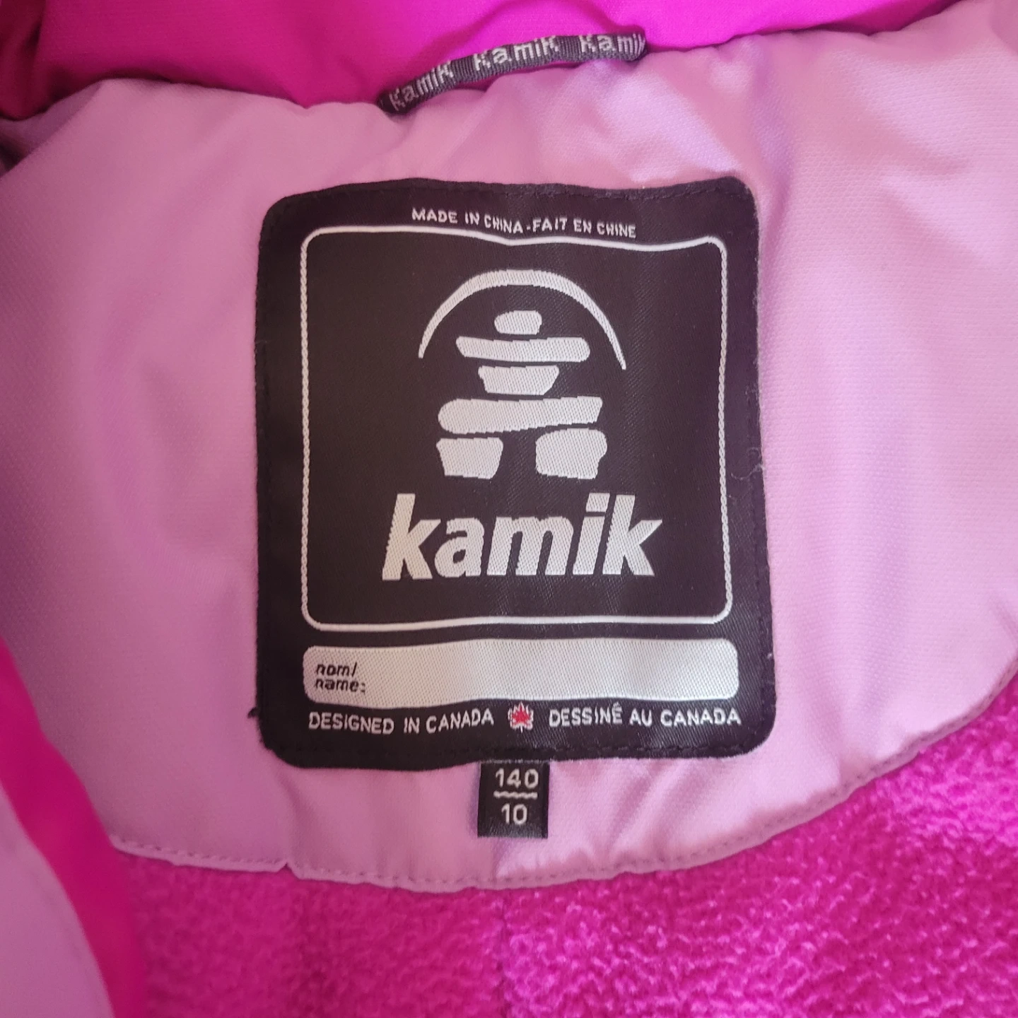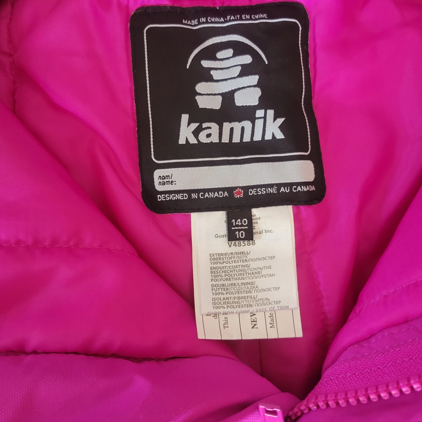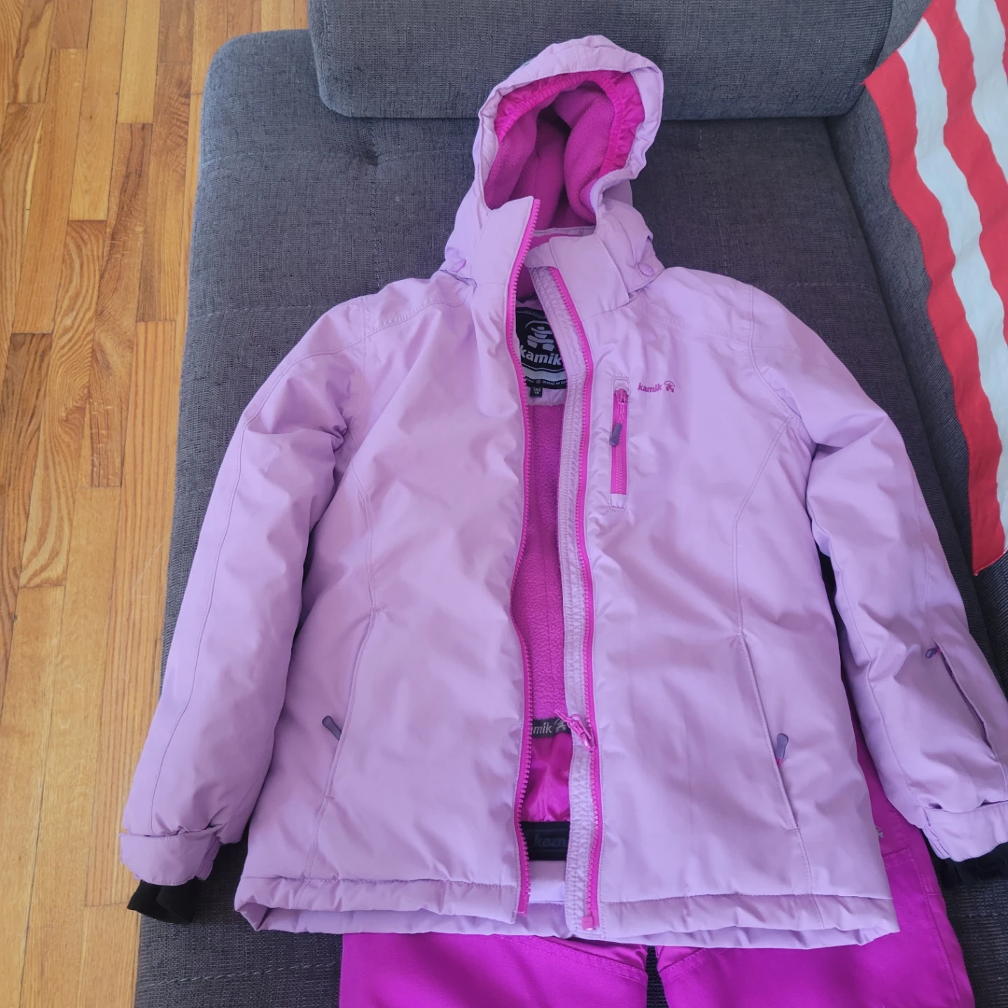 This Kamik ski set includes a jacket and bib pants. Size 10, Both are made with 100% polyester. They're designed for winter weather! Jacket is purple and pants are bright pink.