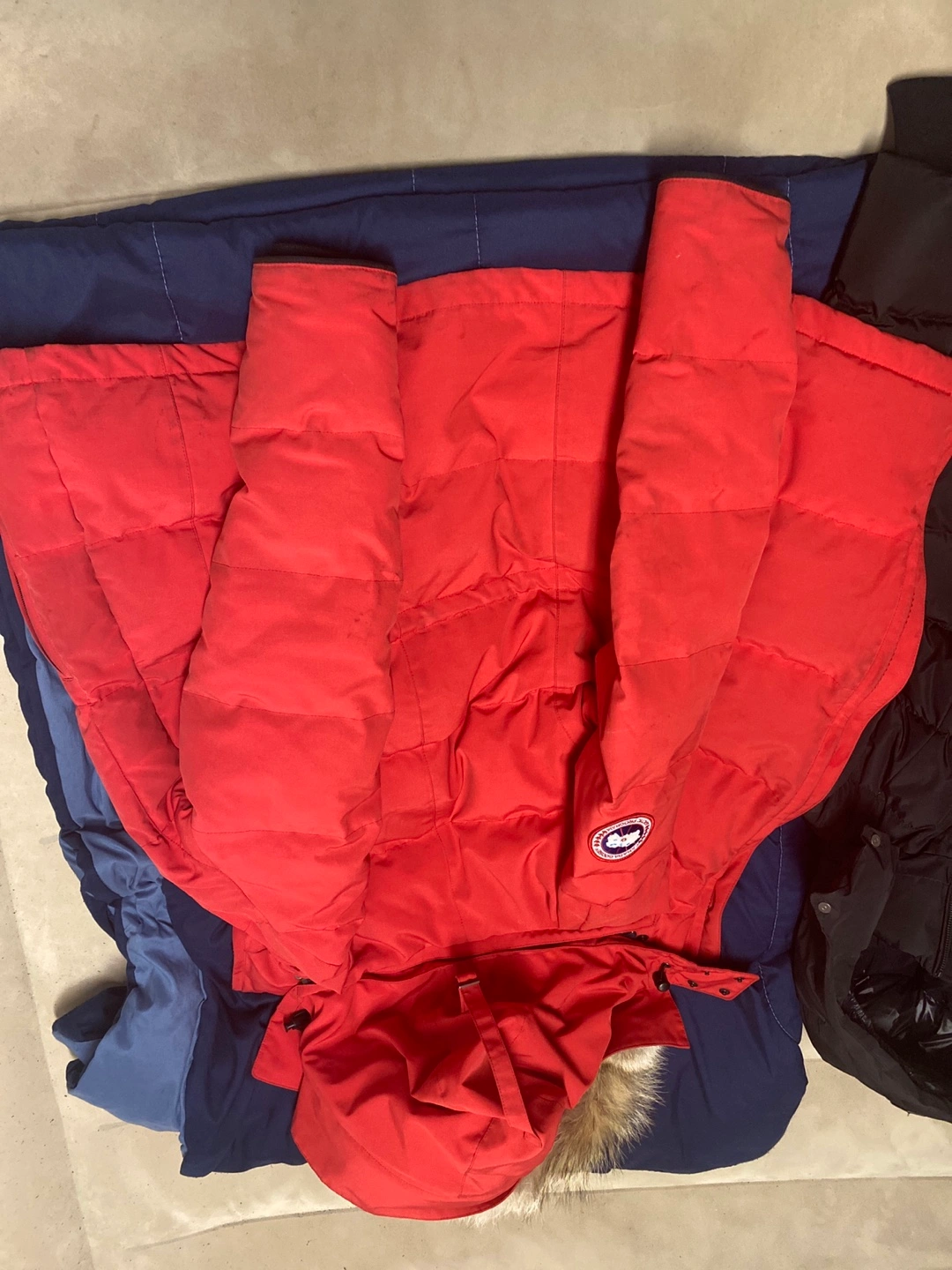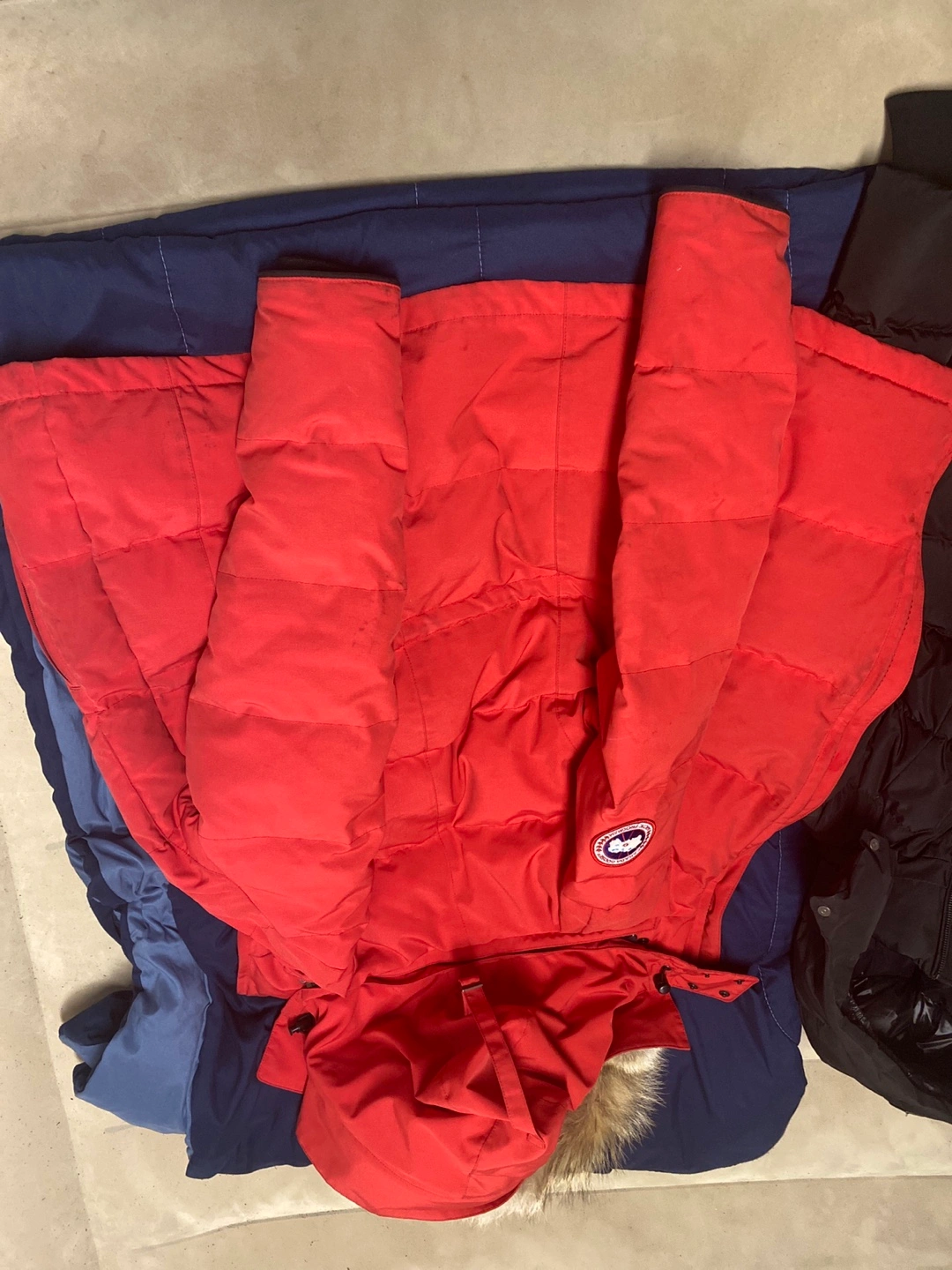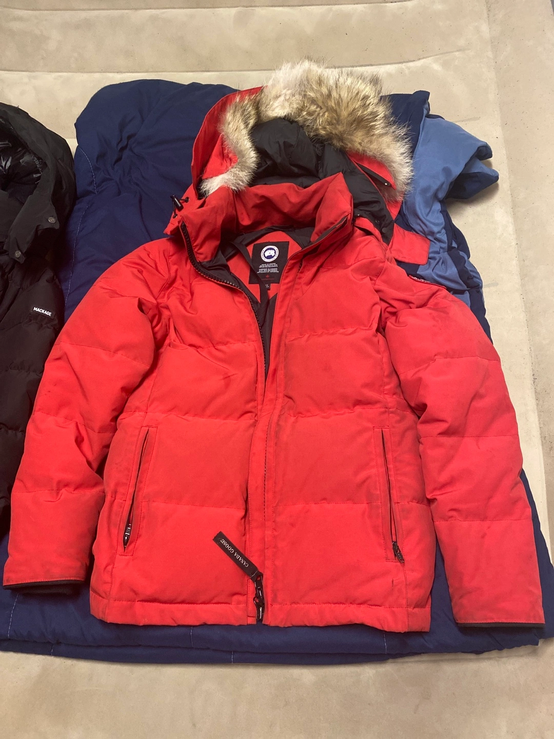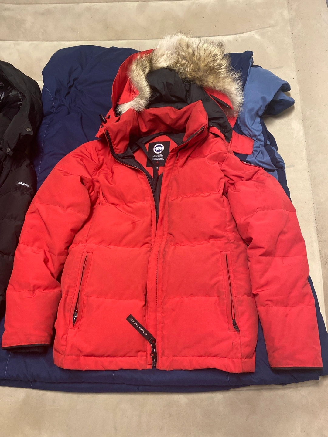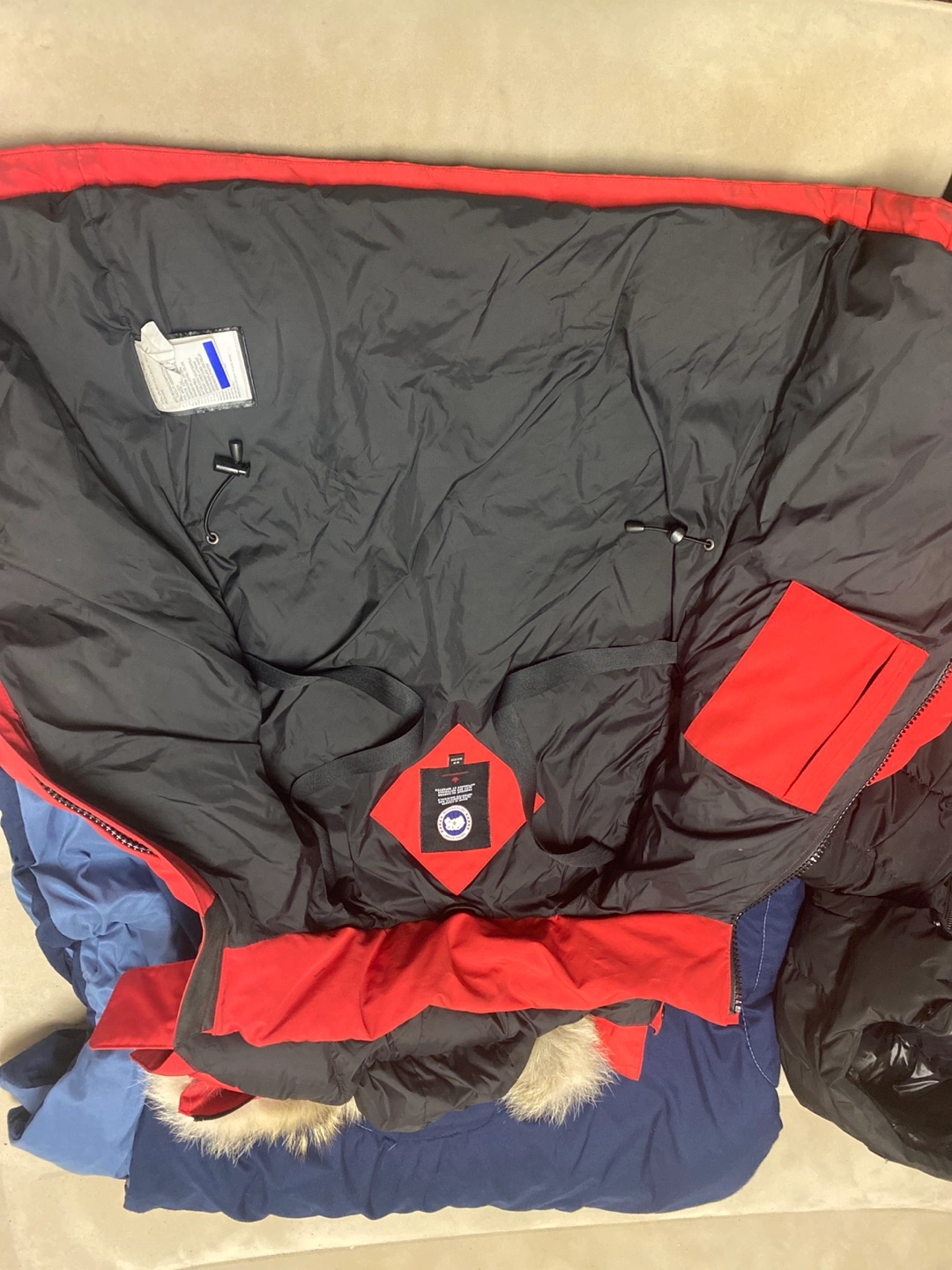 73Red winter jacket. Fur-lined hood. Zipper and snap closure. Two front pockets. Drawstring waist.