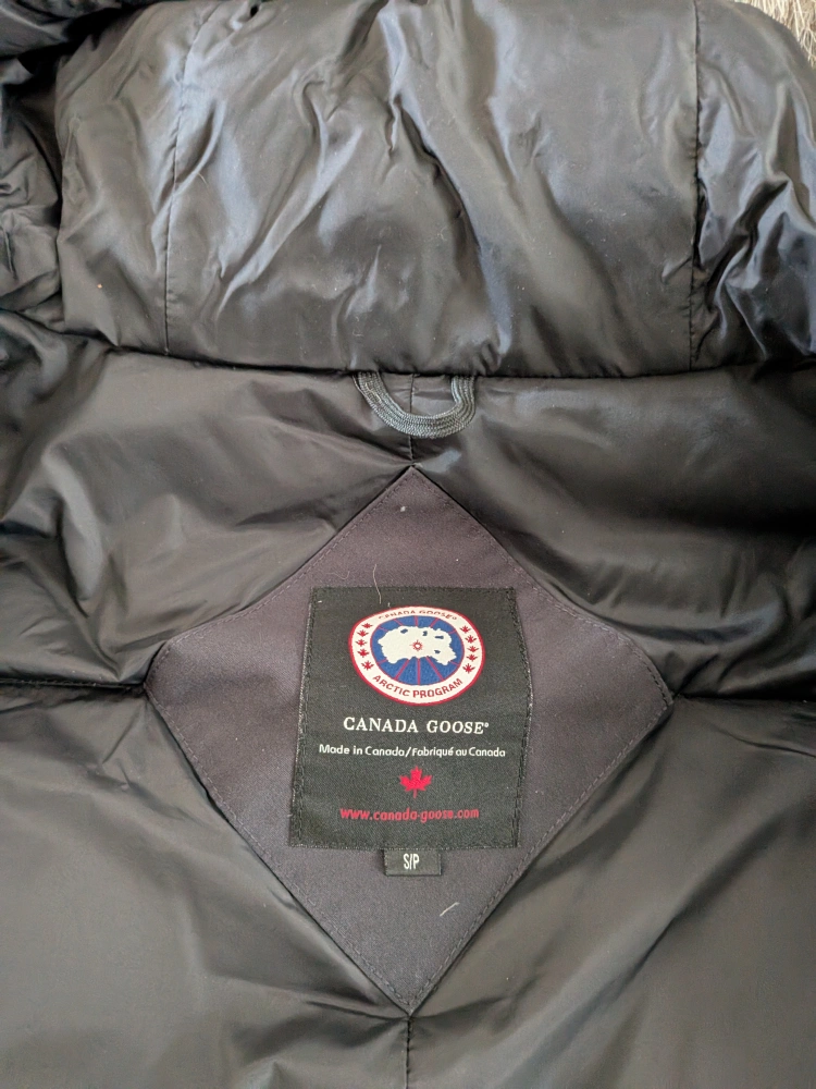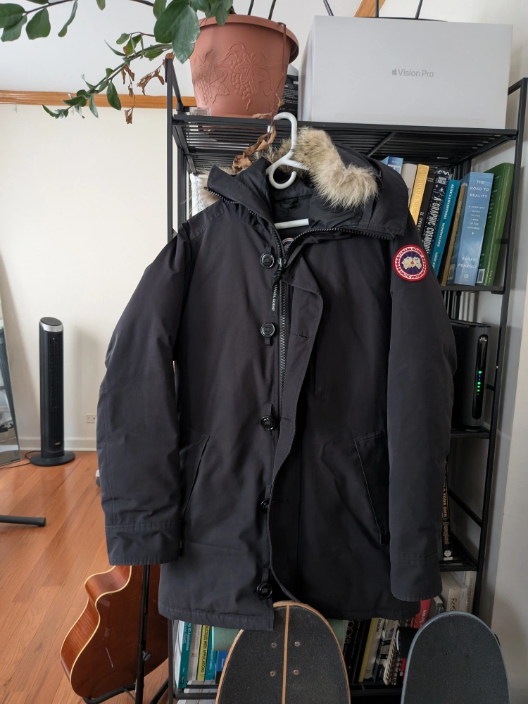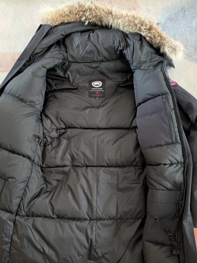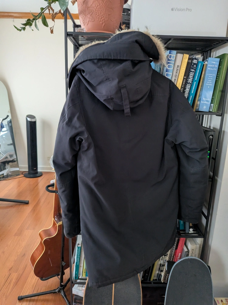 18Men's black down-filled parka. Features a fur-trimmed hood and multiple pockets. Excellent condition. Size M.