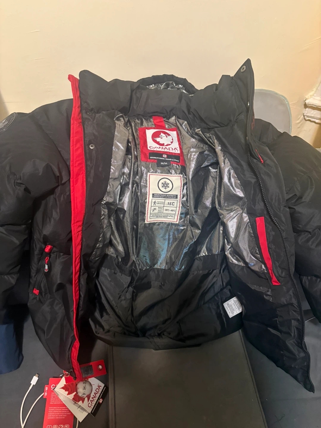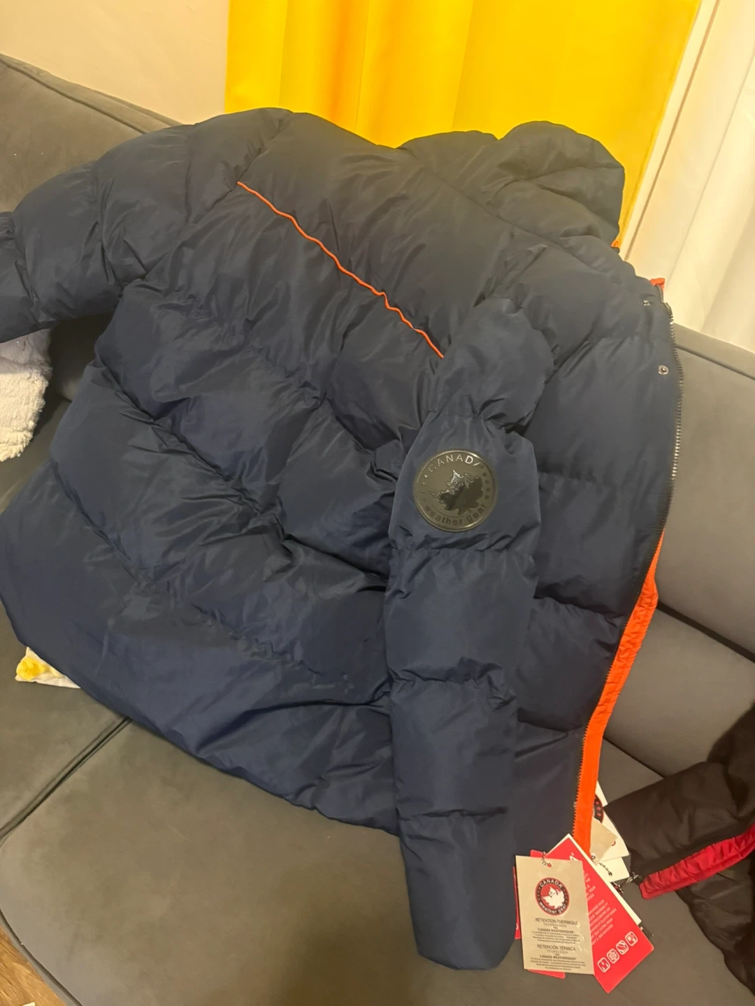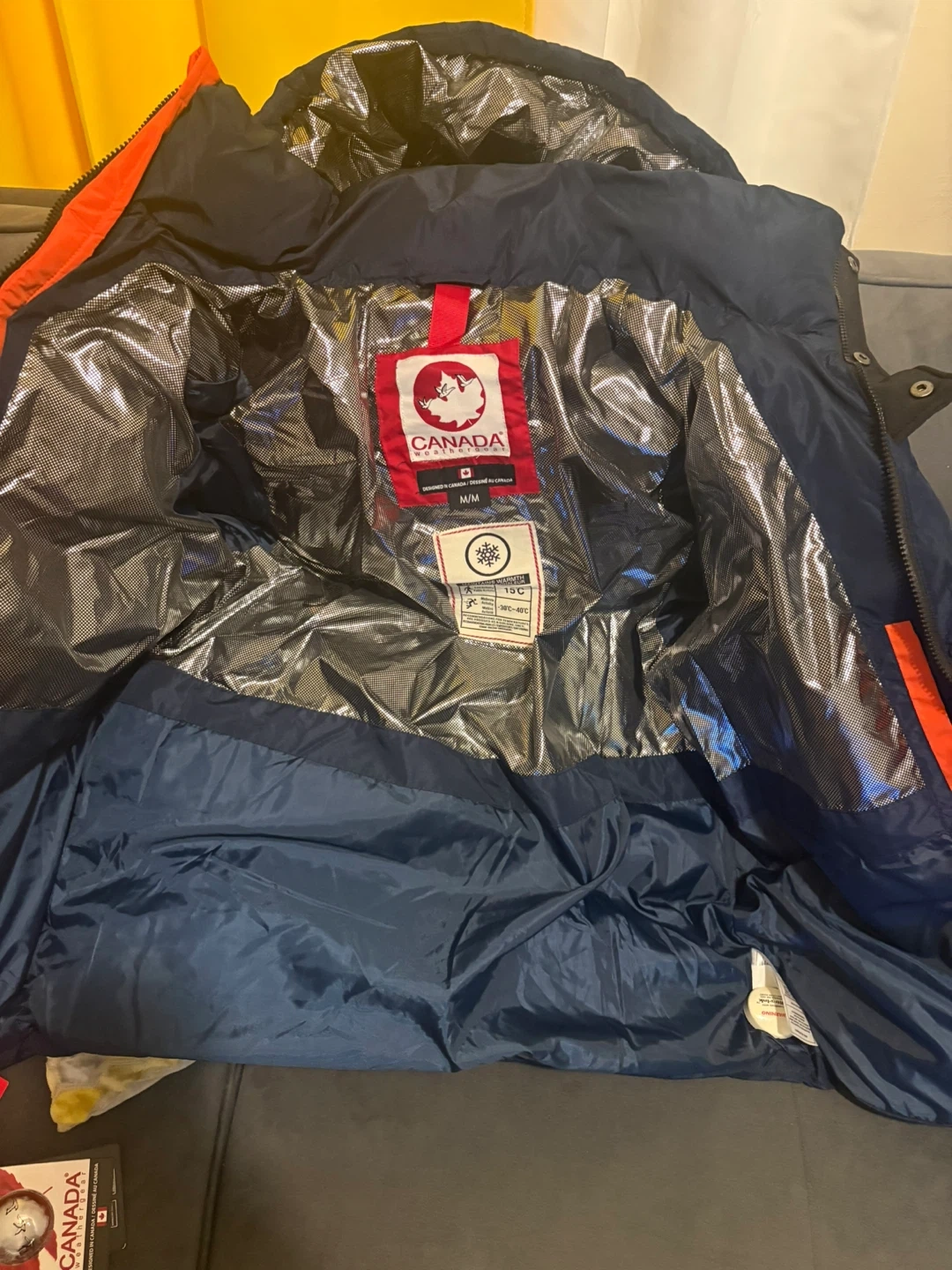 Canada Goose puffer jacket in size M/M. It's in great condition and ready to keep you warm! The jacket is black with red accents on one and navy with orange accents on the other. Perfect for the cold weather