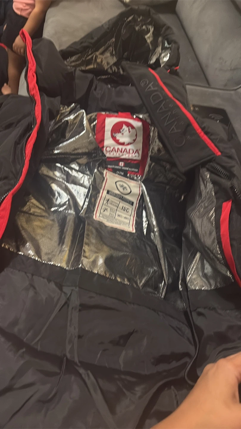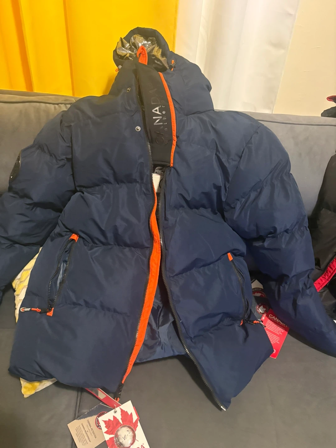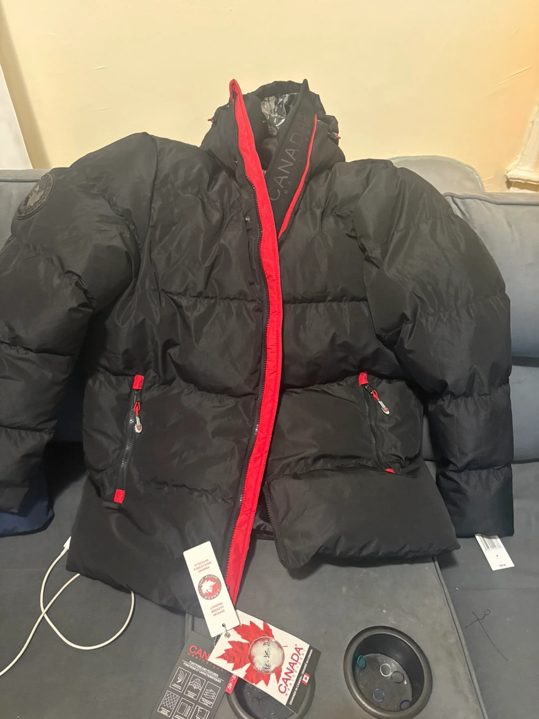 Canada Goose puffer jacket in size M/M. It's in great condition and ready to keep you warm! The jacket is black with red accents on one and navy with orange accents on the other. Perfect for the cold weather
