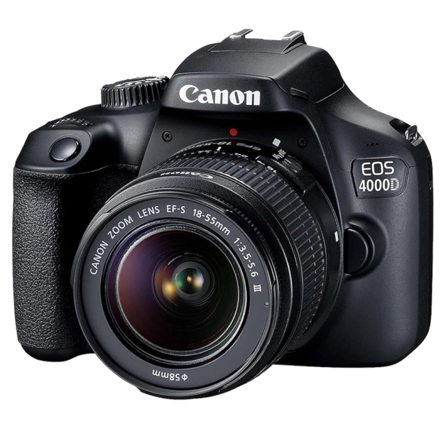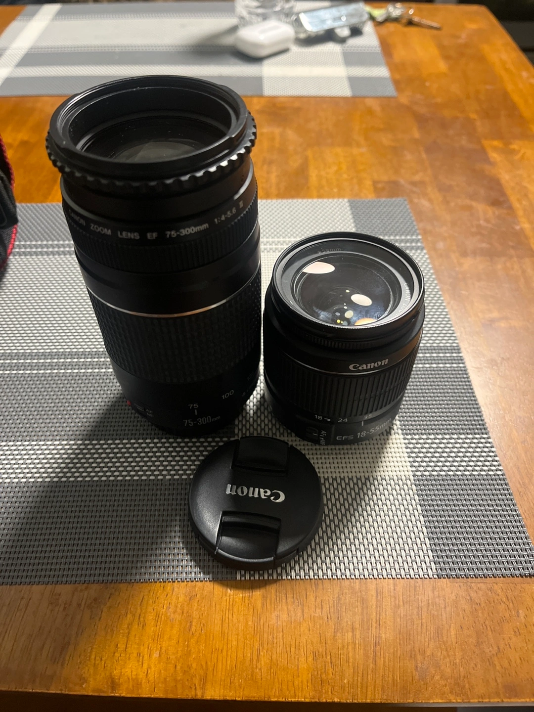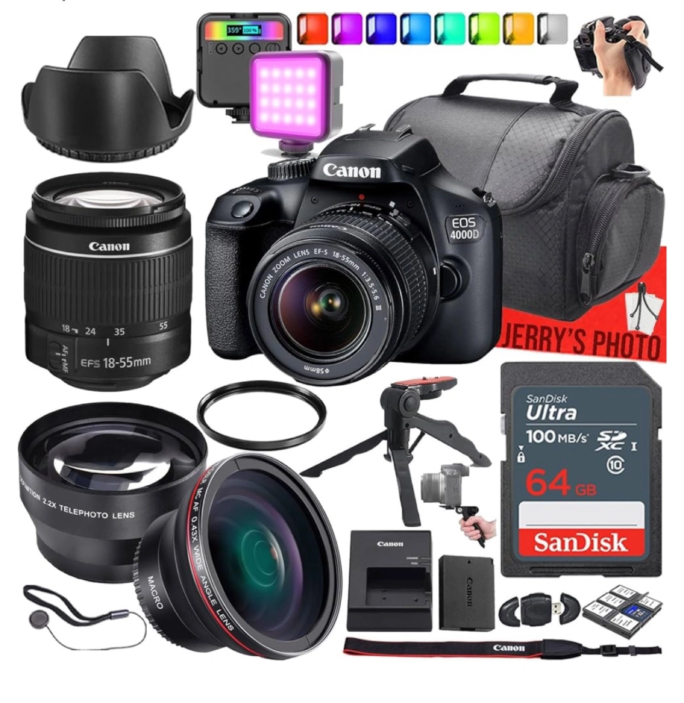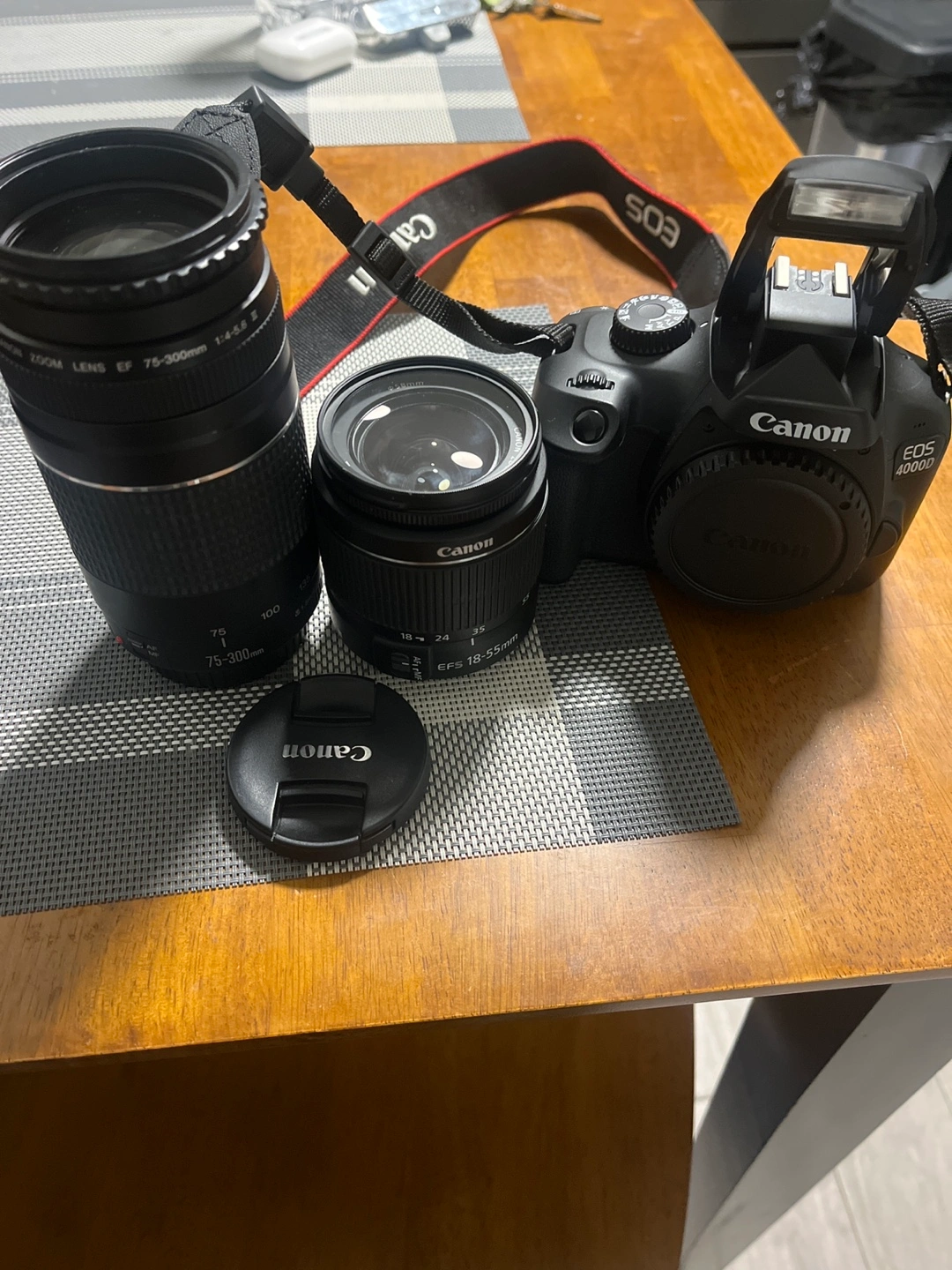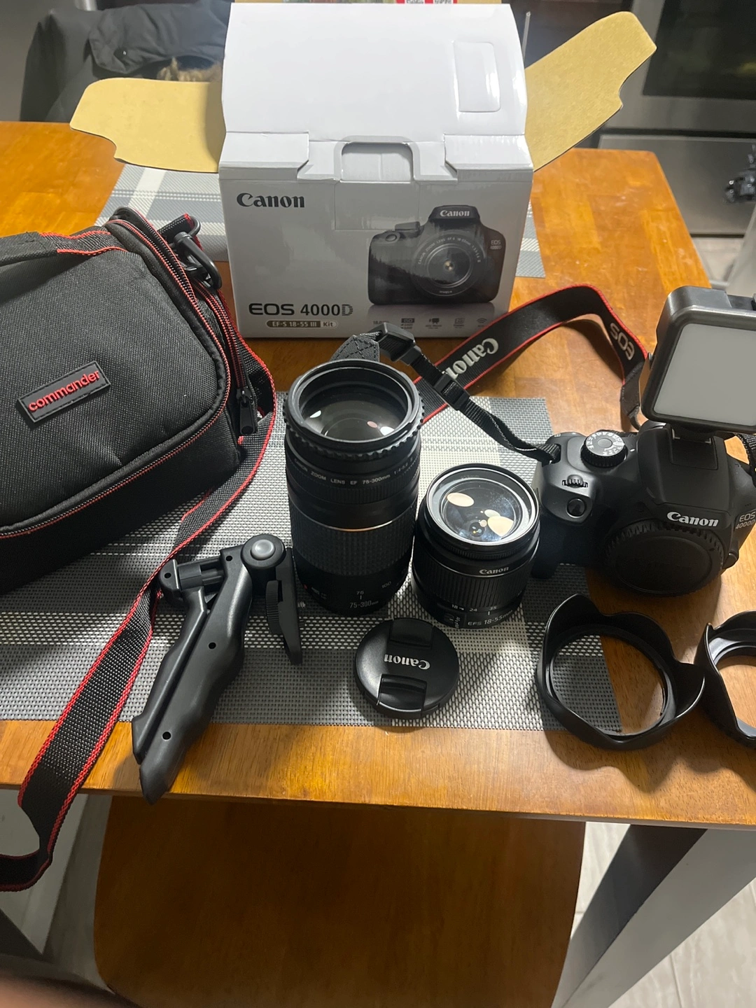Canon EOS 4000D DSLR camera. Includes 18-55mm and 75-300mm lenses. Extra accessories: lens filters, SD card, carrying case, tripod, LED light, and more. Great for beginners or hobbyists. Takes excellent photos ( See sample photos at end of slide)