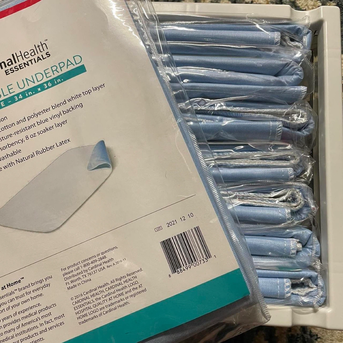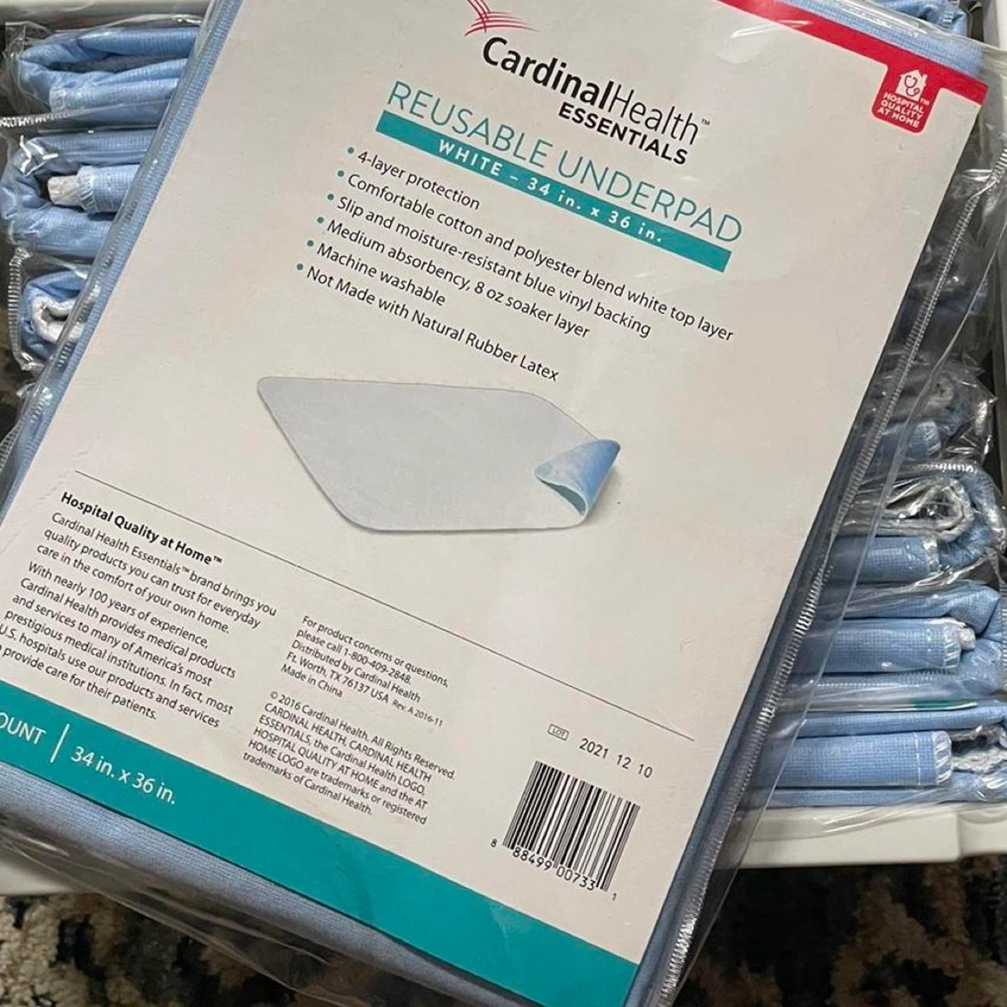 10I have a few of Cardinal Health Reusable Underpads. These are white and measure 34 inches by 36 inches. They have a 4-layer protection, comfortable cotton and polyester blend white top layer, slip and moisture-resistant blue vinyl backing, and medium absorbency of 8 oz soaker layer. They are also machine washable and not made with Natural Rubber Latex