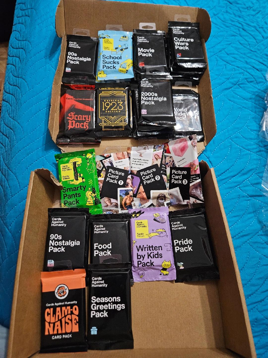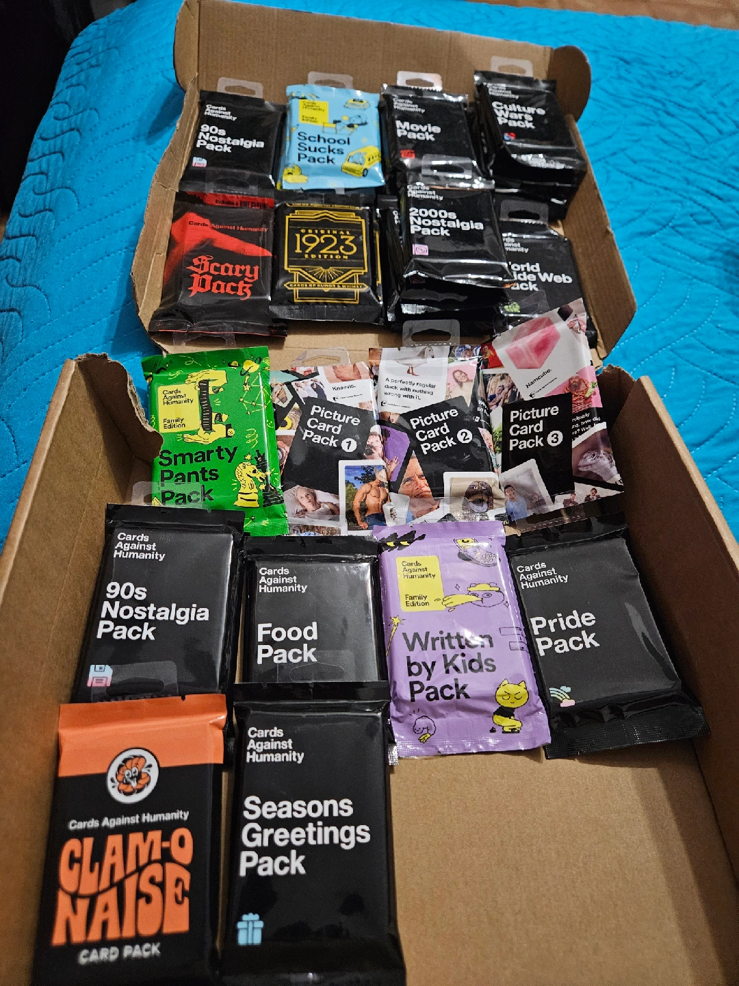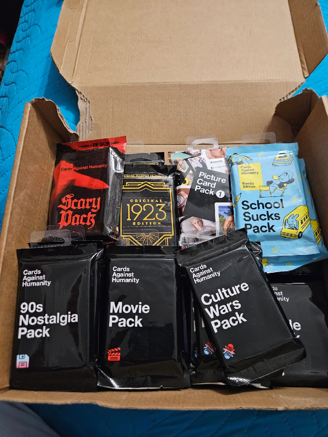 Selling a Cards Against Humanity Foil Pack Assortment! It includes various themed packs like the '90s Nostalgia Pack, Movie Pack, Culture Wars Pack, Scary Pack, and many more! Great for adding some extra fun to game night! The box is included. PICK UP ONLY