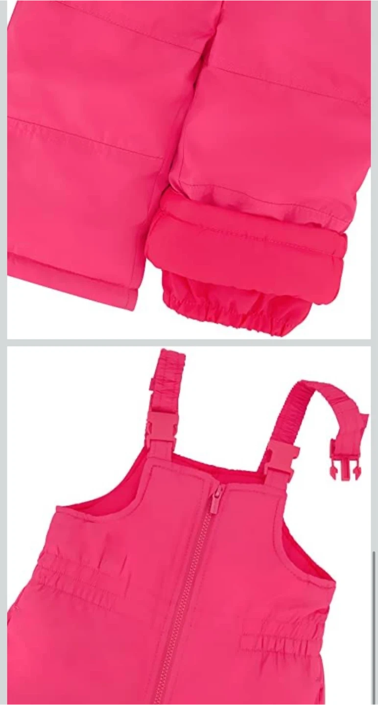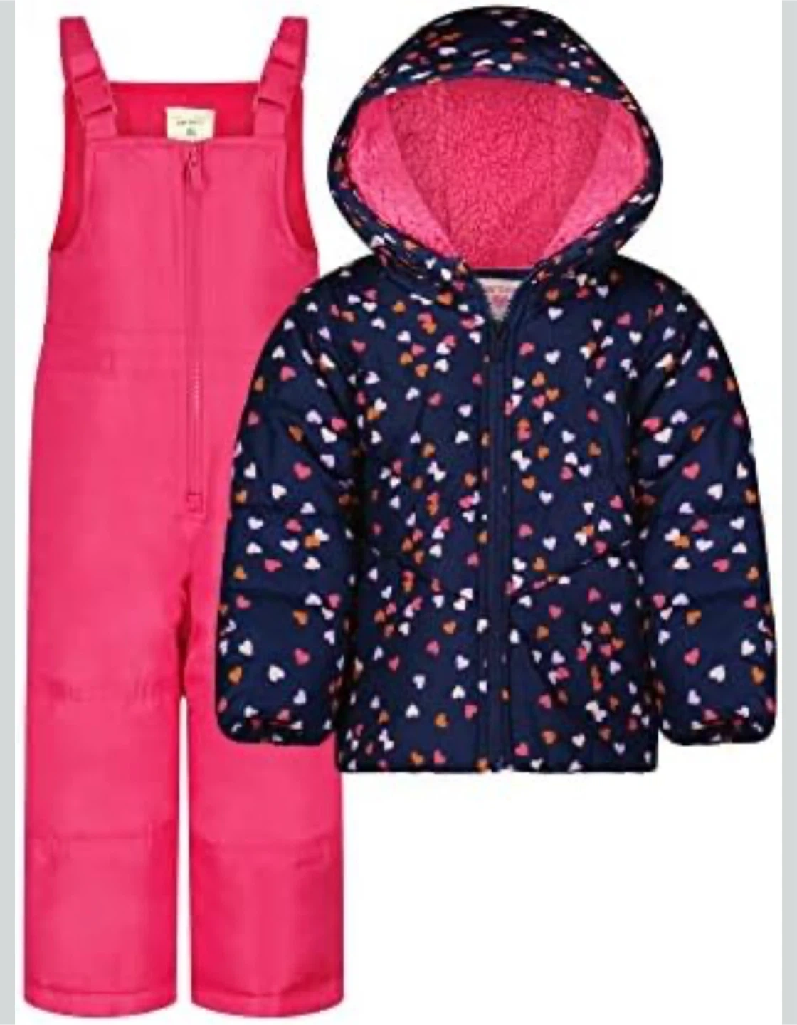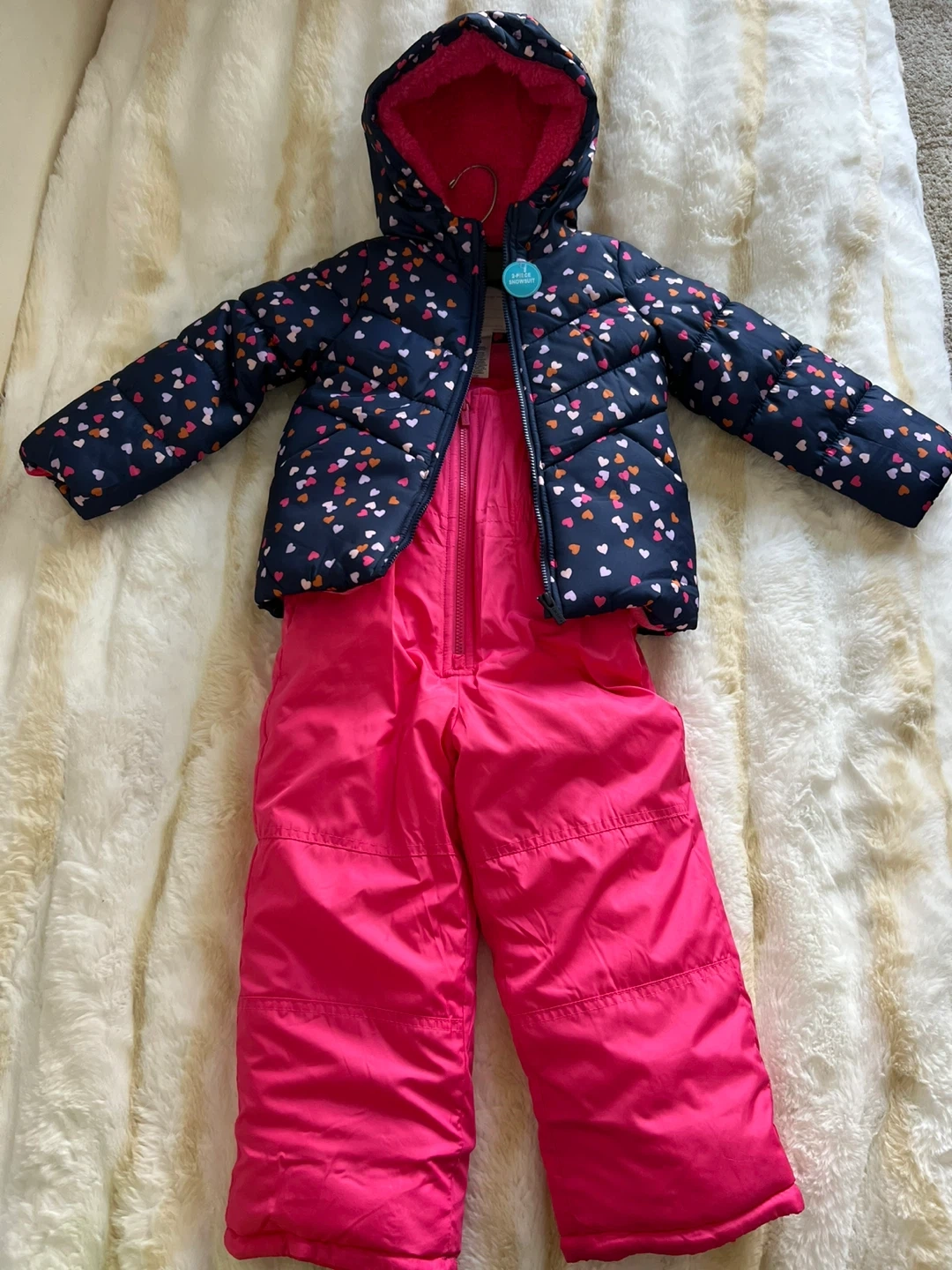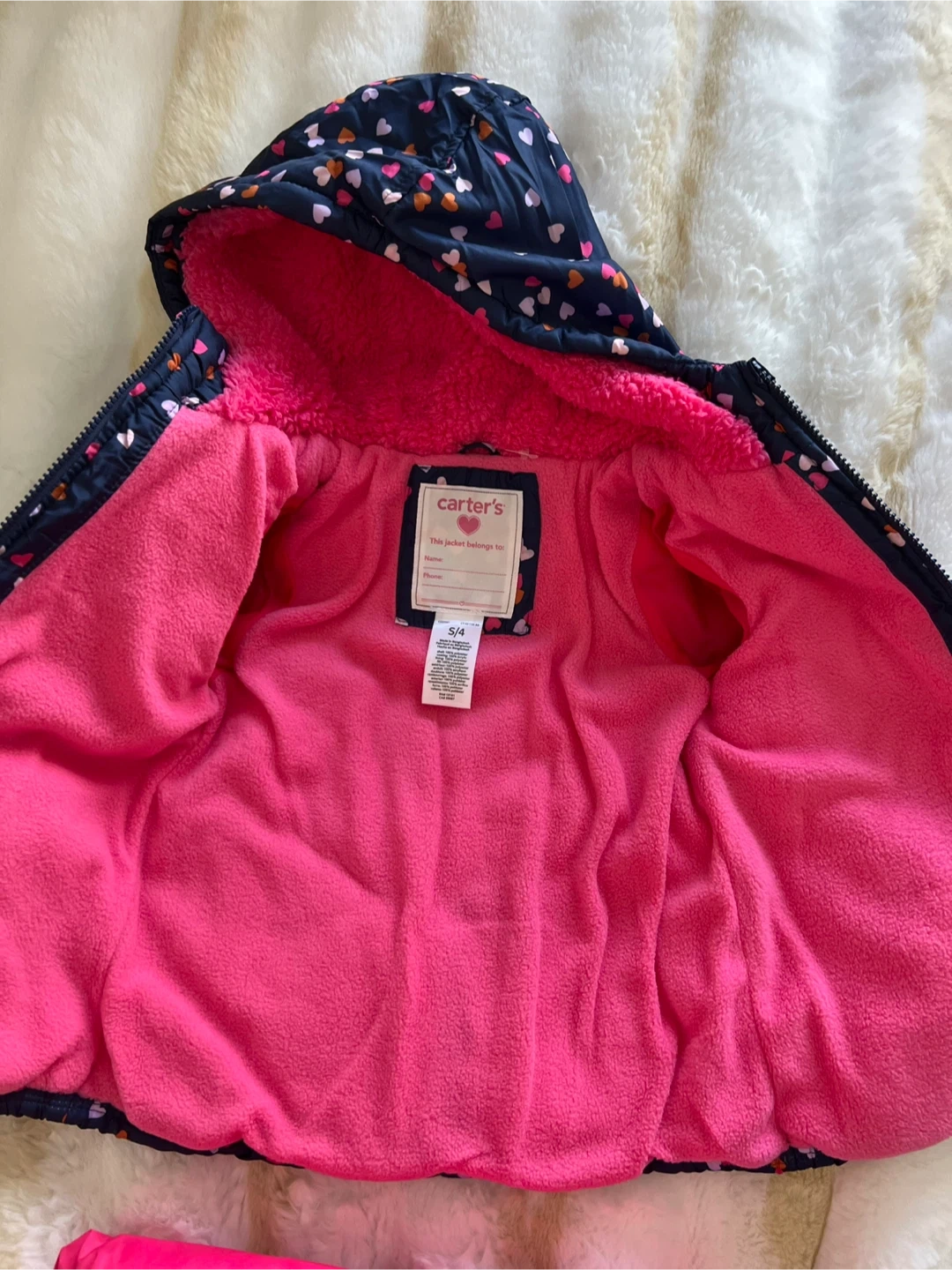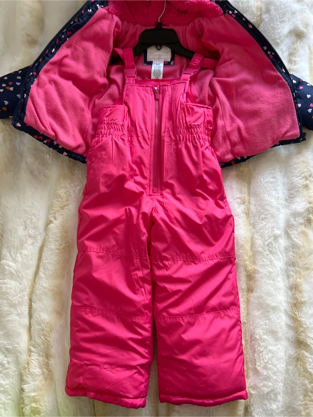 131Carter's 2-piece snowsuit in size 4. The jacket is navy blue with a heart print and a pink fleece lining. The snow pants are bright pink. Perfect for keeping your little one warm and dry this winter!