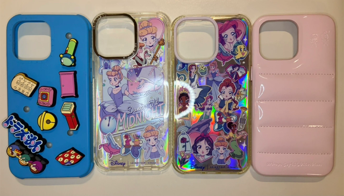 0iPhone15pro Max cases. Selling all as a bundle collection, of cute iPhone cases featuring Disney characters from Casetify and Skinnydip! There's a blue Casetify case with fun charms, two clear Skinnydip cases with Cinderella and various Disney princesses, and a pink quilted case from Urban Sophistication
