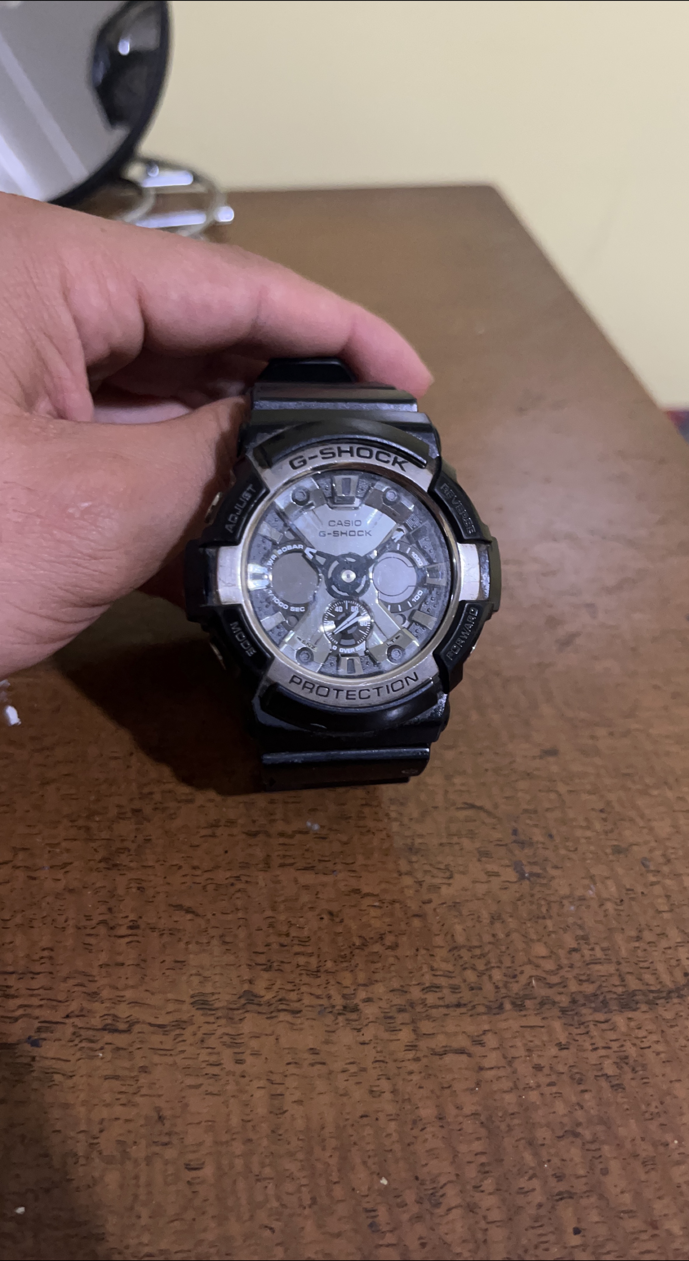 Selling a Casio G-Shock watch! It has a black band and a silver face with a lot of cool details. The watch features 'G-SHOCK' and 'PROTECTION' written on the bezel. It also has mode, adjust, forward and reverse buttons