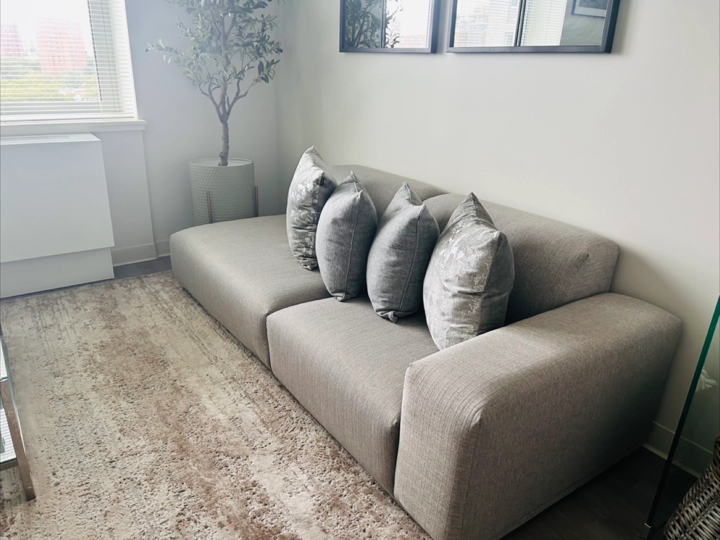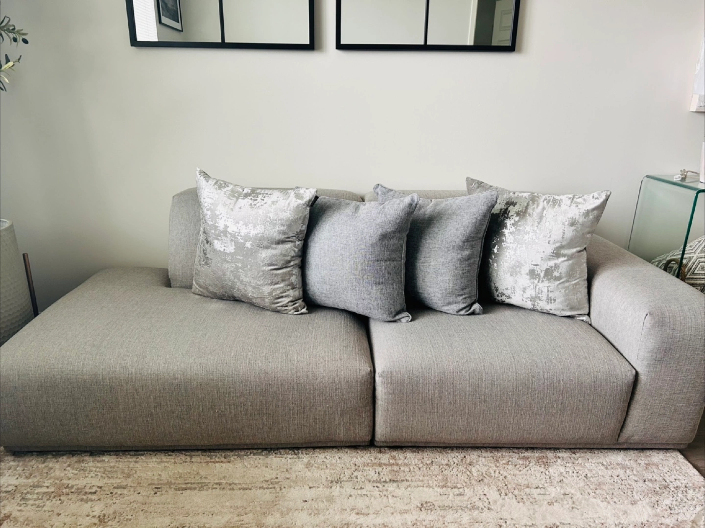 10Castlery Todd Chaise Sofa in light grey, This stylish and comfortable sofa is perfect for any living space. Its modular design allows for versatile configurations and upholstery provides a cozy seating experience. It's in great condition and ready to find a new home!