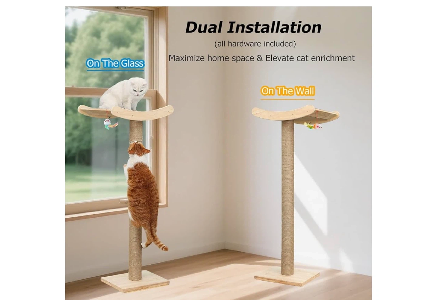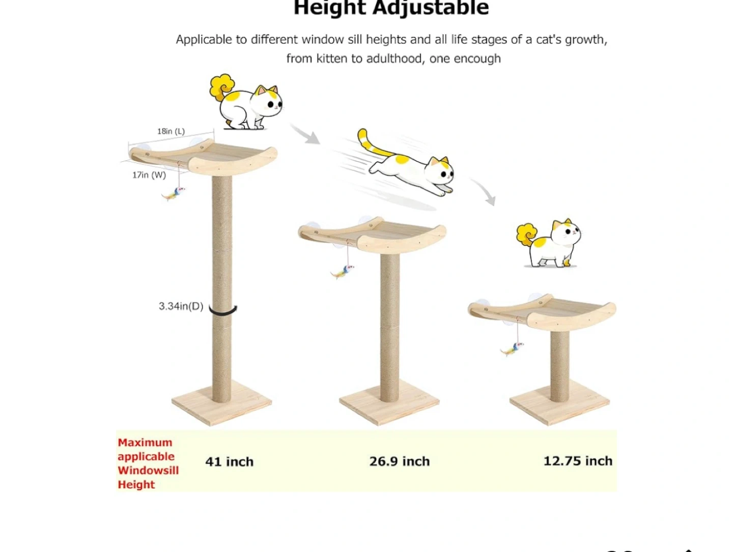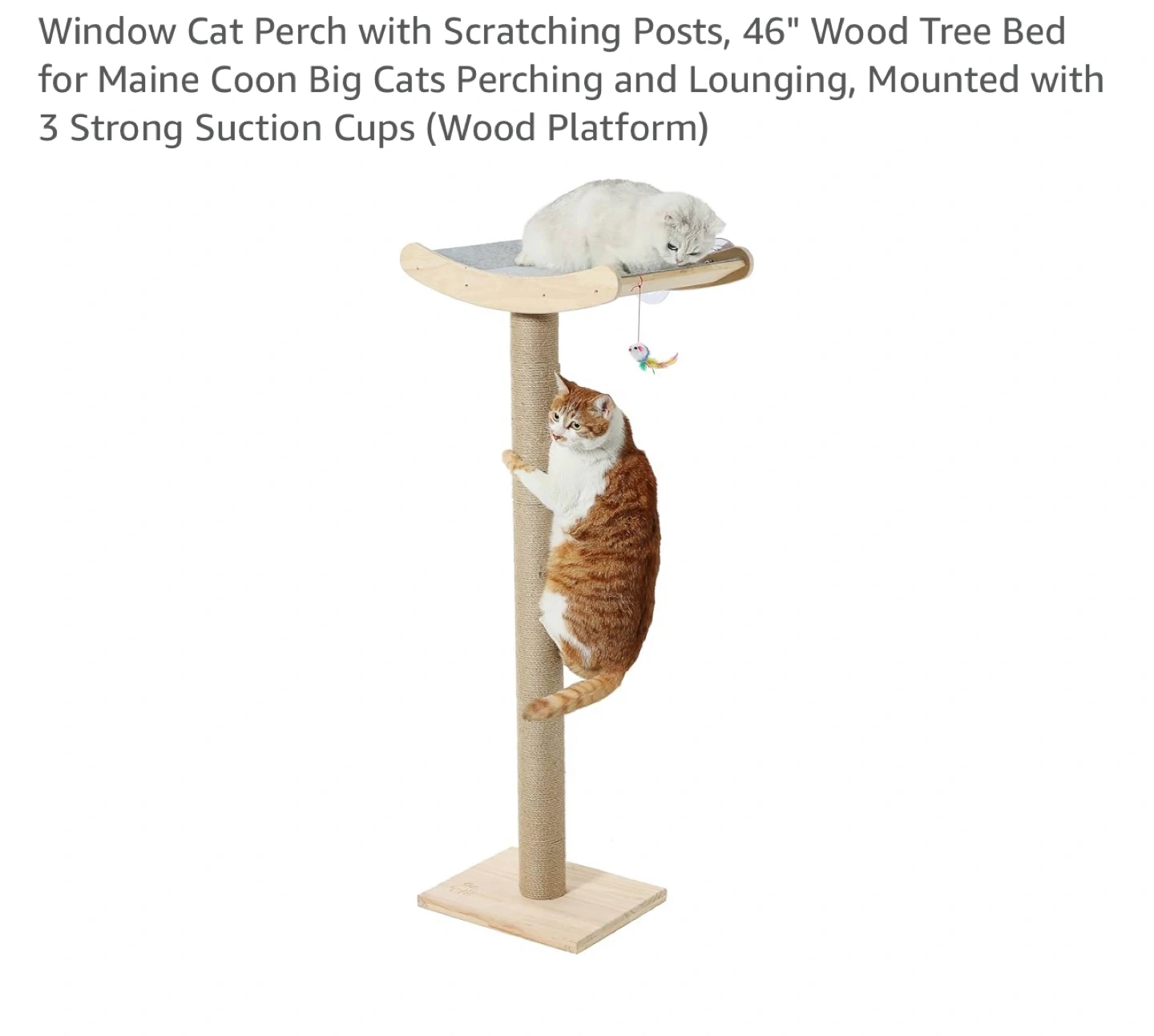 10This is a cat perch with scratching post. It's a 46" wood tree bed for Maine Coon Big Cats Perching and Lounging. It can be mounted with 3 strong suction cups on a wood platform. It features dual installation and maximizes home space and elevates cat enrichment. The scratching post is durable and made with a thicker quality PVC post for more sturdiness and stability. The height is adjustable to fit different windowsill heights and all life stages of a cat's growth, from kitten to adulthood. Dimensions are 18in (L) x 17in (W) x 3.34in (D).