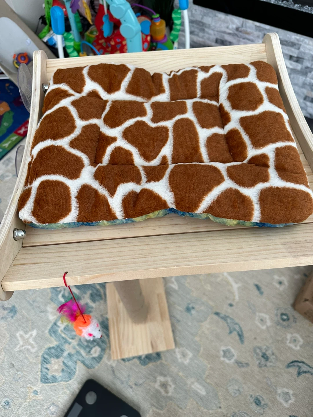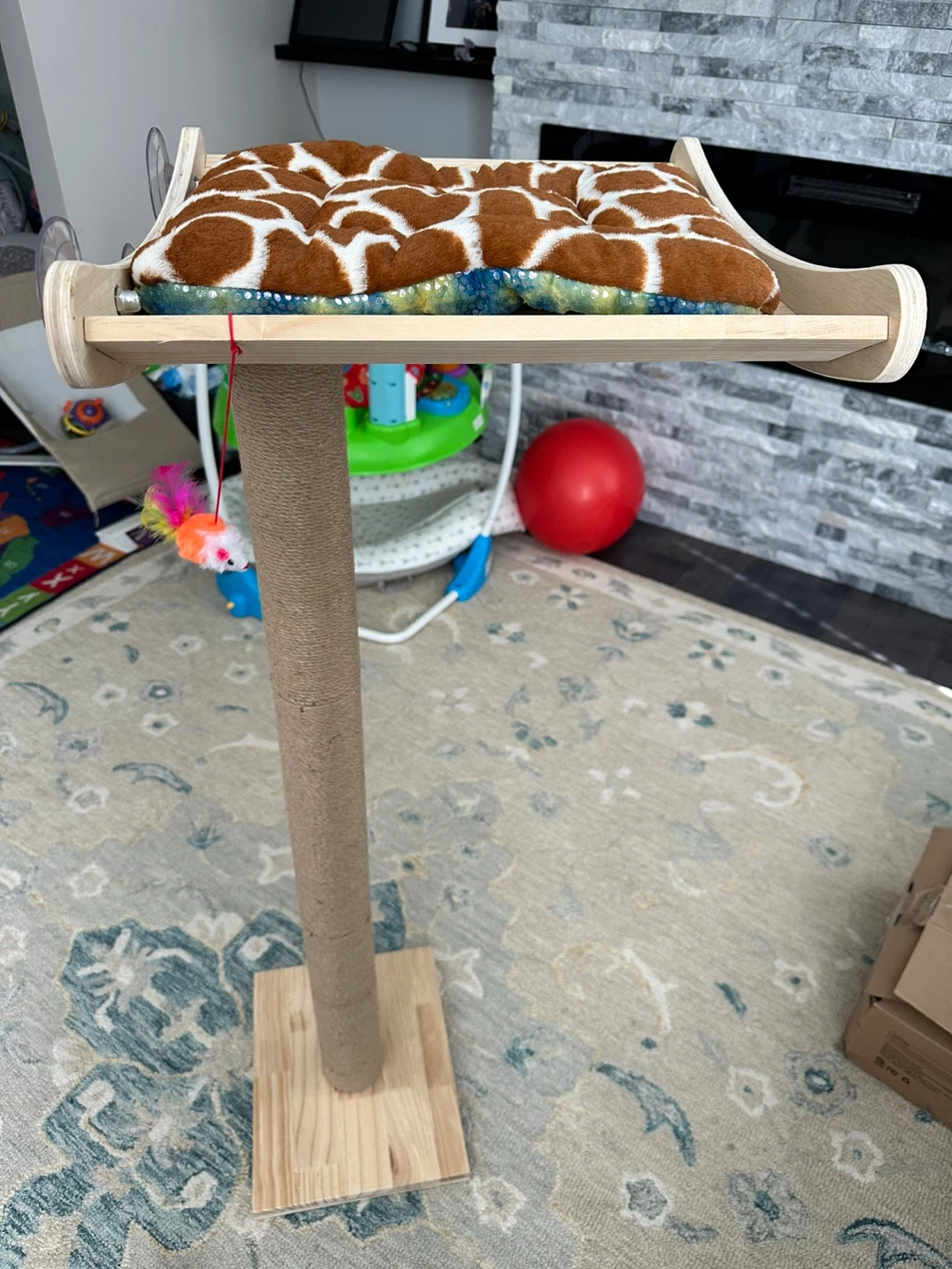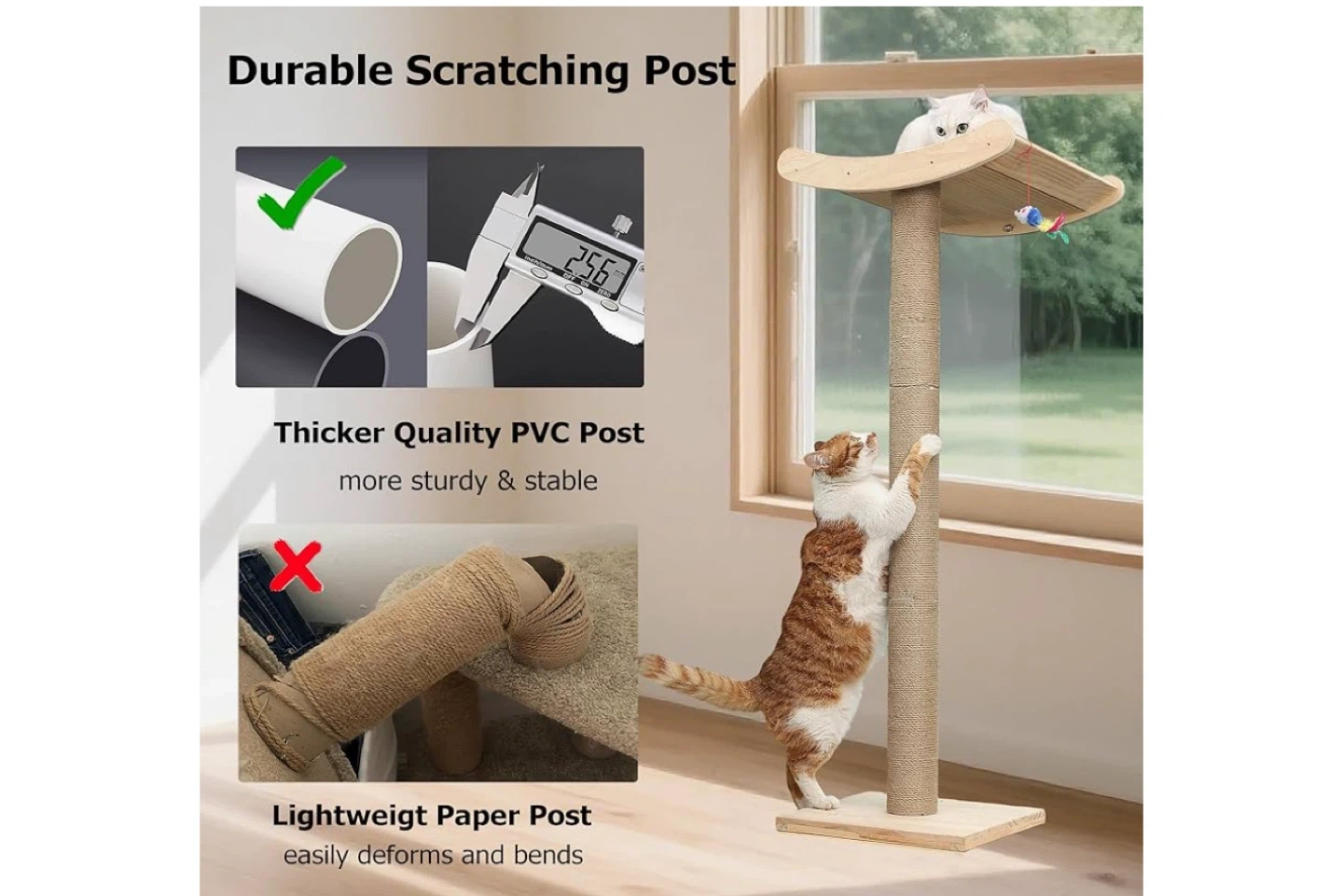 10This is a cat perch with scratching post. It's a 46" wood tree bed for Maine Coon Big Cats Perching and Lounging. It can be mounted with 3 strong suction cups on a wood platform. It features dual installation and maximizes home space and elevates cat enrichment. The scratching post is durable and made with a thicker quality PVC post for more sturdiness and stability. The height is adjustable to fit different windowsill heights and all life stages of a cat's growth, from kitten to adulthood. Dimensions are 18in (L) x 17in (W) x 3.34in (D).