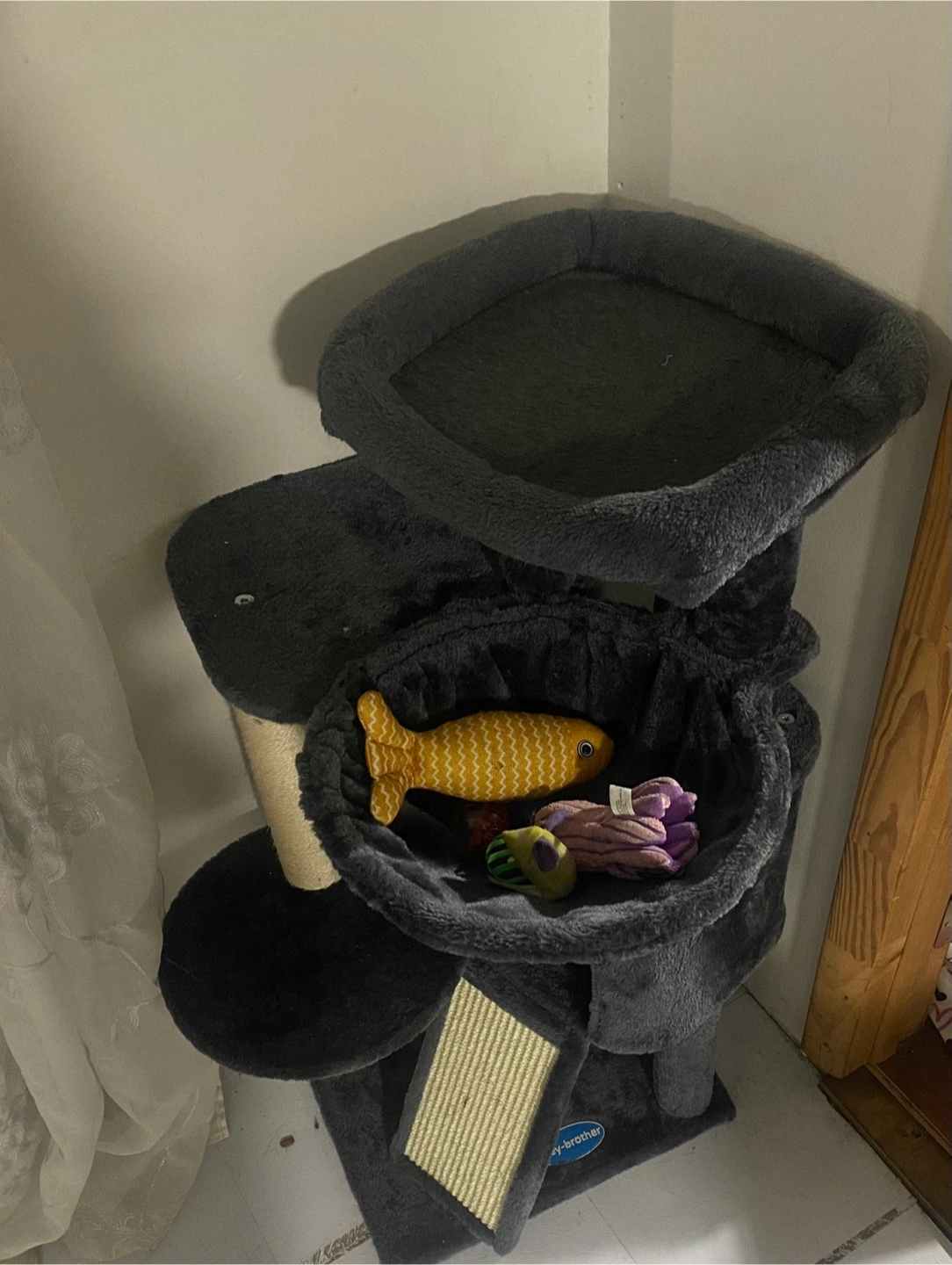 My cat prefers her beds and my furniture she barely used the tower and hasn’t used the scratchers bought for $50 .Cat tree with multiple levels. Featuring a top platform, a basket, and a scratching post. Your cat will love the cozy spots for napping.