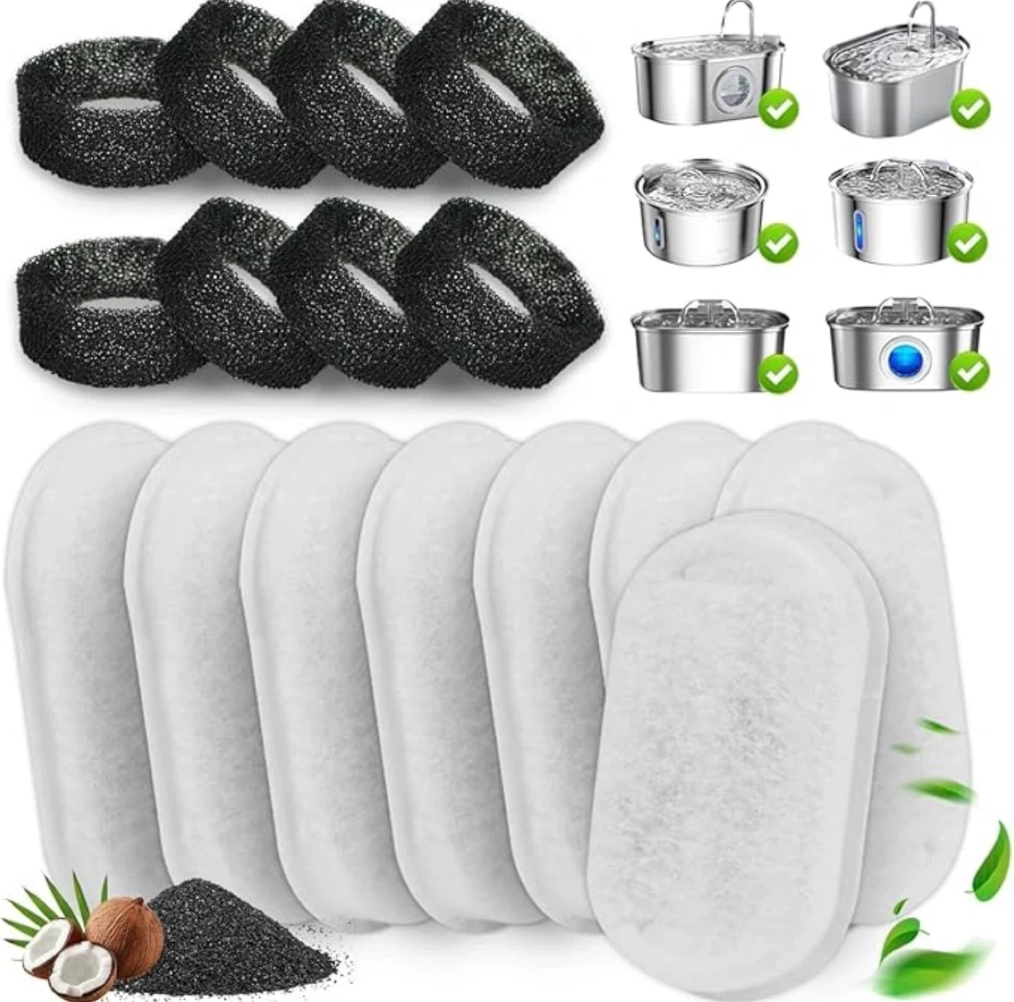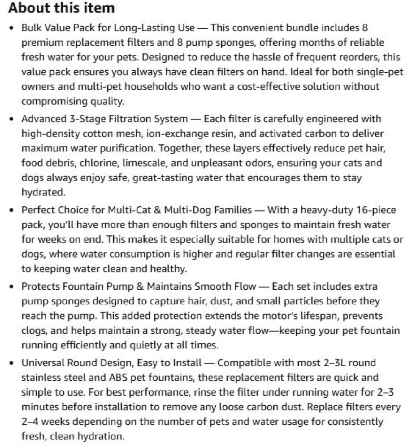 New!!! This is a 16-pack of cat water fountain filters with 8 pump sponges. It is designed for multi-pet households. The filters feature triple-layer purification: cotton mesh traps fur and debris, ion-exchange resin softens water and reduces heavy metals, and activated carbon removes odors while improving taste. The filters are compatible with most 2-3L round stainless steel or ABS pet fountains. For best results, rinse each filter before use and replace every 2-4 weeks.