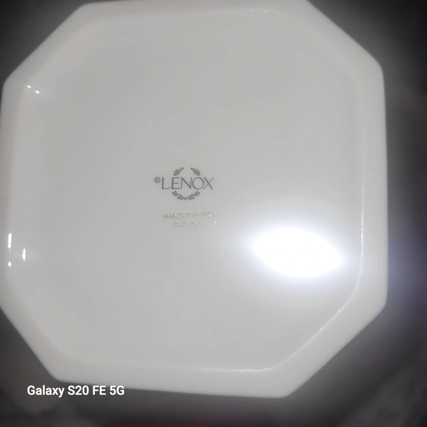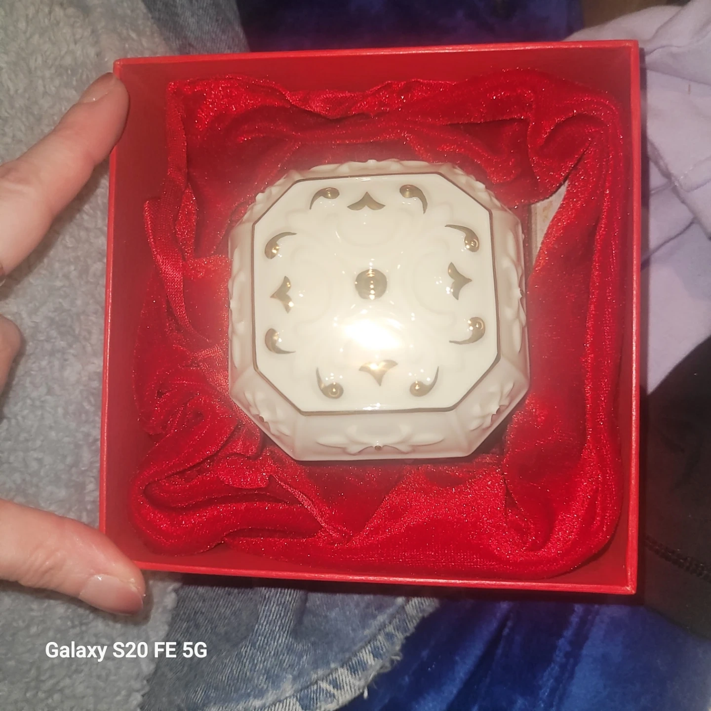 This is a beautiful octagonal white porcelain trinket box from Lenox. It features decorative gold accents and comes in its original red gift box lined with satin fabric. It's perfect for storing small keepsakes or jewellery!