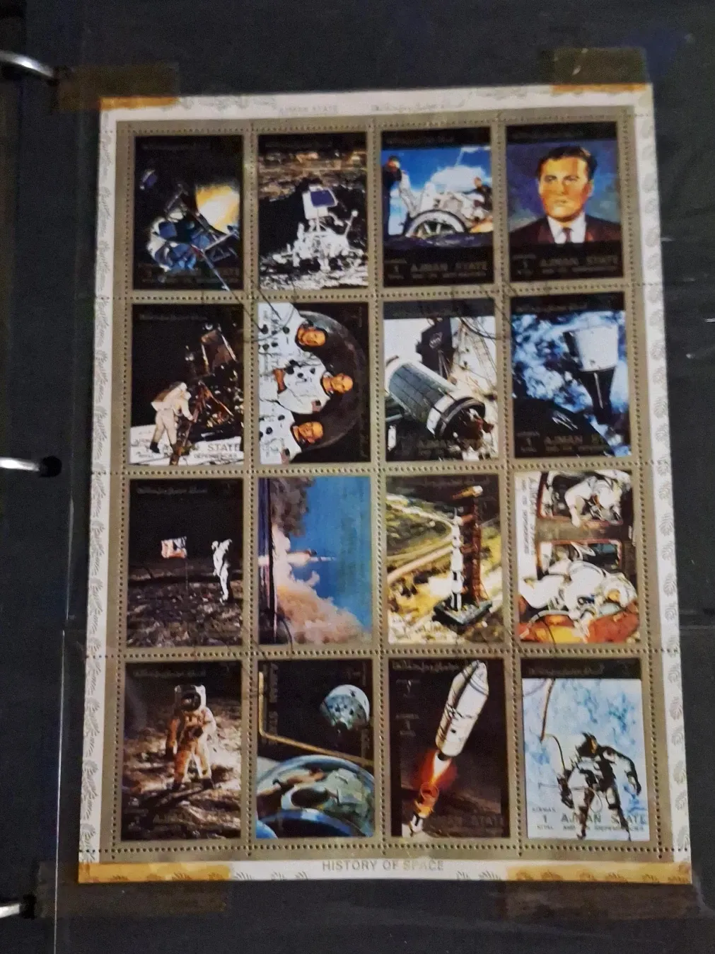 This is a sheet of stamps depicting the history of space exploration. It includes images of astronauts, rockets, and other space-related events. The sheet is titled 'History of Space'.