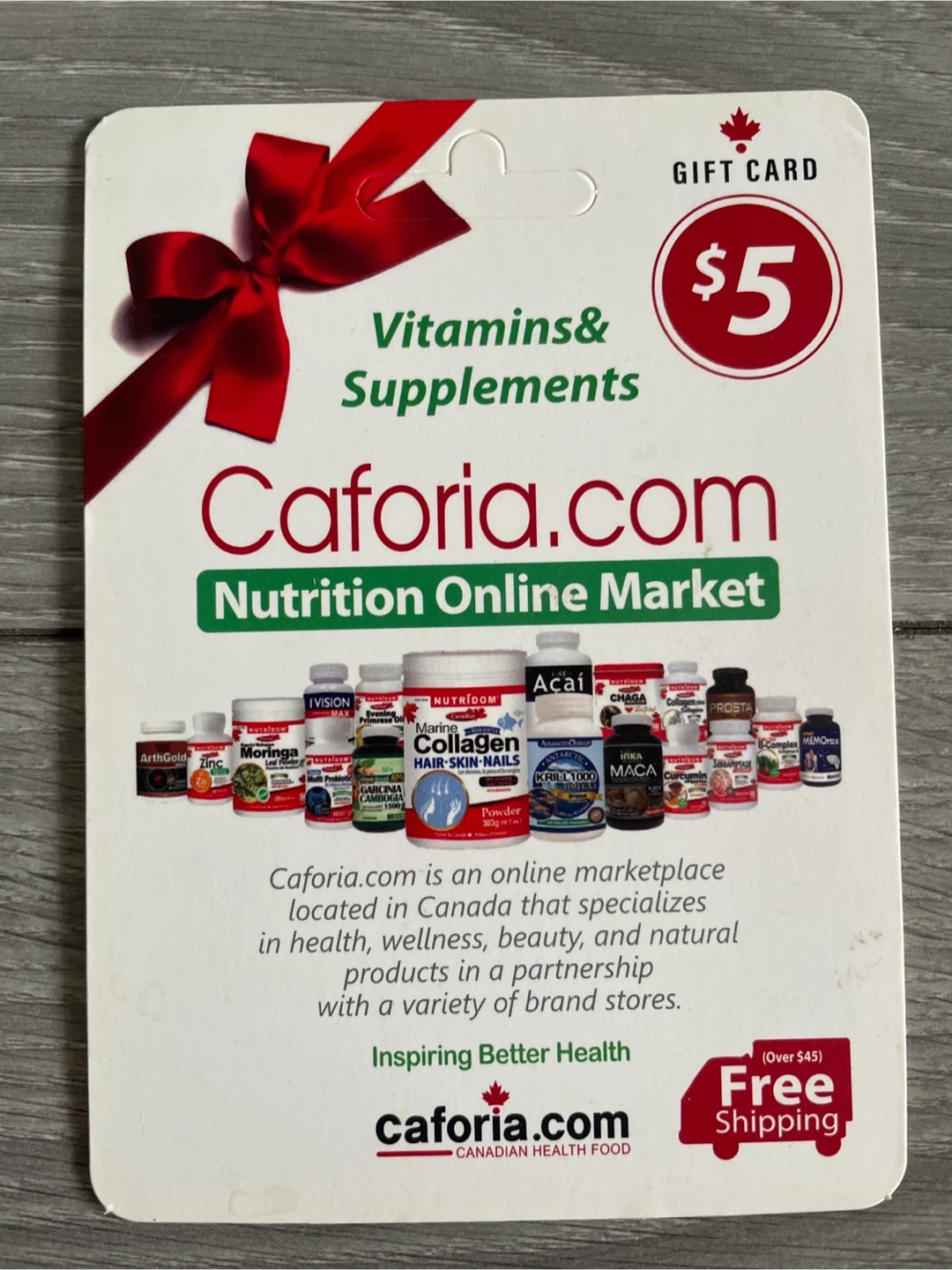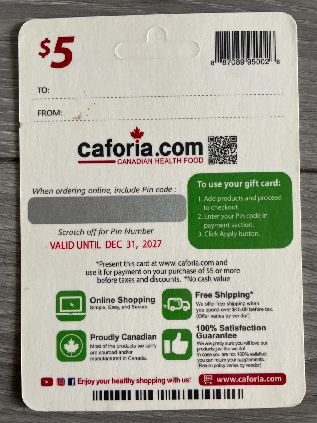 This is a $5 gift card for Caforia.com, a Canadian online market for health, wellness, beauty, and natural products. It's valid until December 31, 2027. Use it for online shopping on their website.