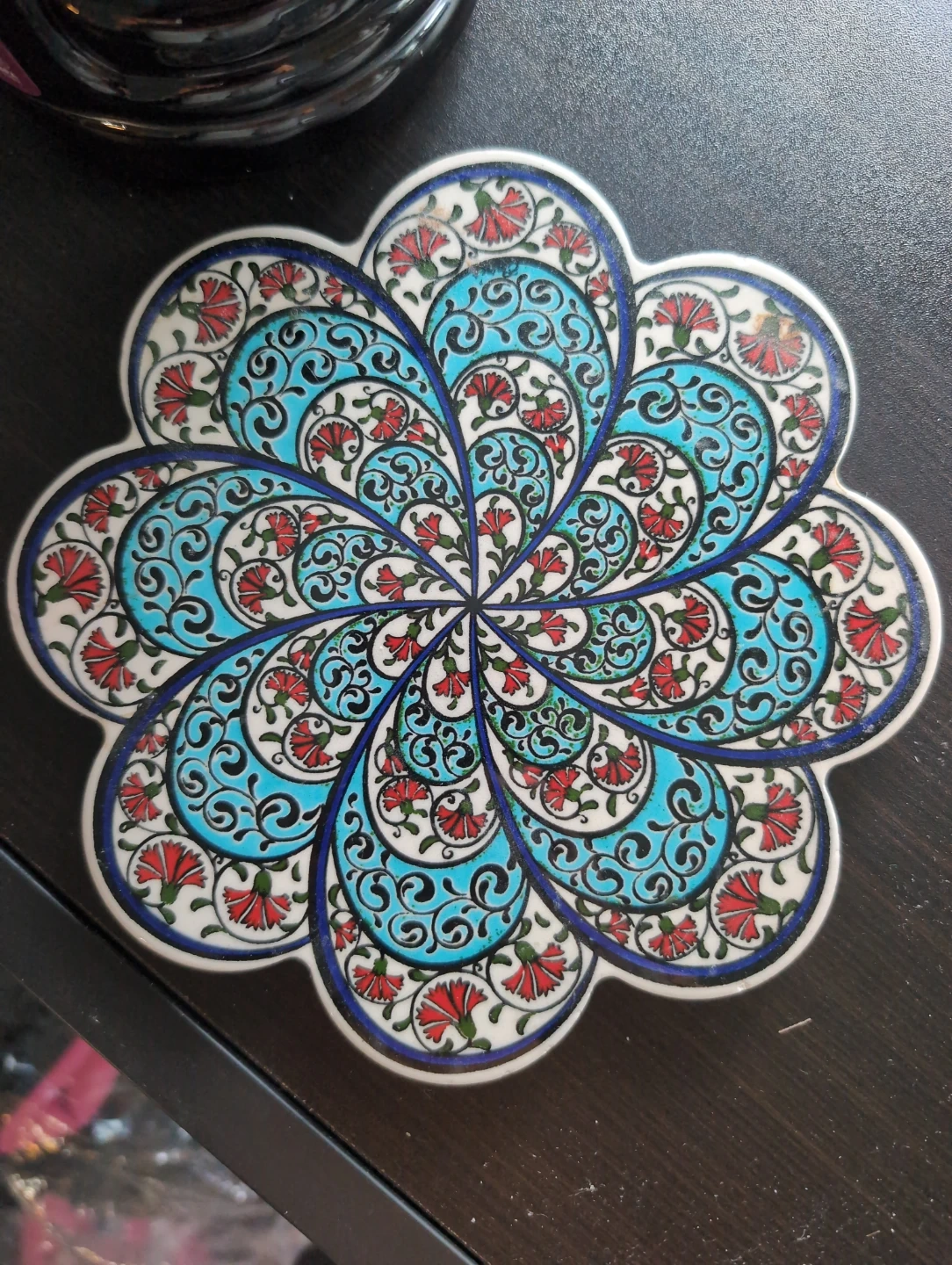 A beautiful ceramic coaster featuring a vibrant floral and scrollwork design in blue, red, and white. It's a lovely decorative piece. This coaster is perfect for protecting surfaces from drinks.