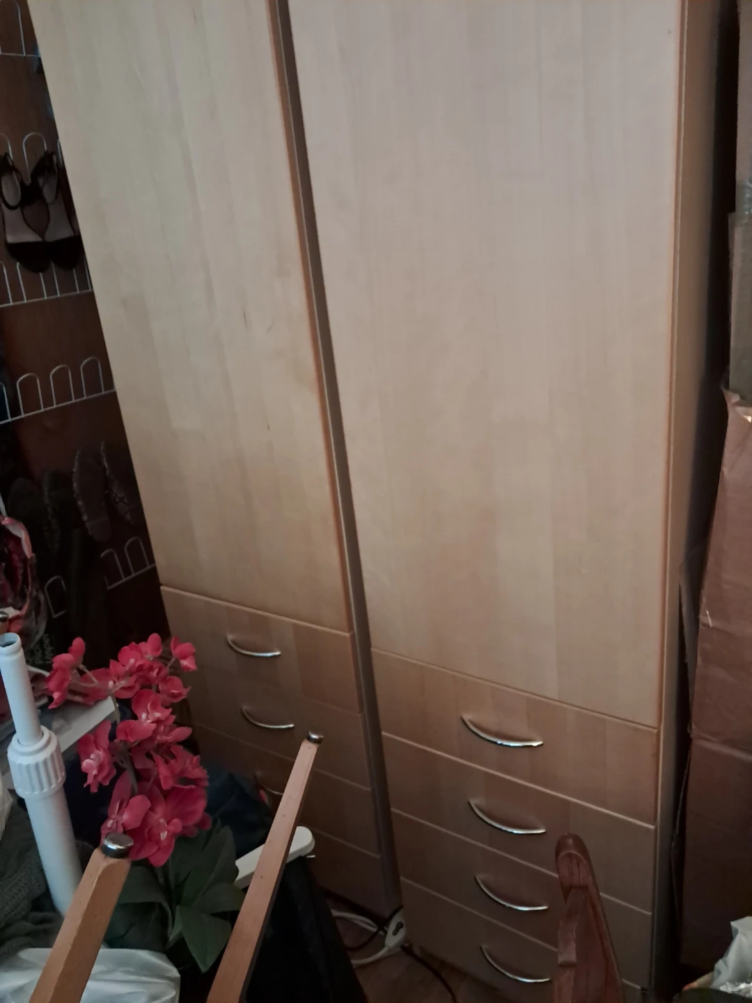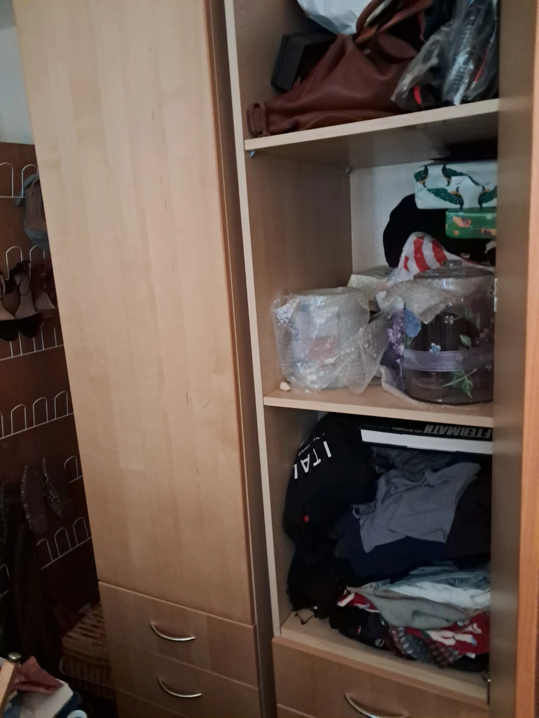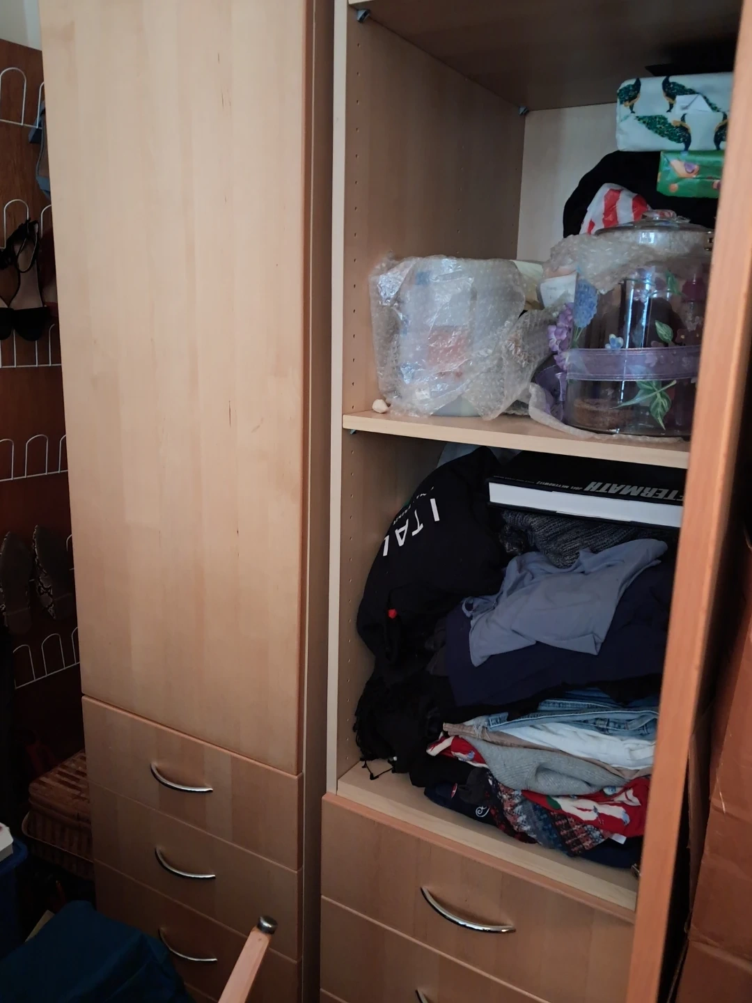 This is a light wood wardrobe with drawers. It has two large doors and multiple drawers at the bottom. Inside shelves are also visible, perfect for storing clothes and accessories. All drawers have solid bottoms, you must come take it away yourself, disassembled or whole, it will take 2 people to carry each unit. Had it in storage, just cannot take it with me.