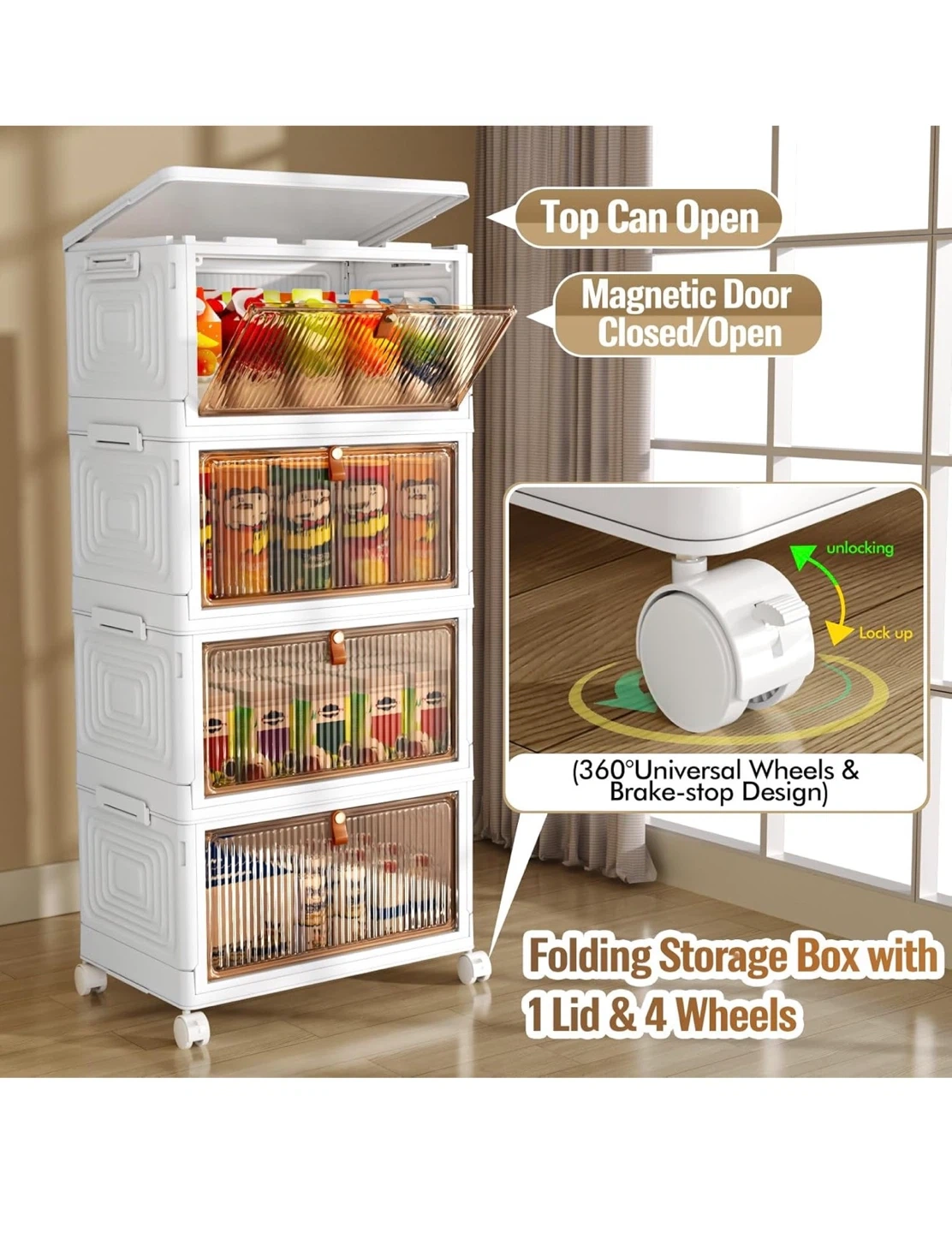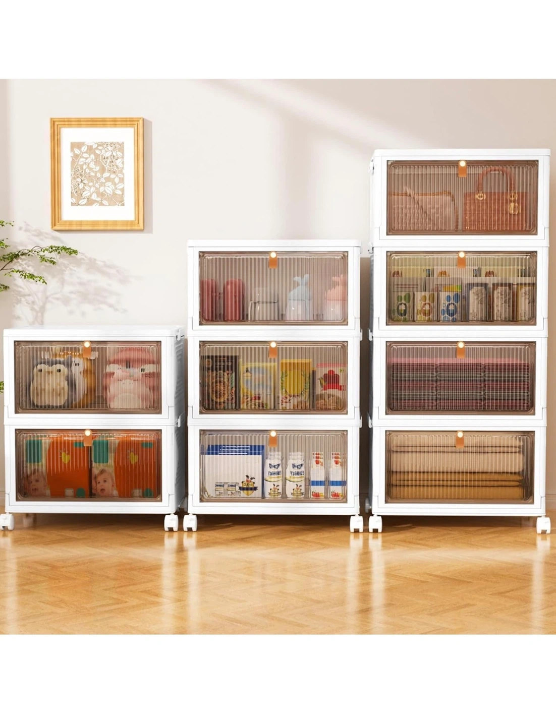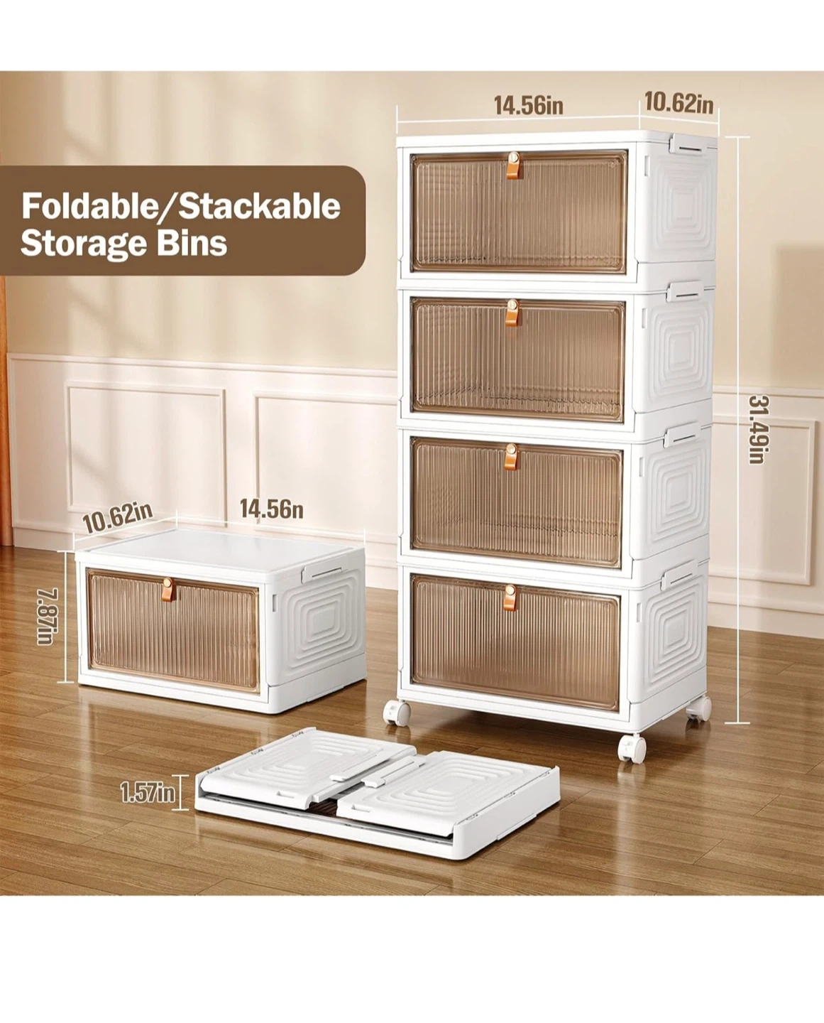 These stackable storage bins are made of plastic and feature a folding design. They include lids and wheels for easy mobility. Each bin measures 14.56" wide, 10.62" deep, and 7.87" tall. The entire unit stands 31.49" tall. The bins are stackable and the front doors have magnetic closures. They're great for organizing living rooms, offices, or dorms.