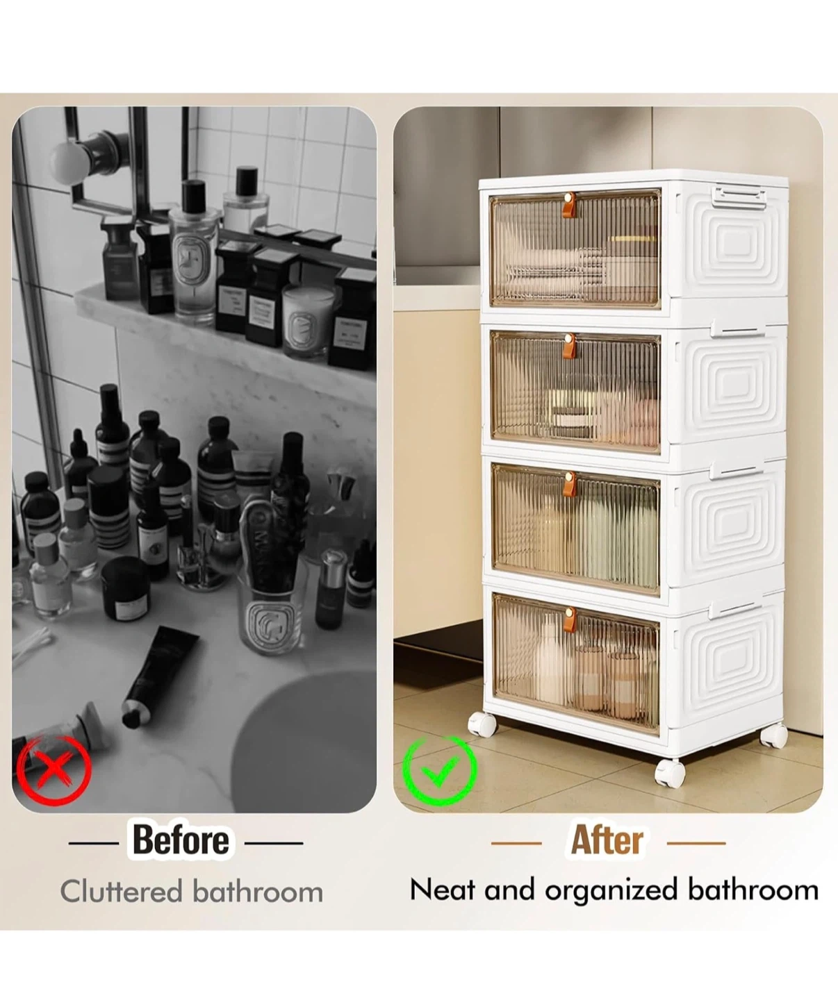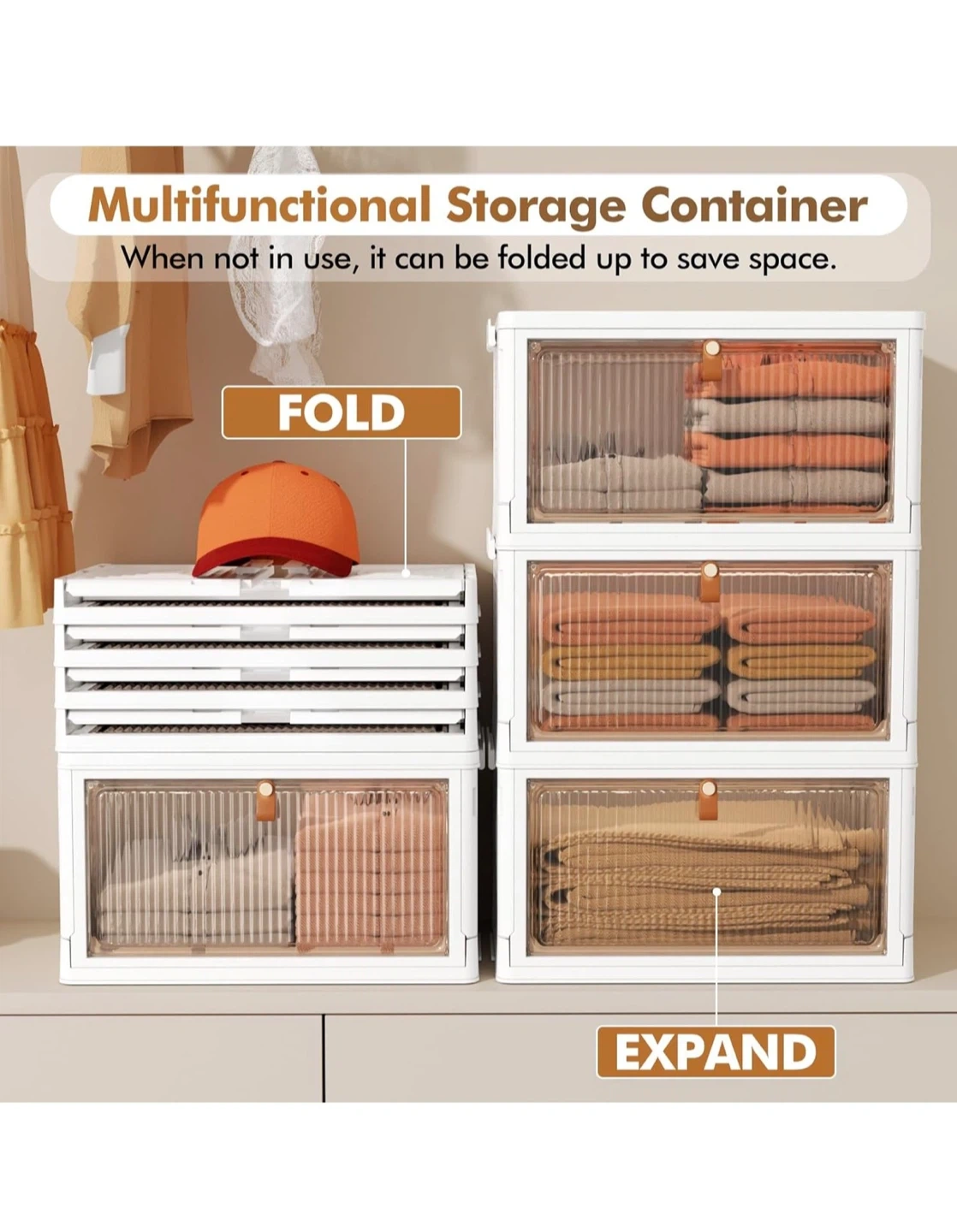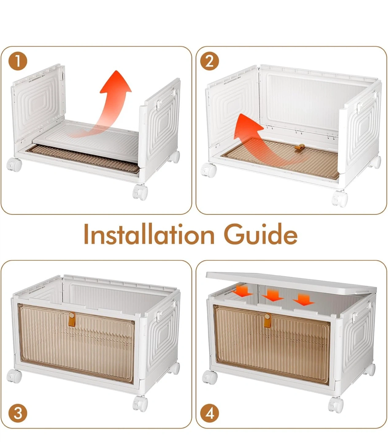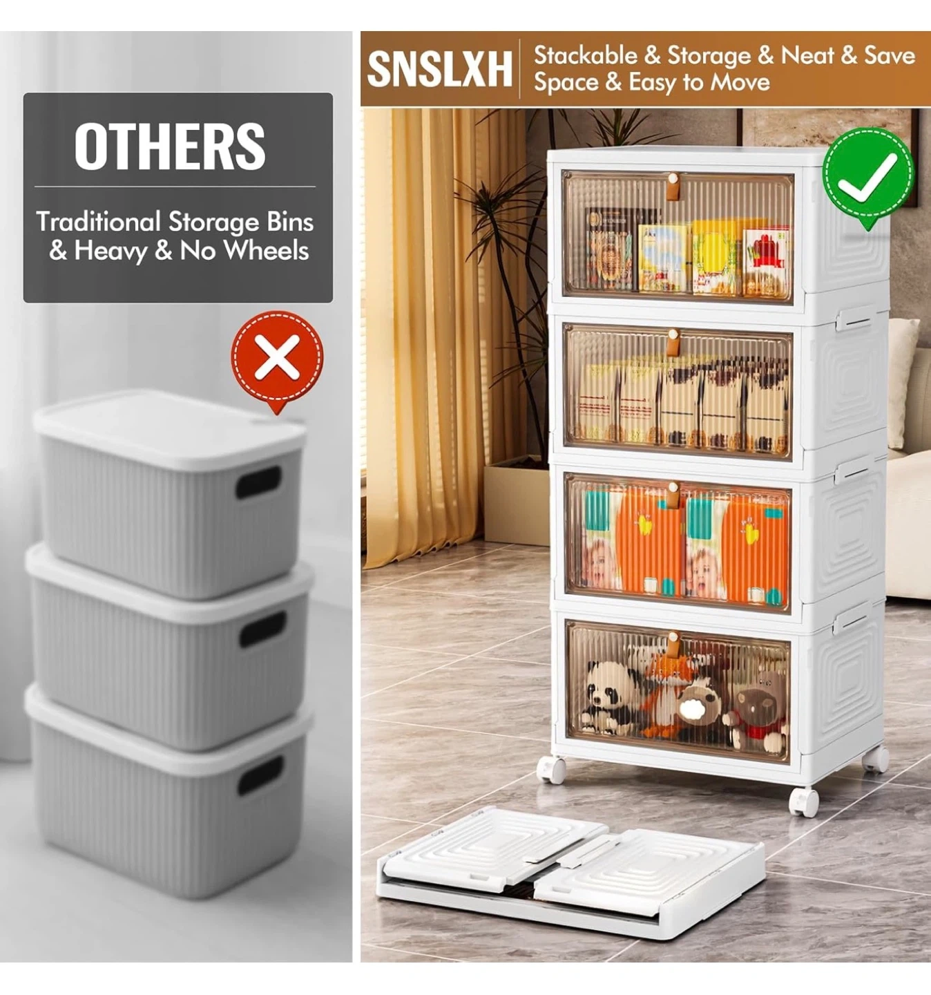 These stackable storage bins are made of plastic and feature a folding design. They include lids and wheels for easy mobility. Each bin measures 14.56" wide, 10.62" deep, and 7.87" tall. The entire unit stands 31.49" tall. The bins are stackable and the front doors have magnetic closures. They're great for organizing living rooms, offices, or dorms.
