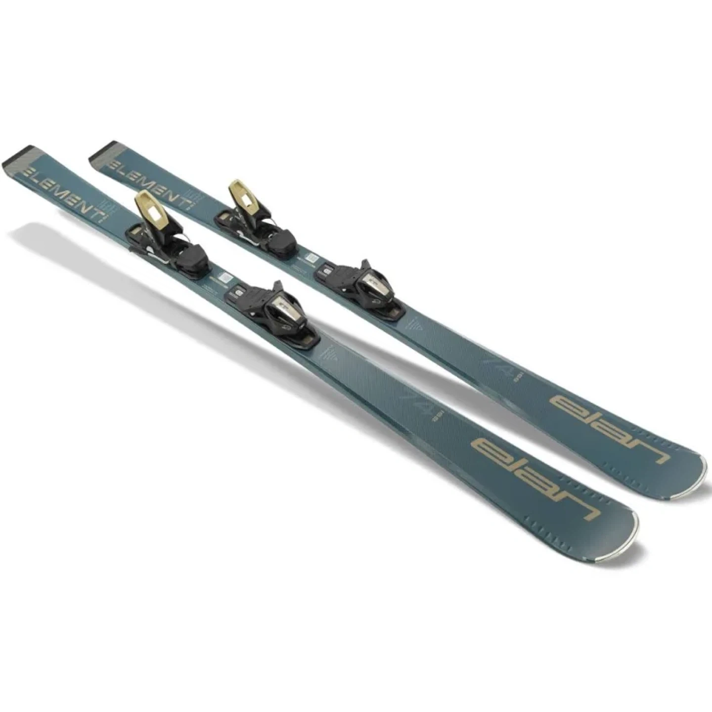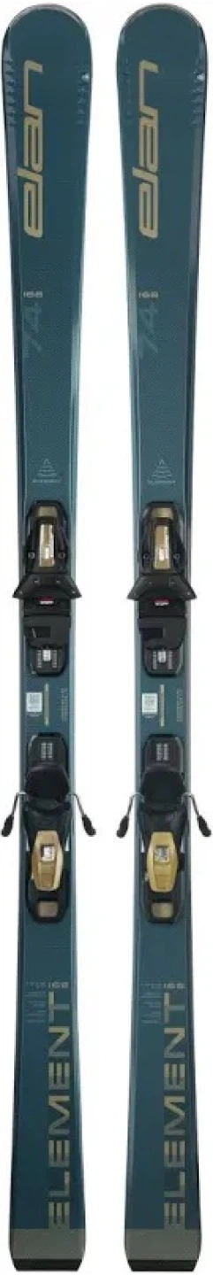 These are Elan Element 74 skis in Blue Shift. They come with bindings attached. This set is 168 cm long.