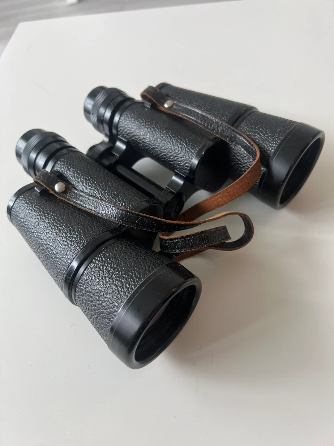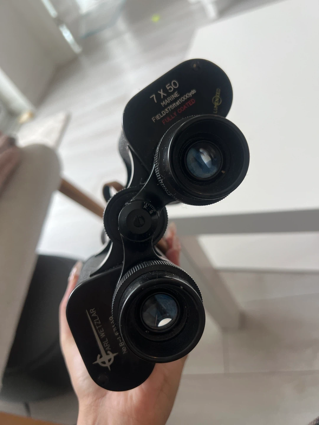 One of the lens is blurry. Vintage Luminar 7x50 Marine binoculars. Field 578ft at 1000yds. Fully coated optics. Includes a leather strap and carrying case. Great for marine observation!