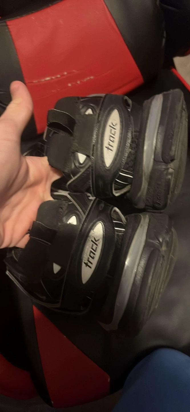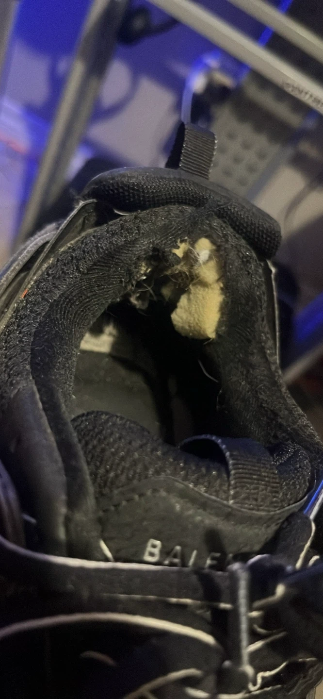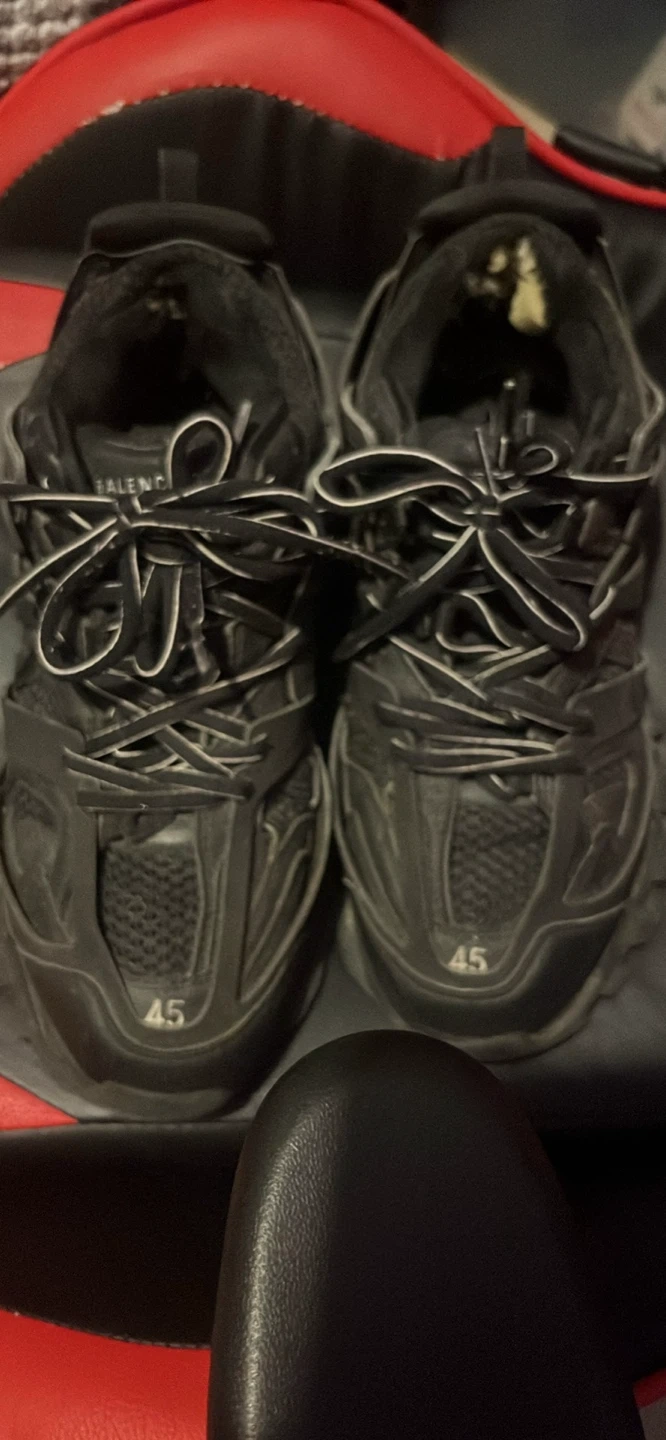 Black Balenciaga Track sneakers in a size 45. These shoes have a complex sole design and mesh detailing. Some wear is visible, especially on the inner lining near the heel.