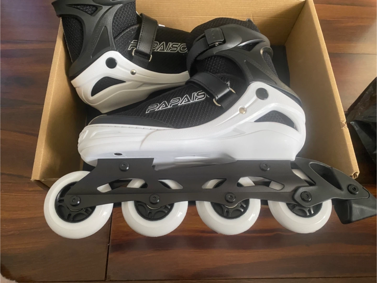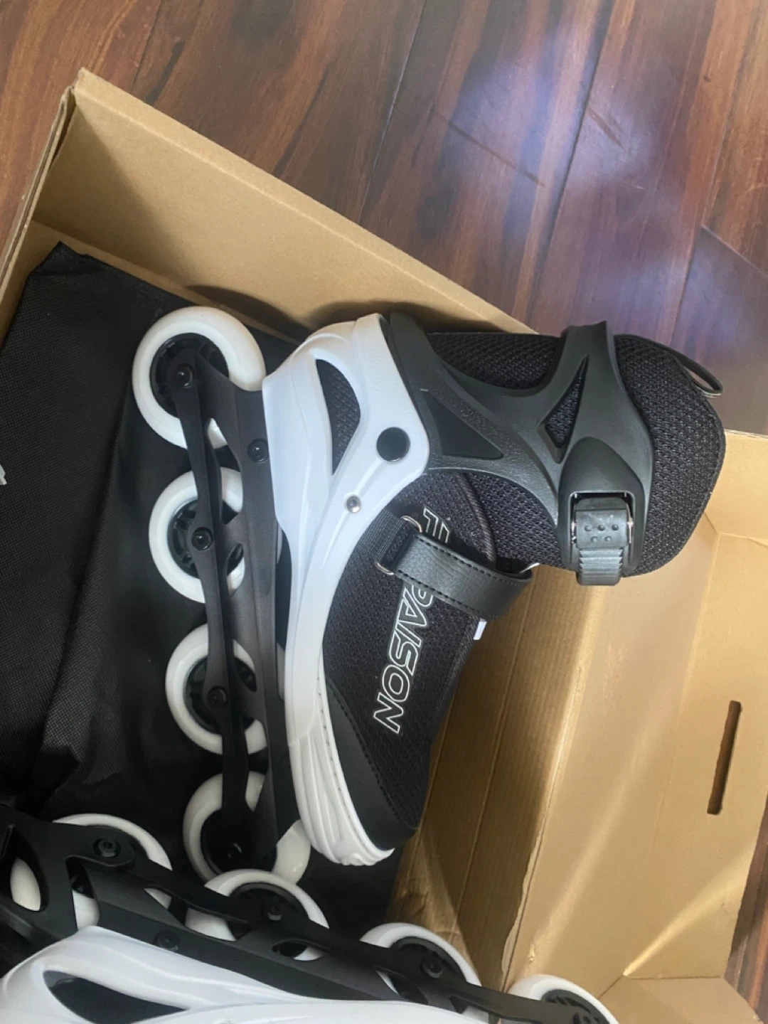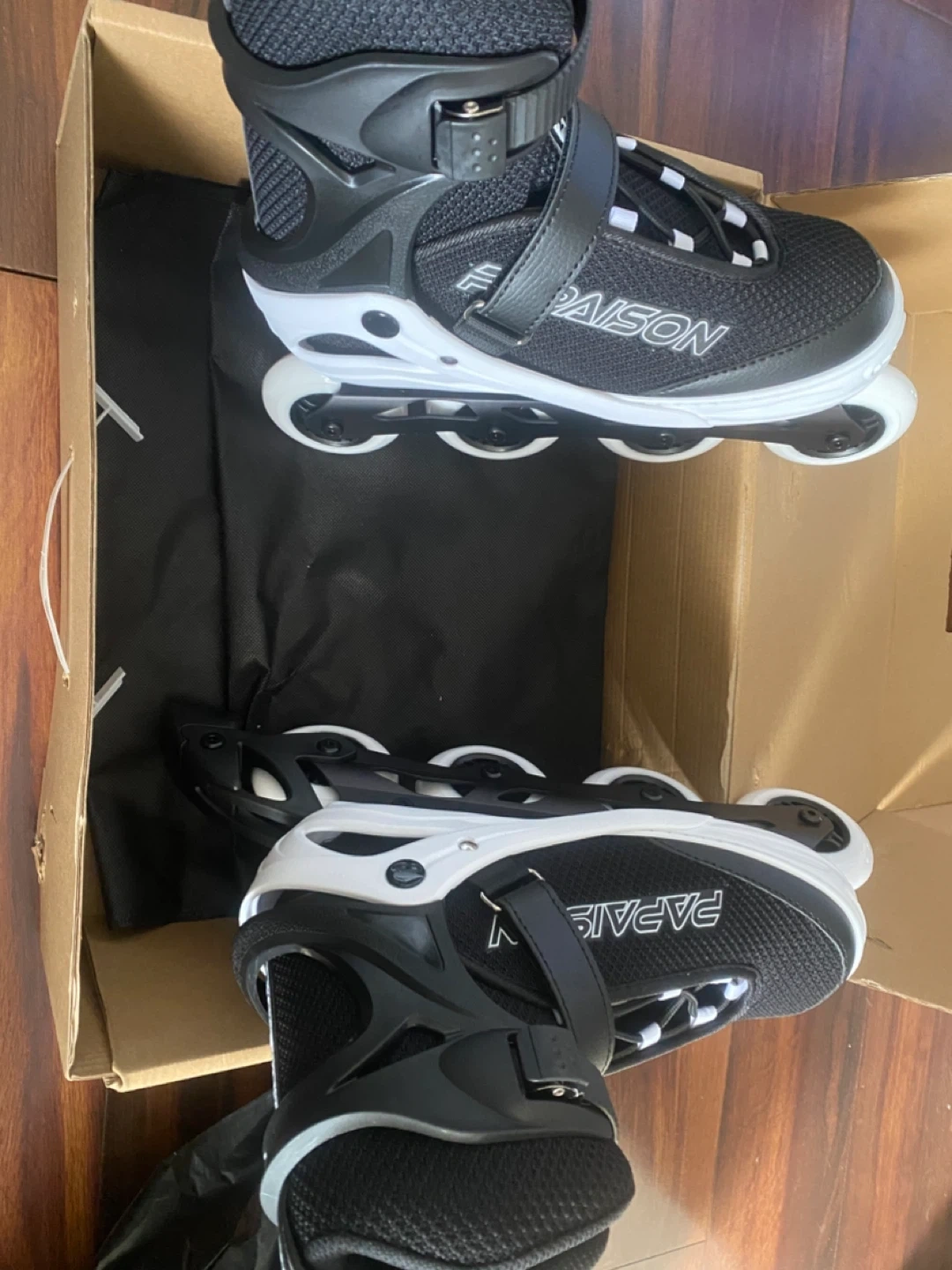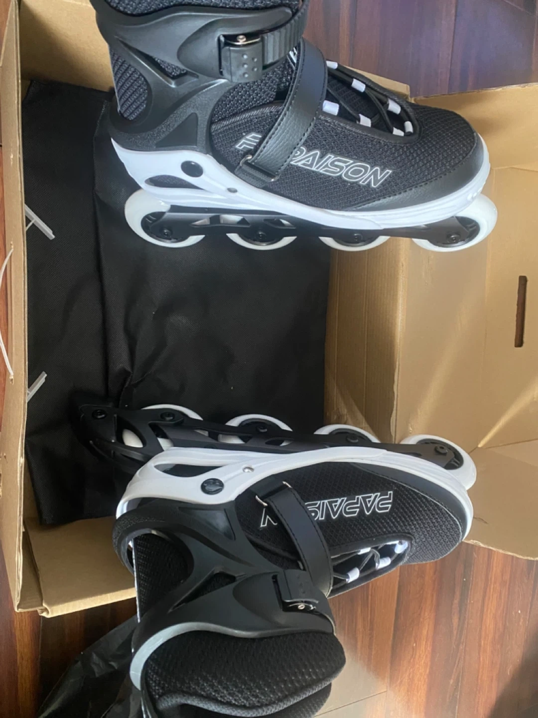 These PAISON adjustable inline skates are black and white. They come with a carrying bag. These are great for learning to skate! Size