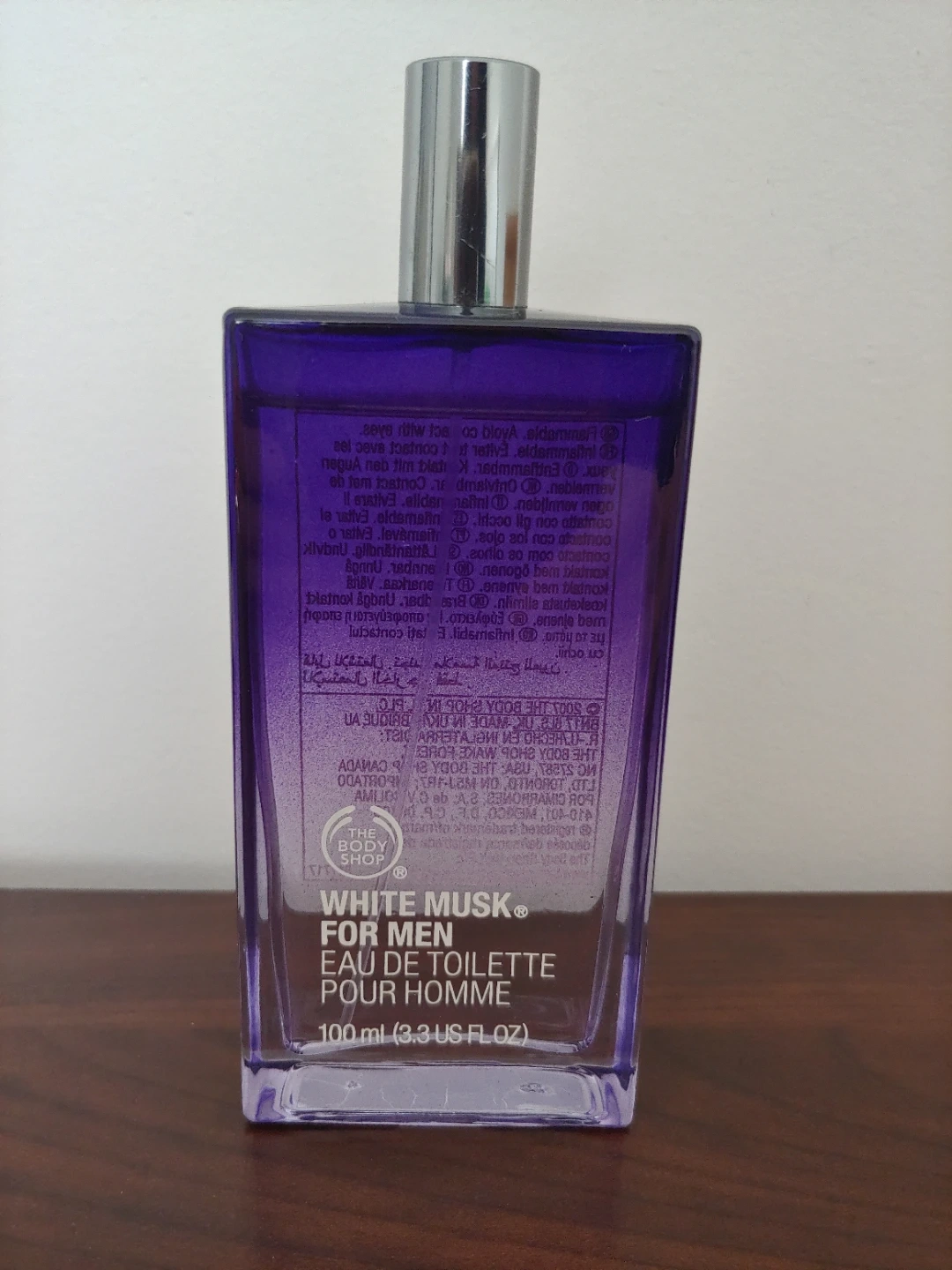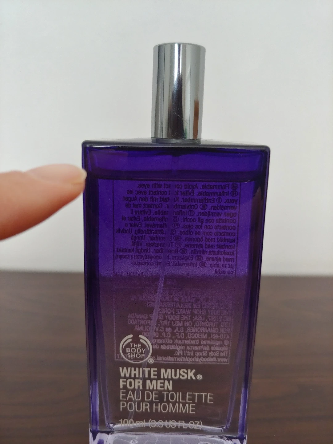 Partially used The Body Shop White Musk for Men Eau de Toilette. It's a 100 ml (3.3 US FL OZ) bottle. Photo shows the amount used, it's almost full.