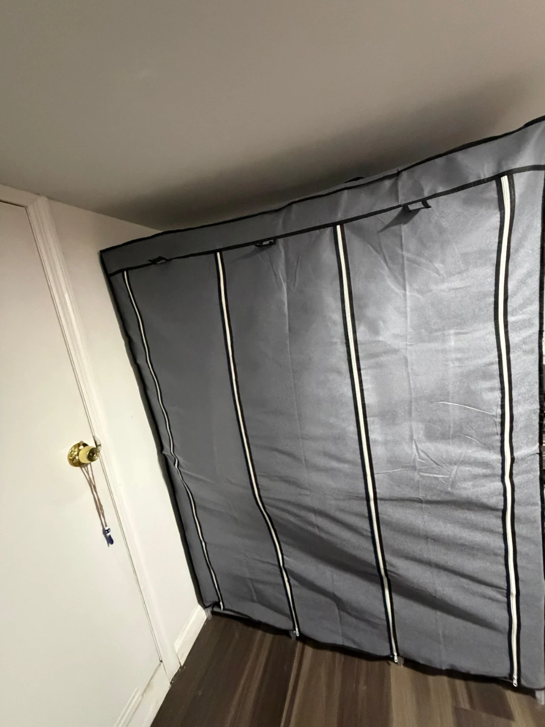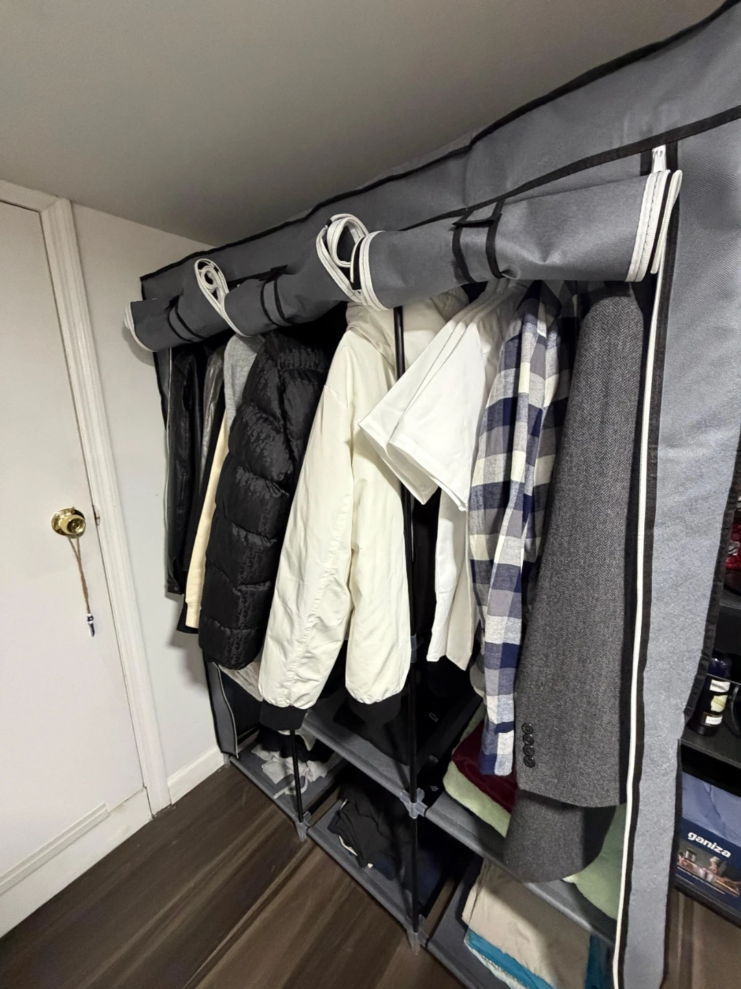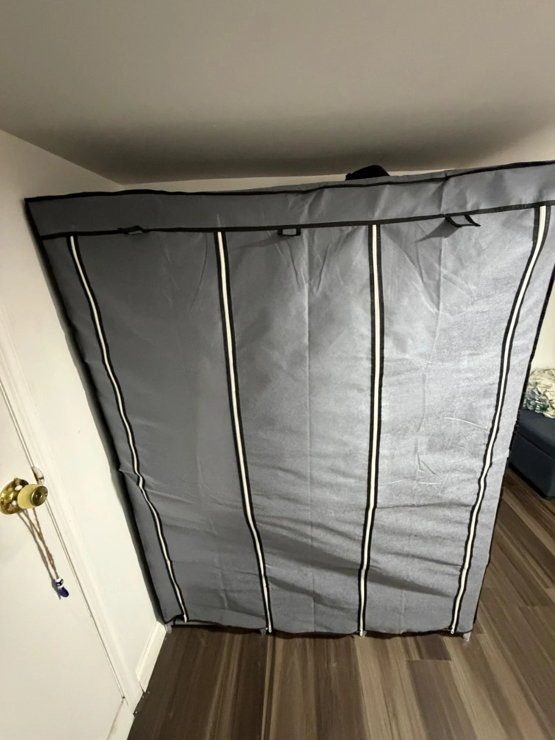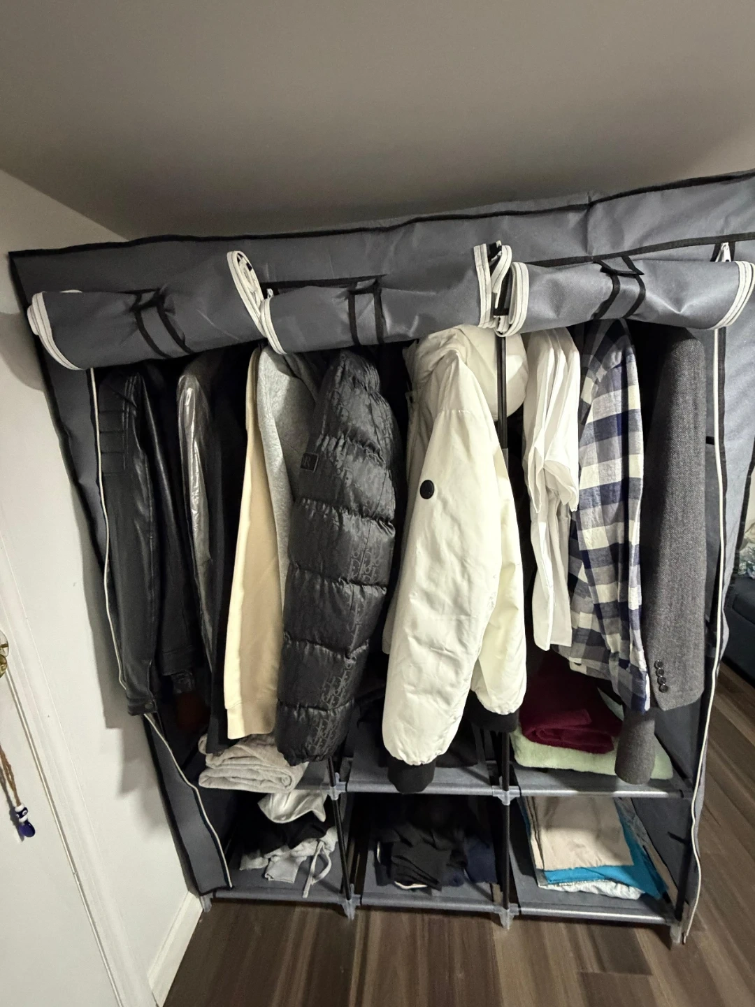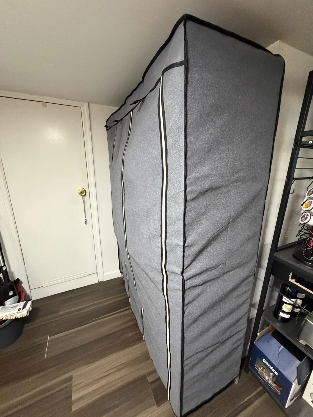 This is a portable wardrobe closet with a grey fabric cover. It's great for organizing clothes. It includes multiple shelves for folded items and a hanging rod for garments. The cover zips closed to keep dust out!
