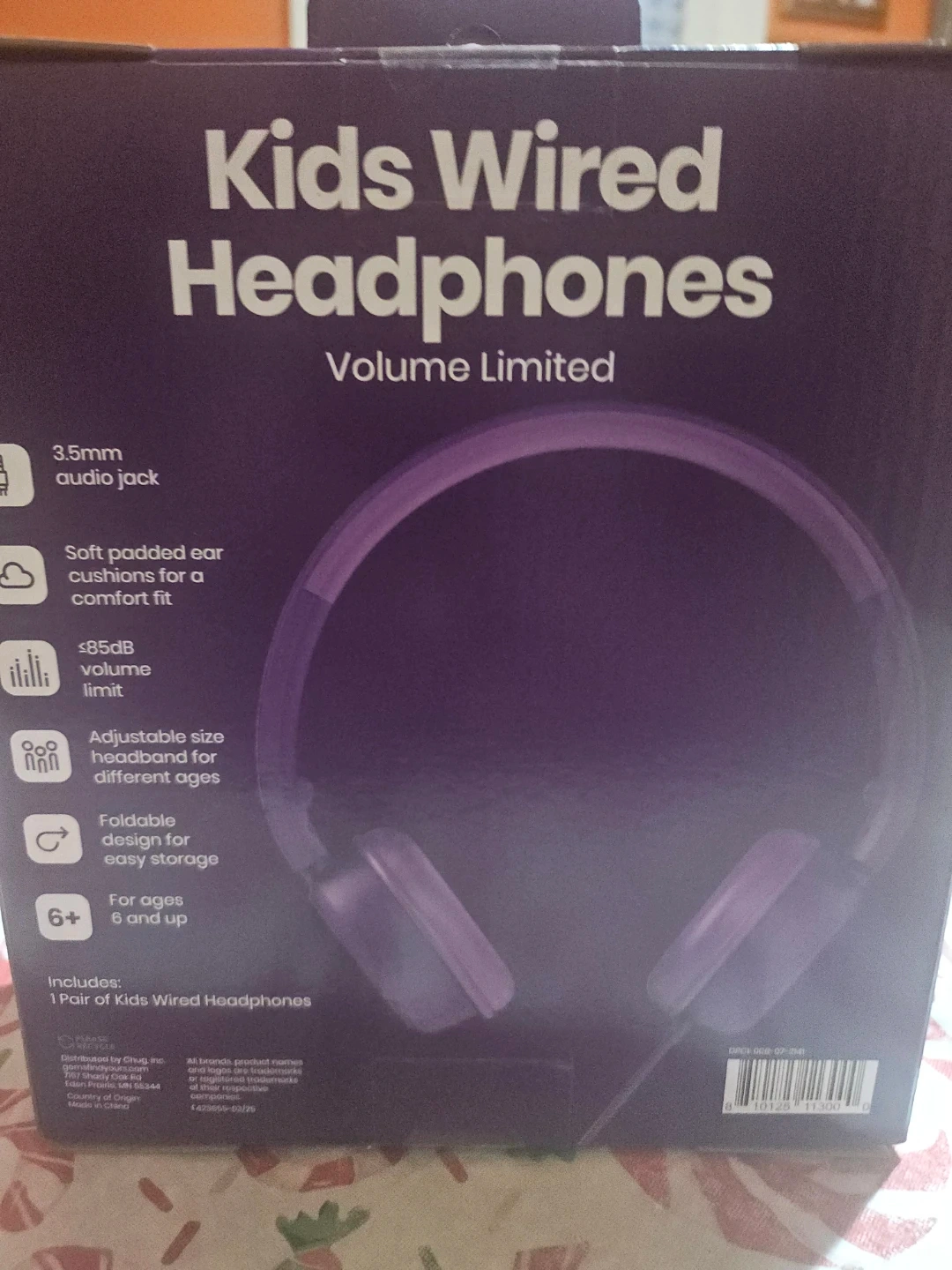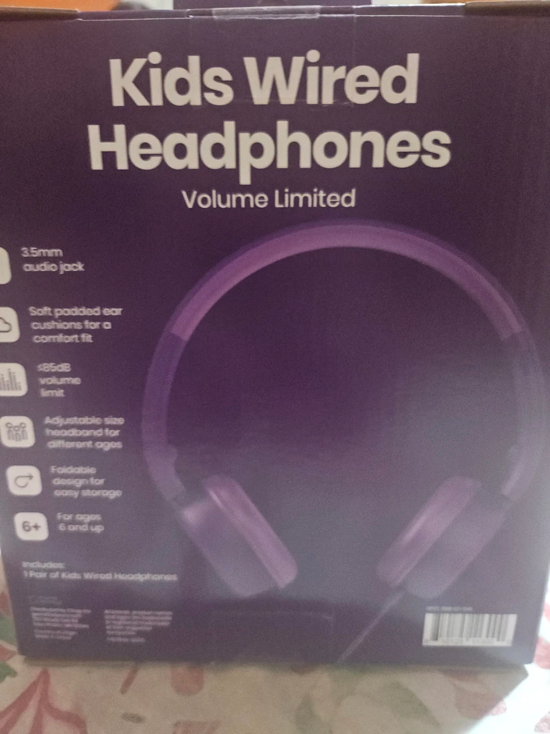 These kids' wired headphones come with a 3.5mm audio jack and soft padded ear cushions for a comfortable fit. They feature an adjustable size headband for different ages and a foldable design for easy storage. Volume is limited to <85dB for safety.