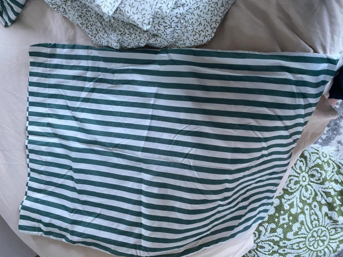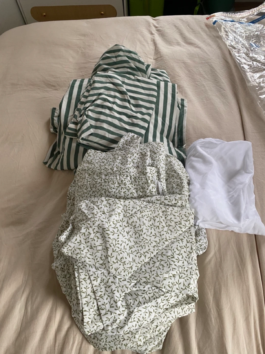 Two bedsheet set with two pillowcases ,featuring green stripes and a small green floral pattern. Pillow protectors white also included. For queen size beds ! Giving away for those in need not for resellers !!!! Pick up only ! Cleaned ! None smoker -no pets home ! Been washed cleaned in great condition