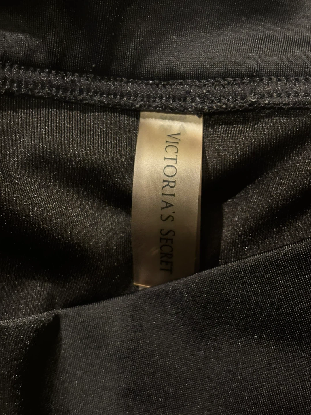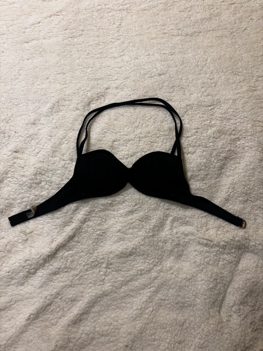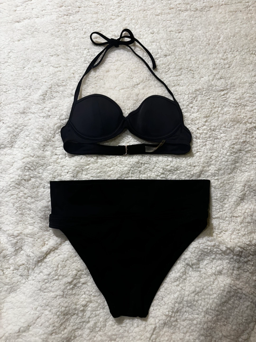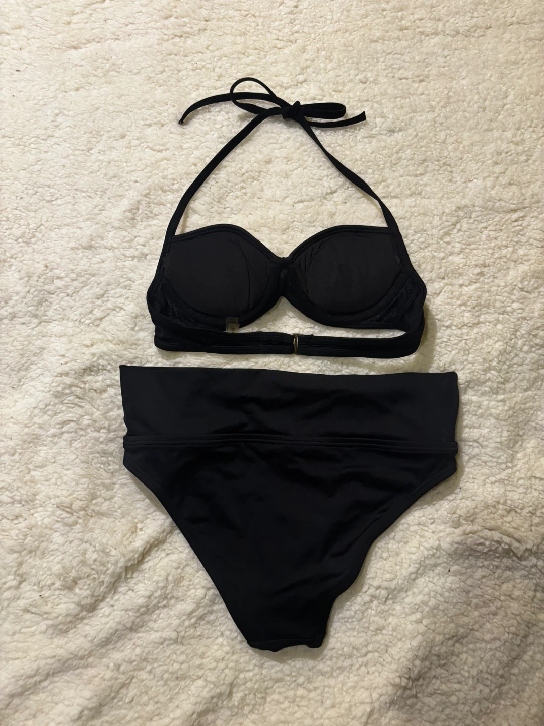Black bikini set from Victoria's Secret. Features a halter top with a hook-and-eye back closure and matching high-waisted bikini bottoms. Nylon and spandex blend.