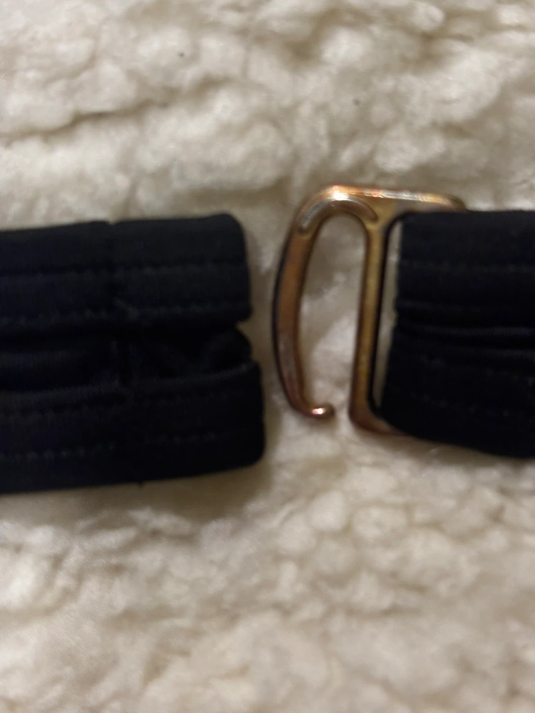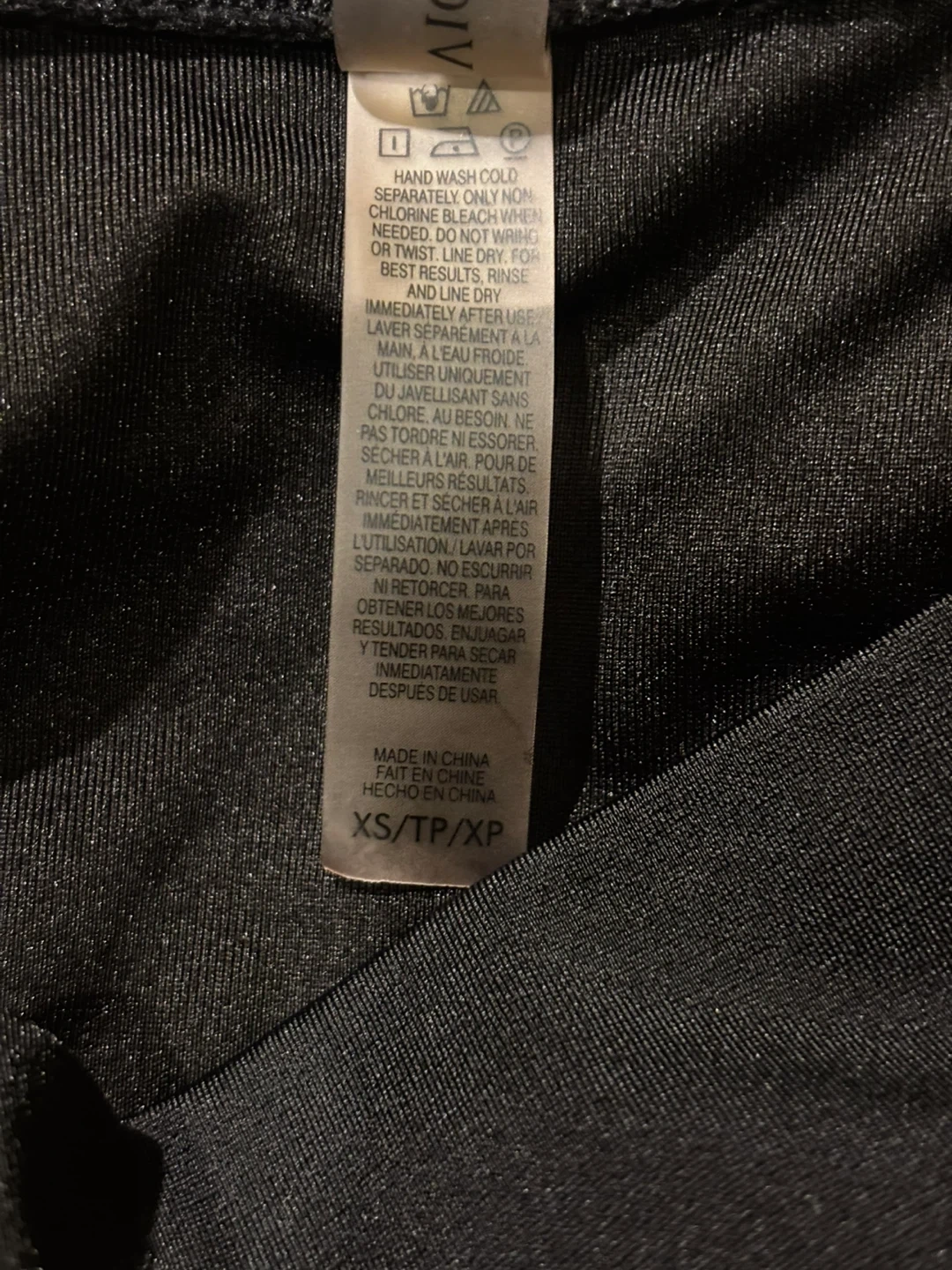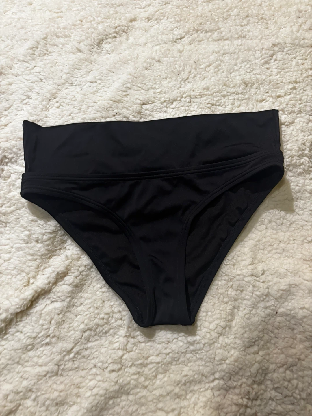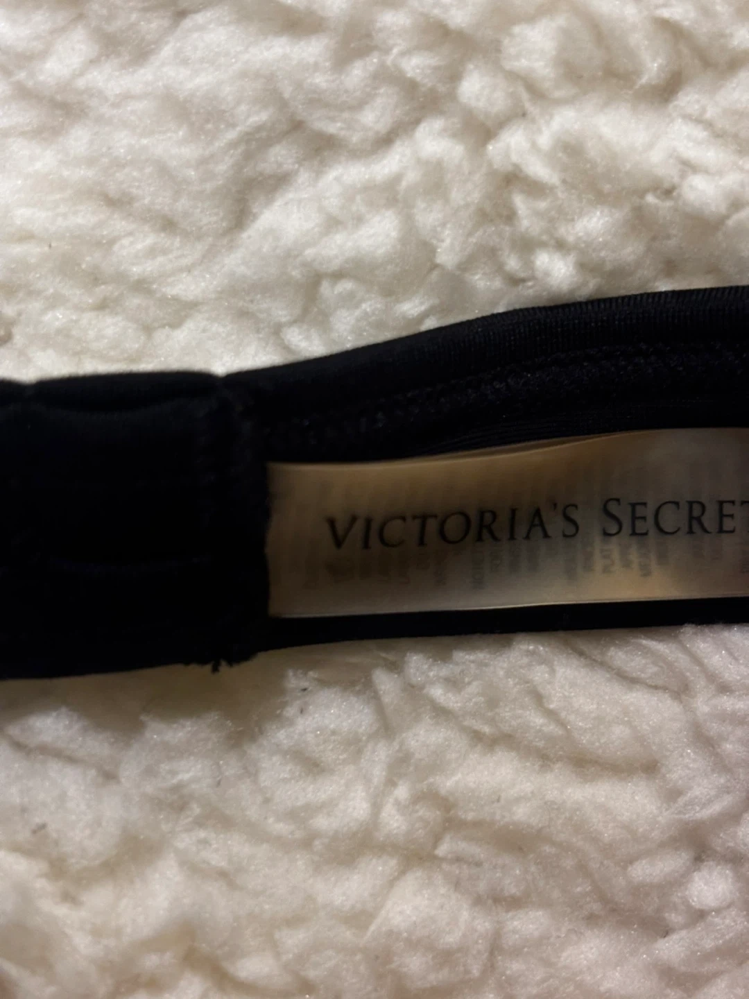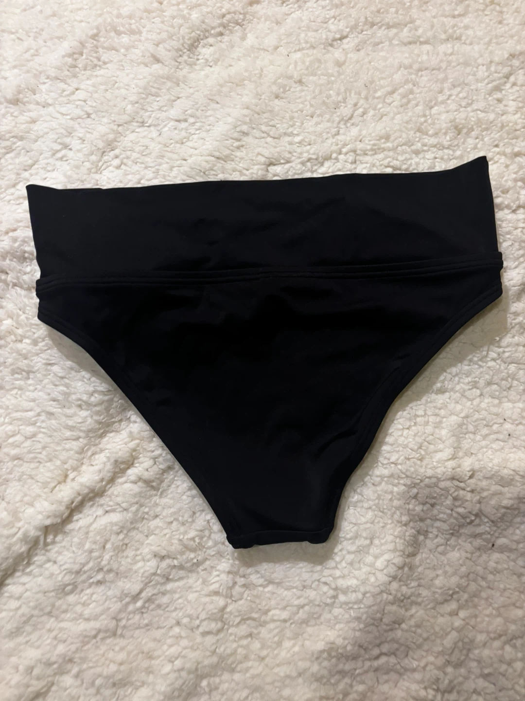 Black bikini set from Victoria's Secret. Features a halter top with a hook-and-eye back closure and matching high-waisted bikini bottoms. Nylon and spandex blend.
