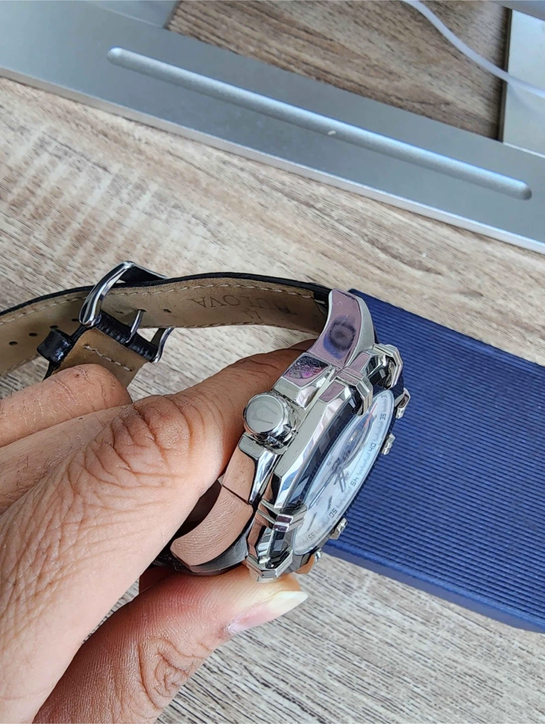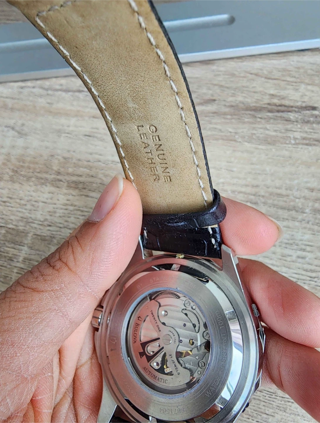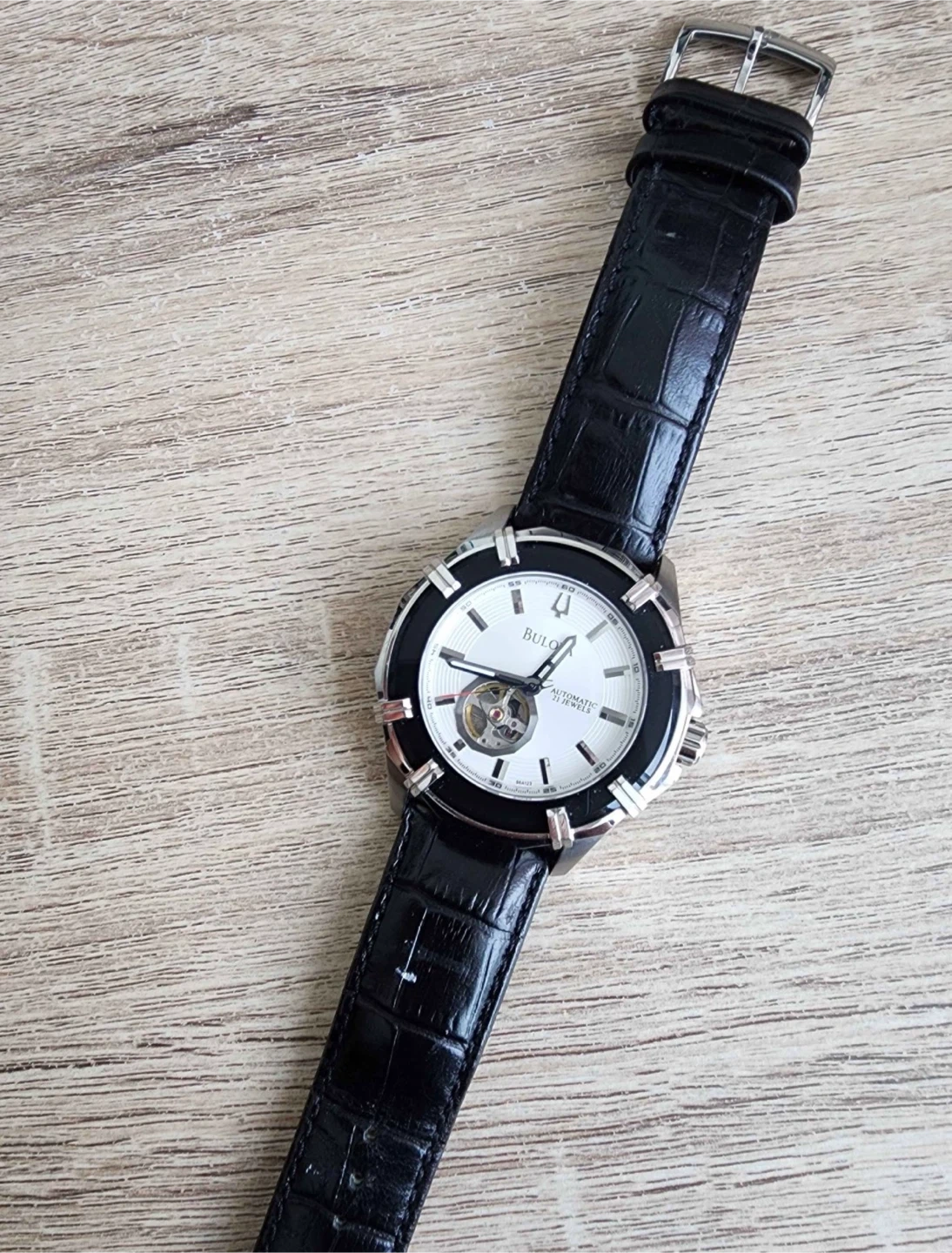 This is a Bulova automatic watch with a white dial and clear caseback showcasing the movement. It has a genuine leather strap and is water-resistant. A fine timepiece for any occasion!