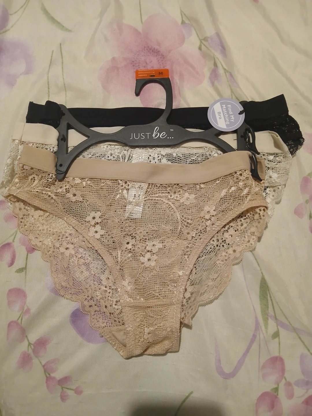 from Just Be. Includes beige, black, and white options. Size medium. Lace material with comfortable waistband.