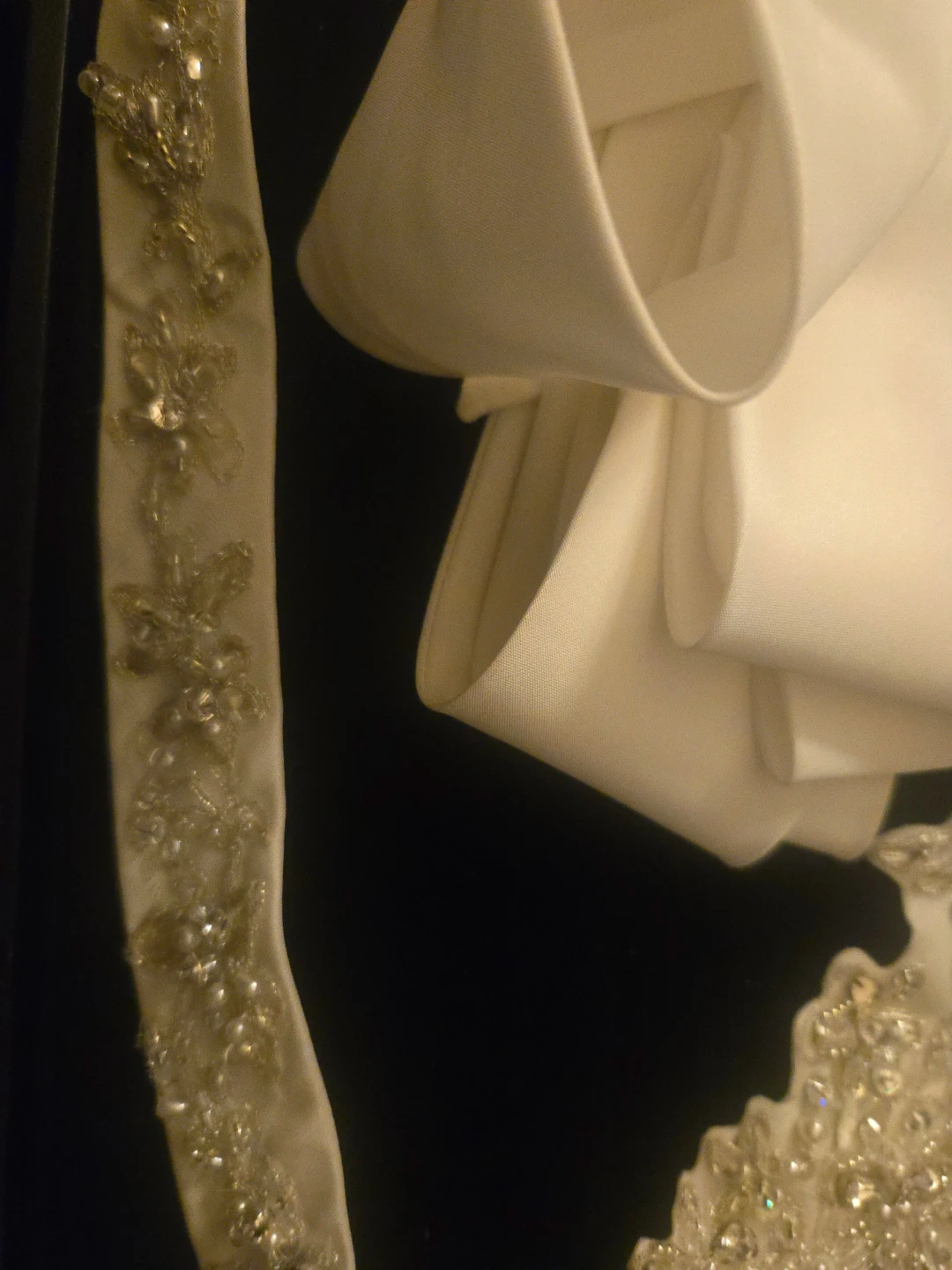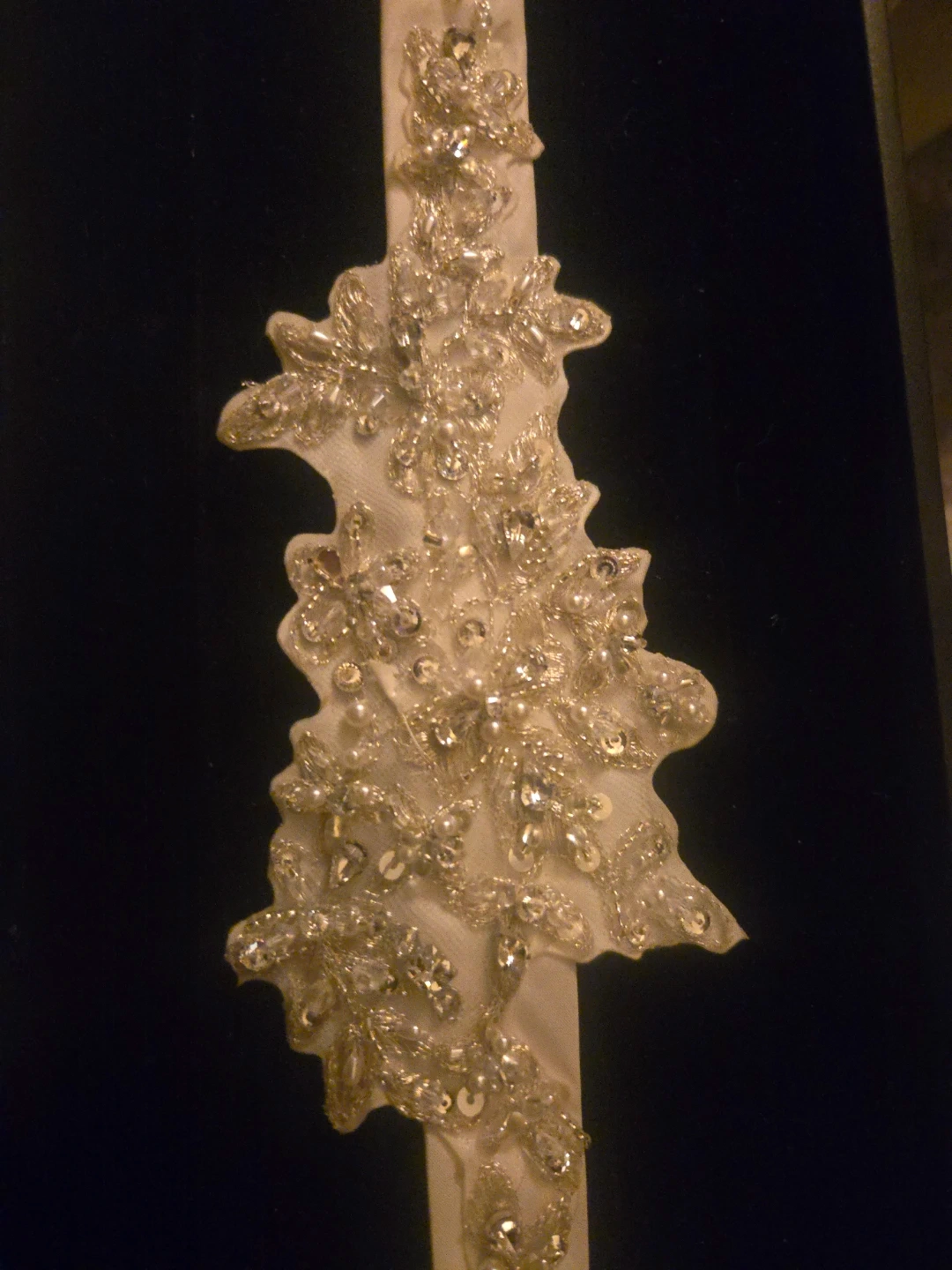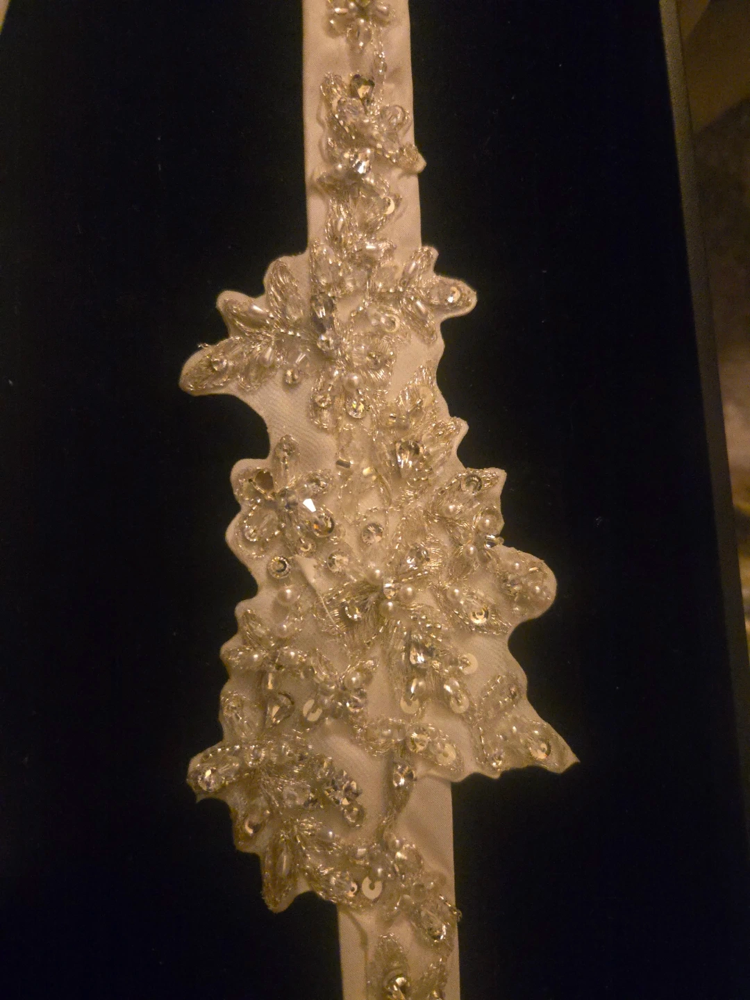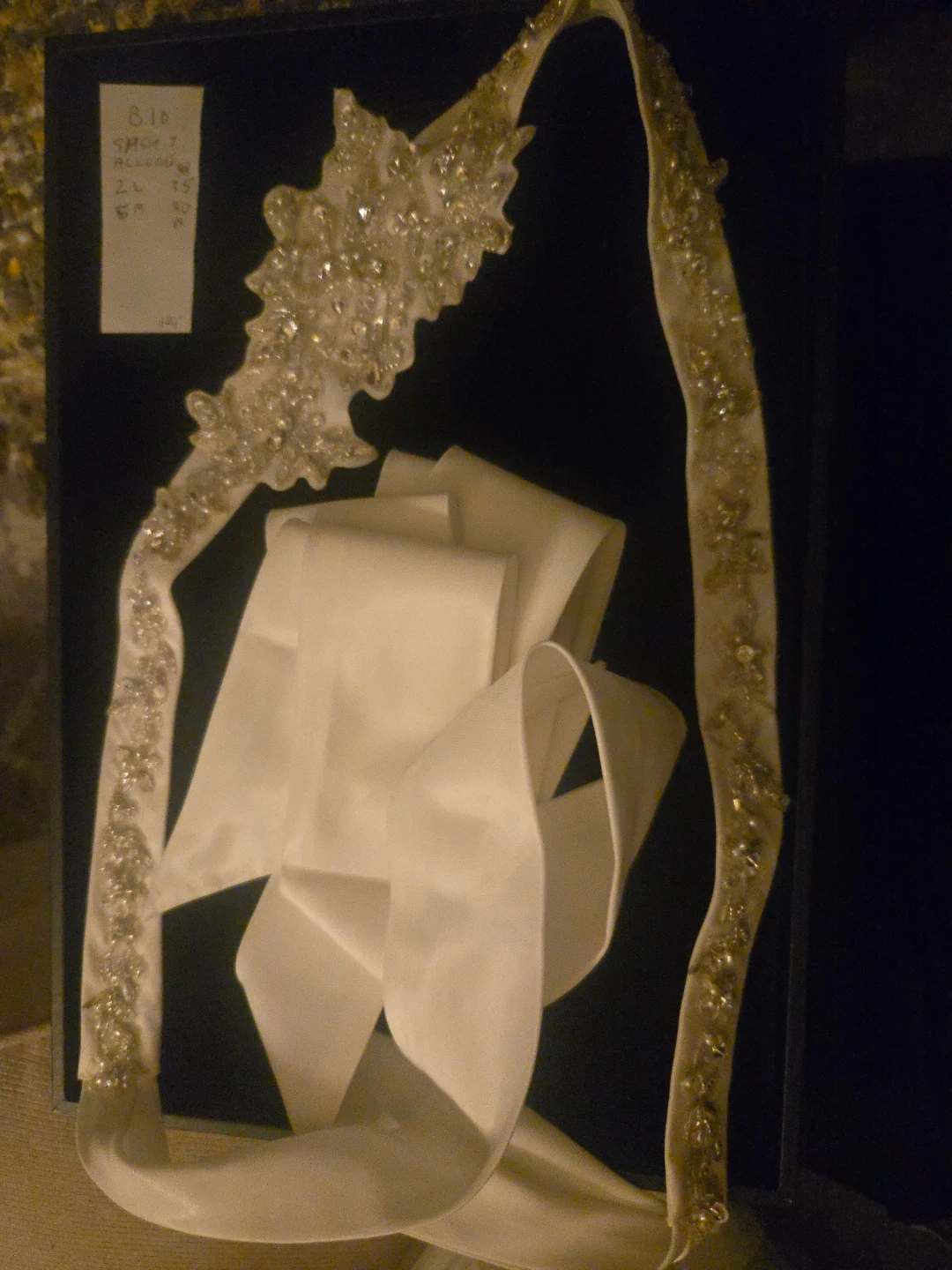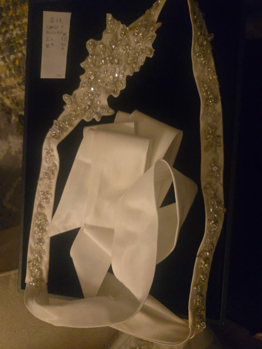This is a beautiful bridal sash with intricate beadwork and sequins on a satin ribbon. It's designed to accentuate a wedding dress. The ribbon is ivory and the embellishments are silver and pearl toned.