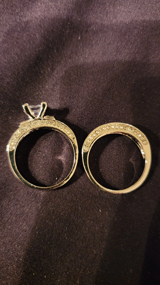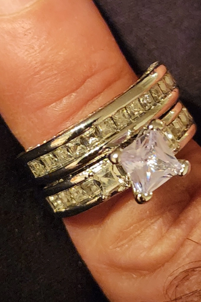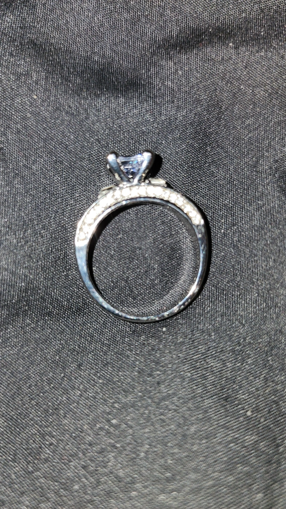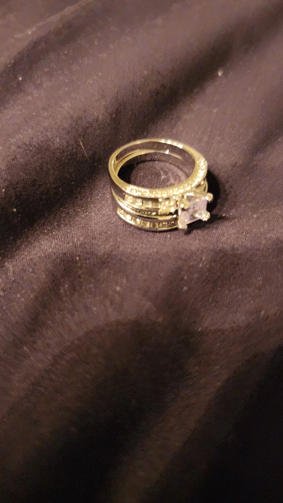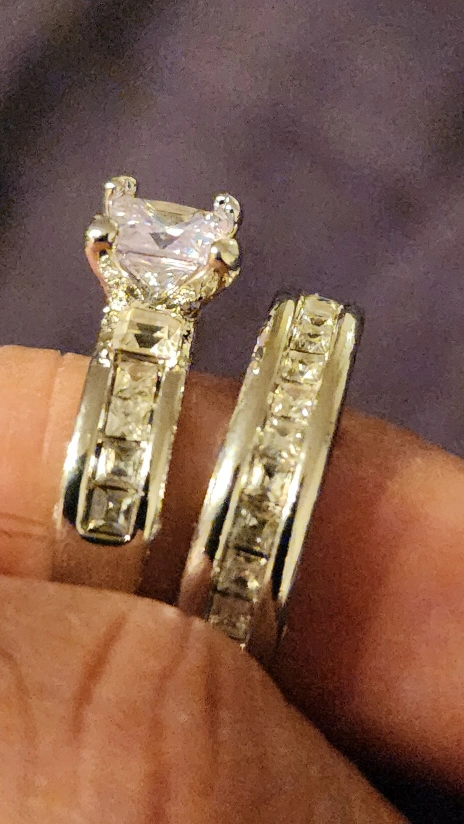 Cubic zirconia engagement ring set with a large center stone and a matching band. The center stone is square in shape. size 9 looks nice